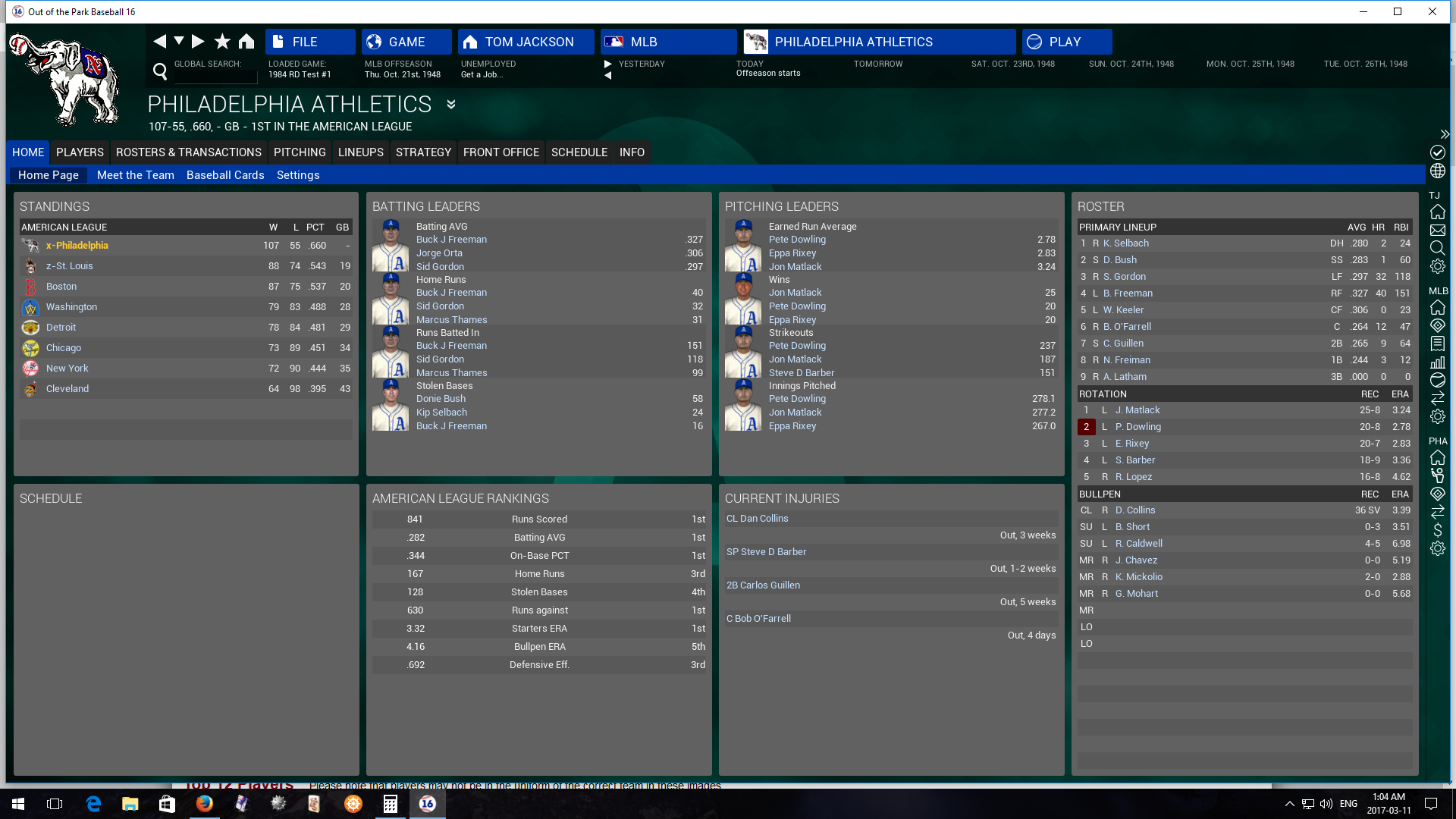Remember I don't manage any teams in this dynasty, so I didn't stack this team. The 1948 Athletics went 107-55 as a team in my random debut historical, scoring 841 runs and allowing 630 in a league where the run scoring environment was 4.33 runs per game across MLB and 4.49 in the AL. The interesting thing about this quartet of starters is that they are all left handed. They are: Jon Matlack (25-8, 3.24), Pete Dowling (20-8, 2.78), Eppa Rixey (20-7, 2.83), and Steve D Barber (18-9, 3.36). So this quartet went 83-32 (.722) with a 3.04 ERA in 132 GS. Given the difference in run scoring environments, it's quite possible this quartet had a better season, which is phenomenal when you think about it. Wow! Another interesting thing is that the Cy Young went to Corey Kluber, who played with both the Indians (64-98) and the Yankees (72-90) and went 21-10, 2.59 in 274.1 IP. Having a record like that on teams like that speaks volumes about the kind of season Kluber had. Had I been given more slots for Cy Young balloting, I would've gone: 1. Corey Kluber, 2. Jon Matlack, 3. Pete Dowling, 4. Eppa Rixey, 5. Mike Sirotka (another southpaw: 20-10, 3.00), 6. Steve D Barber, and 7. Phil Knell (yet another southpaw, it's a golden age for them and it's about to get better with Koufax: Knell went 17-14, 3.36), also of the Yankees. Four of the top six slots on one team, yet they don't get the award. Oh well, Buck J Freeman won the triple crown on the hitting side and took the MVP and Steve D Barber was ROY, so they did OK, plus they won the most important prize of all: the World Series. In fact, it was eerily reminiscent of your 1984 Tigers David Watts. 1st place in the AL by 19 games, and an 8-1 postseason while outscoring the poor Browns and Phillies by a combined score of 56-14. I've never seen anything like it that I can recall in this game. Throw in Rodrigo Lopez' 28 GS and 16-8 record (with a putrid 4.62 ERA), and the other two pitchers that picked up two starts without a decision, and you have a quintet that went 99-40 with 2 other starters with no record. I suppose that means the bullpen went 8-15, so they have something to improve on this offseason.
