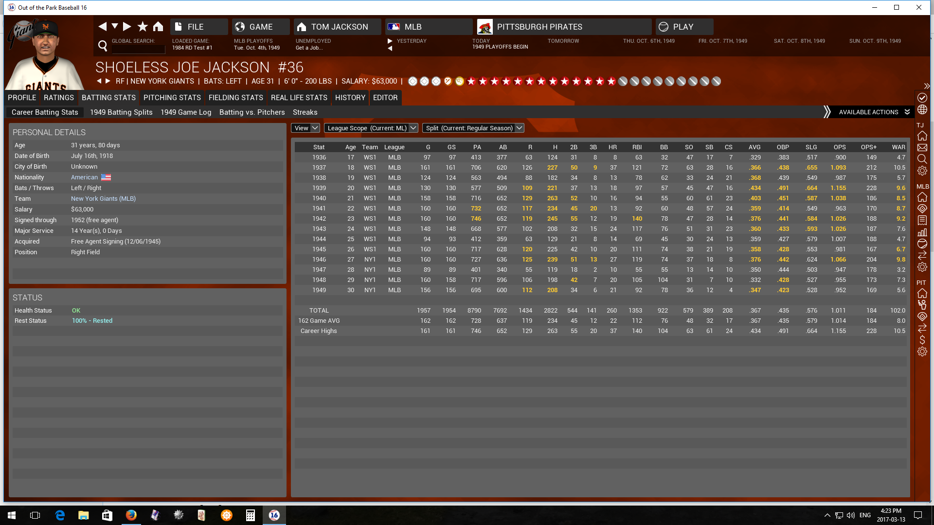 In OOTP16, you can get around it manually (also a PITA) by deleting the players and bringing in the same player at age 18 or 19 via the Spritze database which works very well with 16. You have to know what you're doing, but once you get the hang of it, it's pretty routine. Let me know if you want instructions for that if you want to try it. I just imported a Negro Leaguer who never made it to the big leagues (Lee Moody), and I've got PCL guys, Japanese guys, and Korean guys who never played in the big leagues as well. This method will also allow me to delete the 40-whatever year old Satchel Paige whenever he shows up, and bring in the teenage version via Spritze which should be cool. Already did this for Elston Howard, Billy Harrell and Lou B Johnson, who all showed up in this draft (1945). I use a random number generator and the master list from Spritze to determine what non-MLB guys come in, but when I'd had no Negro Leaguers for 44 drafts, I decided to hold out until I got at least one. Wish I'd done it sooner, but I had too much faith that my method would work. Moody's not very good unfortunately, but I'll bring another one in next year and in each subsequent draft and eventually two when expansion happens. Can't wait to see Josh Gibson, Oscar Charleston etc etc but I'll always take whichever ones the random number thingy gives me because it's a random debut historical after all. I'll just hold out for Negro Leaguers for one of my extra draftees, two if there's lots of teams. Don't want too many because I have a five round draft with sixteen teams and I add two from Spritze, so that's 82 players and that is plenty. I'm not sure how this would work with OOTP17 because I love my league so much that I've stayed in OOTP16. I don't want to mess it up by exporting/importing it, and I'm not sure what would happen to the random debut thing if I did export/import this now 45 year old league. Would it start bringing in players who have already been through my league because it's a different database? I don't want to find out the hard way that this would happen. I'm also not sure about you starting with two teams and then expanding to sixteen. That is a huge amount of expansion and it might bork your game, which I suppose is OK if you don't mind starting over. It just seems like too much to me, but I could be wrong. I don't mind the whole starting at 30+ year old player thing because what you'll find is that other players can come out of nowhere to become superstars and potentially HoFers. Some 2B named Tillie Shafer did this in my league and went to the HoF. Yes it's maddening to have favourite players come in needing a walker to get to 1B, but you never know who's going to step up and who you're going to discover from history. I use 3-year double weighted recalc and Neutralized Stats in all of my games with "Remaining Years of Career" for Potential Ratings. I also base Rookie Fielding Ratings and Pitcher Stamina on 3-year periods. Finally, I use the Player Development System at default settings in conjunction with recalc. This is critical if you want the Tillie Shafers of the world to emerge. Remember as well that if you started with all 18ish year olds in your random debut or even players at their actual debut dates, guys might not retire as quickly as they will if the ages are randomly (there's that word again) dispersed. By having my five round (plus two players) draft, I have about the right amount of players. There are about 50 or 60 free agents hanging around at any one time during the regular season. You want that cushion for injuries (which I have set to High (Realistic Modern Day)), but you don't want too many free agents because then guys aren't playing. Believe it or not age 30+ and 40+ guys in the inaugural draft is a good thing because it keeps the line moving in your league and allows for a natural churn of talent to occur. Without enough guys retiring, things get awfully crowded in the free agent bin, and then guys don't play. You want to get as many guys as possible into the game because that's what they're there for. I think I've got about an 83% rate of drafted players coming into my league and getting at least the proverbial Cup of Coffee. You're never going to get 100% because some guys are just too crappy. I hope I haven't overloaded you with info. This post has gotten quite long and feels a bit disjointed, so I hope you can get something out of it. Whatever way you decide to go, I hope you enjoy your random debut historical because in my mind it's the best way to play historical and perhaps is OOTP's best kept secret. Enjoy it, and fire away with any questions you may have. OOTP is a great game, but it is complicated, with many moving parts, and it helps to have people who've fumbled (and fumbled and fumbled) around with settings over the years to help you figure out what you want to get out of it.