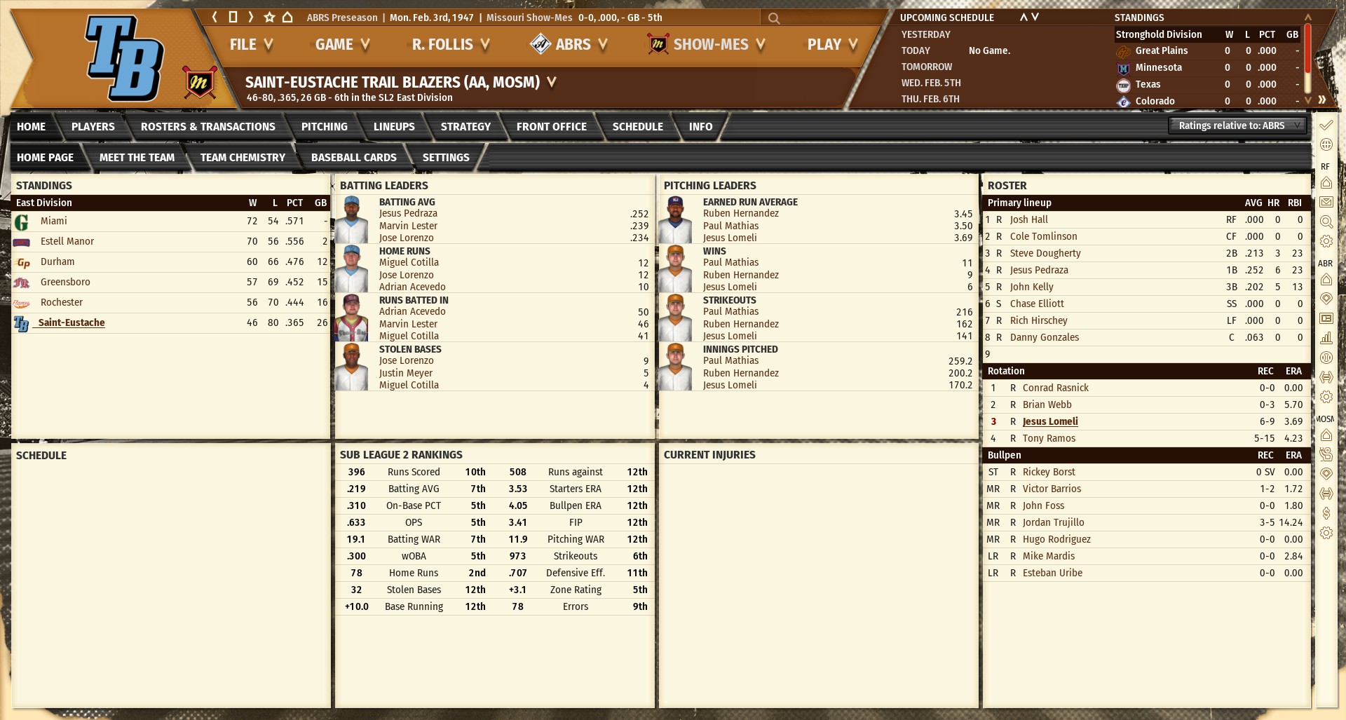 Here are the promised screenshots to hopefully be able to finish the current introductory process for the Missouri Show-Mes organization, at least for now, everyone. The New Orleans Bayous organization will be the fifth of the likely 78 main teams in this particular dynasty that I will likely introduce you all here to at least some degree, if my math is correct at the present time. It may not be as in-depth of an introduction as the one for the Show-Mes organization has been so far, because of the fact that Missouri has a human GM/Manager person here, of course, but hopefully it will suffice here well enough for those of you from that part of the United States and all.