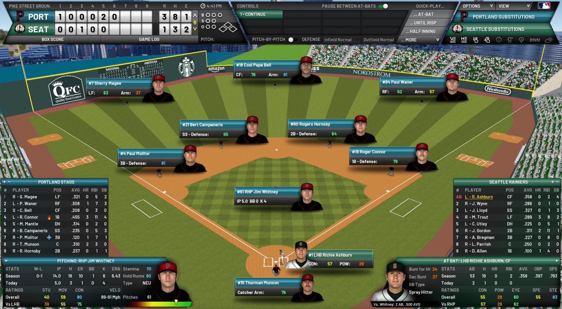 Tonight the Seattle Rainiers play host to divisional rivals Portland. The two teams played out a fantastic game last night, with the home team sneaking by 4-3 thanks to a walkoff RBI double by backstop Lance Parrish, and they do match up very evenly on paper so I’m expecting another tight one this evening. Tim Keefe on the mound for the Rainiers while the Stags are going with Jim Whitney. Neither has exactly set the league on fire so far, something I’m sure they’ll be keen to change tonight. Seattle struggled early, but are riding a 4-game win streak including a sweep of New York that has got them back to .500 ball. The Stags are at 4-9 and certainly playing better of late after losing their first four of the season. Before we get started, our field reporter Juliana Scott is down in the Rainiers dugout with manager, Lou Piniella. Juliana, over to you. Juliana Scott: Thanks Nik. Appreciate your time, Lou. A slow start, but 4 wins on the trot now and your squad looks to be coming together nicely. What do you think has been the difference over the past few games? Lou Piniella: Oh, no doubt, we’ve pitched better. We’ve only given up 10 runs in those four wins and when you do that you’ll usually come out on top of more ballgames than you'll lose. JS: Just 43 runs scored in 12 games, lowest in the league--you can’t be too happy about that. LP: No, that’s certainly an area we have to be better in. Trout and Gordon have been good, Ashburn as well, Lloyd is really looking promising. But a few of the other lads have been slow off the mark and our hitting in the clutch has been poor so far, which means we’ve left a lot of runs on the deck and lost a couple of games we should perhaps have won. But it’s a young group all new to this level, so we always expected some teething problems such as these across the board. JS: Last night’s game was scoreless thru 8 and then you fell behind 2-0 in the 9th. How did you get the group to regather after that and get the win in dramatic fashion? LP: We felt we’d been unlucky not to score a couple of times and, as I said, we just weren’t delivering at key moments. But we knew we were far from out of it and I was really proud of how the guys lifted to get us home in the end. Lance’s at-bat that resulted in the walkoff run was more along the lines of what we’re looking for. He hung tough, fouled a couple off, and then got his pitch and drove it. JS: You’ve got Tim Keefe pitching for you tonight, tell us a bit more about him. LP: I doubt Tim will win many strikeout titles, but he has excellent control and won’t give up too many homers. He’ thrown too many straight down the pipe in his starts so far, and in this league that will get you treated the way he was. So we’ve been working on him mixing his pitches up and staying ahead in the count so he can nibble a bit more and pressure the hitters into false swings. Hopefully that’ll show tonight. If he can get his changeup working the way we know it can he’ll be a different pitcher altogether. JS: And what do you know about his opponent, Jim Whitney? LP: Only that I hope he pitches tonight more like he did in his first game than his last one (laughs). From what we can tell he’s not too dissimilar a pitcher to Tim in a lot of ways. Not overpowering stuff, but will wear hitters down with good control and a decent array of pitches. We’ll be looking to attack him early in the count because if he gets ahead of you then he’s tough to beat. JS: Just before I let you go, you mentioned this is a new, young group – what have you found to be the most challenging aspect of managing them so far? LP: We know we have a good bunch of ballplayers, but we also know they are raw and will take time to come on as we expect, to gel as a unit. But really for mine, the toughest thing is getting them all enough game time while still using each player in the right situation so that we have the best chance of winning games. That will become easier as we all get to know one another better, but until then it’s something we’ll have to keep close tabs on. JS: Great, Lou, thanks again for your time and all the best for tonight’s game and the season ahead. LP: No problems Juliana, any time at all. Thanks Juliana, and of course thanks to Lou. OK, after this quick word from our sponsors we’ll be back with the first pitch. TOP 1ST A messy start for the home side as Portland scores an unearned run after Gordon makes a two-out error and Mantle singles it in. Portland 1, Seattle 0 BOTTOM 1ST The Stags return the favour when, after Ashburn leads off with a double, an error by the 3B Molitor puts men at the corners with none out. Lloyd fails to bring in the run, hitting into a fielder’s choice, and then Magee ends the threat by taking a flyout from Trout and turning it into a double play at home. Lou Piniella won’t be impressed with that missed opportunity. TOP 2ND No dramas for Keefe in a 1-2-3 inning. BOTTOM 2ND Whitney retires them in order. TOP 3RD Nothing doing for the Stags. BOTTOM 3RD Parrish leads off with a hit and scores on a two-out double by Jim “The Toy Cannon” Wynn. Portland 1, Seattle 1 TOP 4TH A red-hot Roger Connor starts the inning off with a single, and another one by Mantle moves him to second. Keefe strikes out Campaneris for the first out of the inning, but then Connor swipes third to put him right under the pump. A popout by Molitor eases the pressure somewhat and he gets out of the jam when Parrish grounds out. BOTTOM 4TH Whitney with a three-up, three-down inning. TOP 5TH More struggles for Keefe. Rajah Hornsby leads off with a single and ends up at third when a caught stealing attempt by Parrish ends up in the outfield. This time, he can’t escape unhurt as Magee singles the runner in. Waner bunts him over to second and then Bell doubles to extend the visitors’ lead. A Mantle single leaves men at the corners with two outs, but Keefe ends the inning with a flyout. Portla