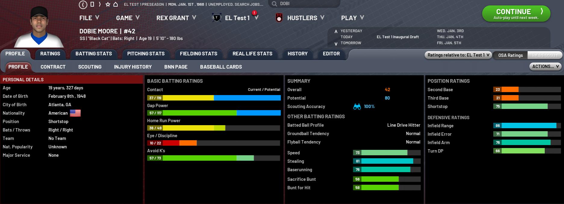 Reportedly Satchel Paige's favourite catcher and Riley talks up his defence while SH rates him poorly. I, as I usually do in cases like this, have split the difference. Also played a bit in both corner OF slots, but not all that well.
