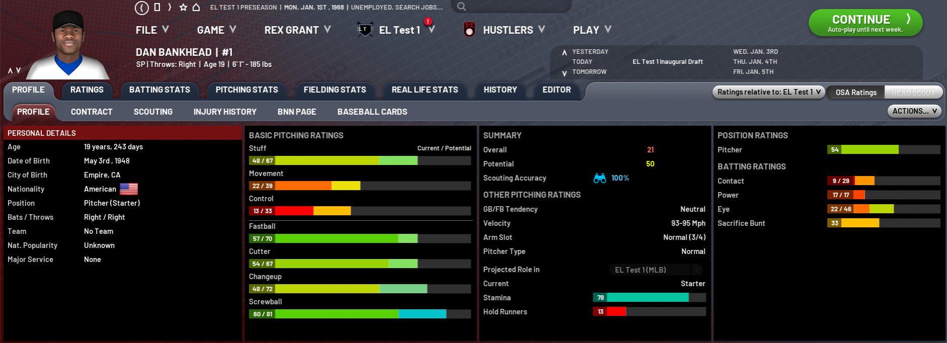 One of the few who gets both hitting and pitching MLEs, Bullet was always first and foremost a pitcher, but hit well enough to be used as a position player - mainly in the OF - on his off-days. Actually pretty comfortable with his previous ratings and have made little change to this final edit other than the slight markdown he gets from the MLEs.