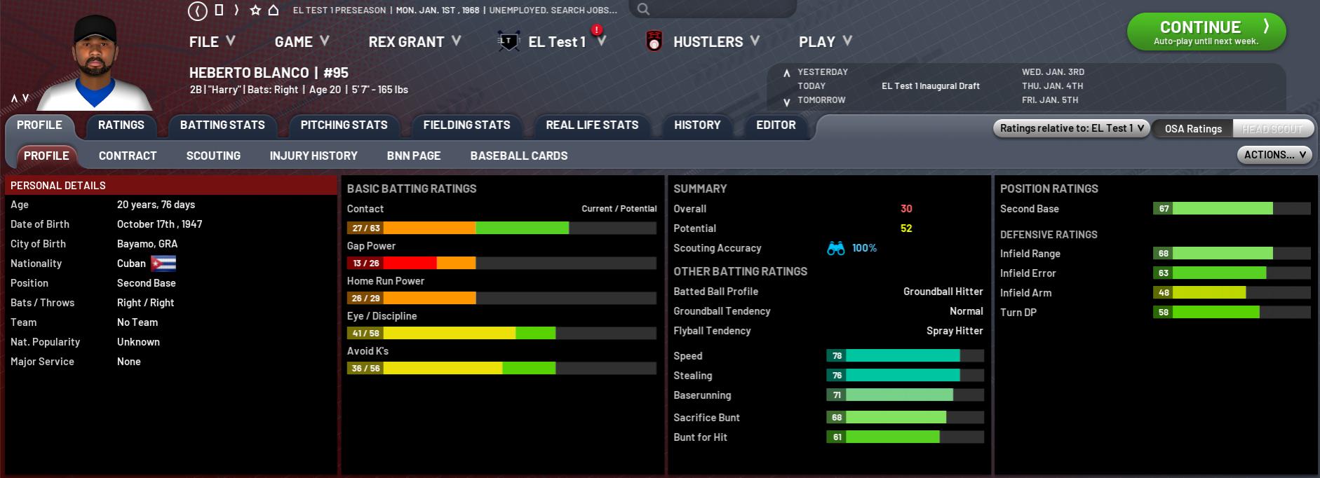 Agustin was a fleet-footed OF who played almost all his career in Mexico, where he is enshrined in the Hall of Fame. Super quick and an excellent LF. MLEs were kind to him so I've kept his POT at 105% and given him a long dev path as he is just 19 at import.