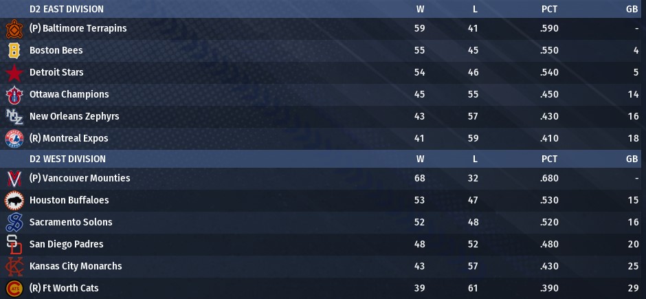 Below that top three is Monterrey, who spent much of April and May hovering in second or third place but has dropped to an even 23-23, six games back. Greg Allen and Chase Maze have been the only bright spots in an offense that has crumbled, with SS Tyler Duncan taking a huge step backward in his age 25 season. The pitching staff has been quite good, behind only LA in runs allowed at rotation ERA, but it is full of guys who are having career years to this point, and there’s likely to be some regression there. Tijuana, similarly, has a struggling offense, despite an exceptional start by 3B Randy Wright (.331/.391/.649, on pace to shatter his career best in every offensive category) and free agent acquisition Aaron Felton, who - while showing signs of age - is still putting up a 144 OPS+ largely from the DH spot. But aside from closer Ed Coffer, the pitching staff has been abysmal, with a rotation ERA of 5.45 and the second most runs allowed in D1. They’re topped in that category only by the dismantled Denver Bears, who conducted a firesale in the offseason and are now headed for a potentially historically bad season at 13-33, already 16 games out of first. 1B Donvan Bryant leads D1 in homers and is on pace for an outstanding season, but he’s working mostly alone.