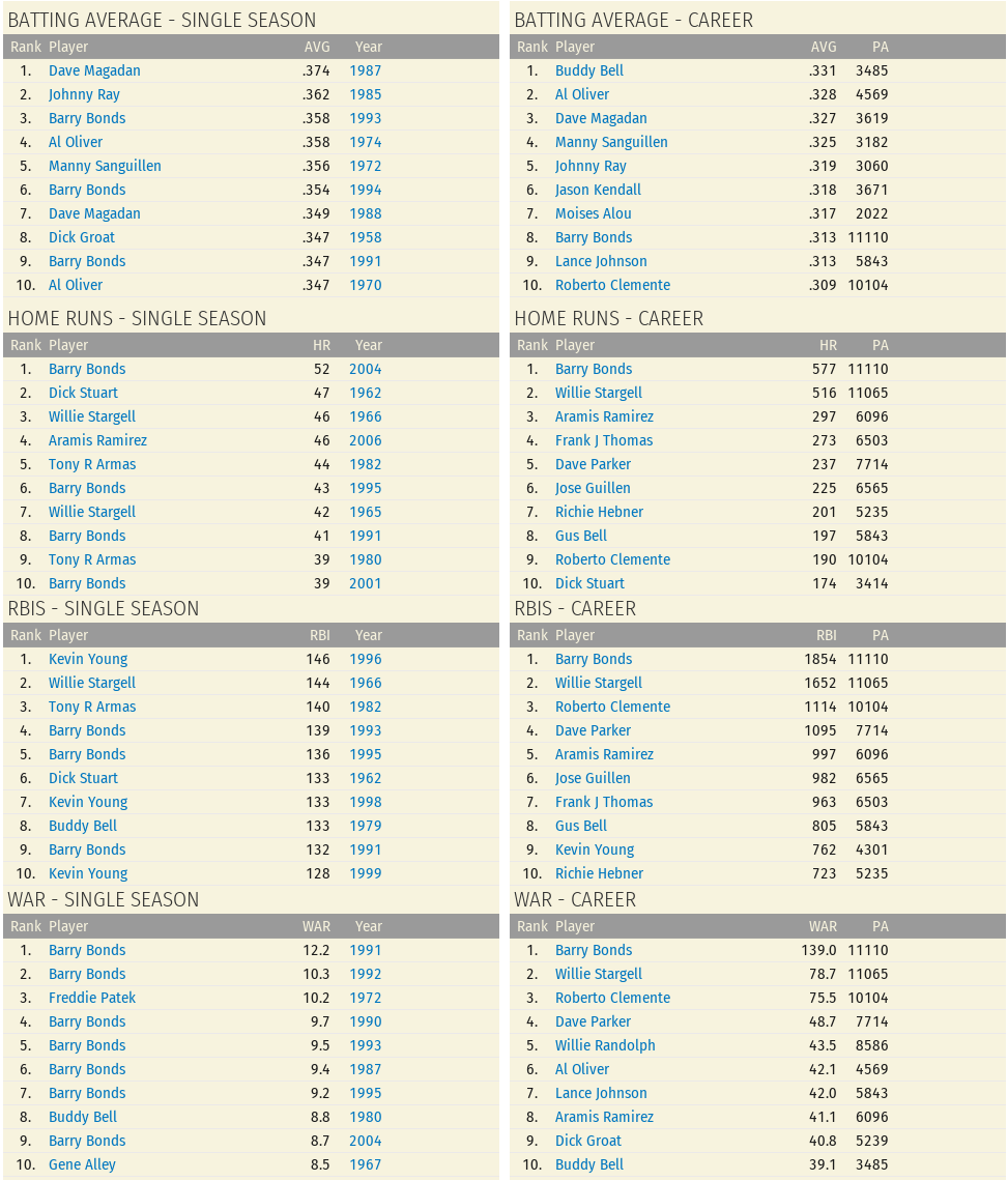 Pirates all time leaders with history starting in 1951. I'm surprised that the vast majority are real life Pirates. One of the unavoidable problems of historical play is my familiarity with the Pirates players means I know who not to trade away.