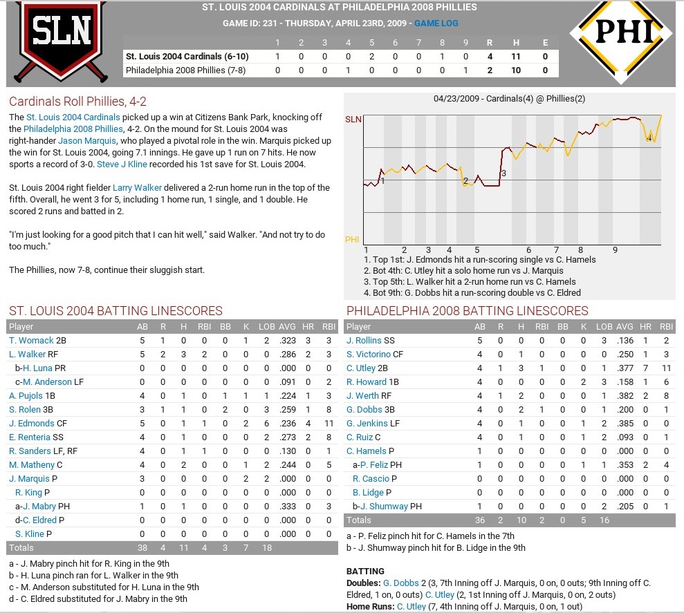 Rec/Std: 8-11, 5th, 5 GB Pittsburgh W: Condrey 2-1, 5.23. L: Kline 0-1, 5.63. Sv: Blanton 1, 3.38. HR: Sanders 1, Pujols 2, Victorino 2 (3), Rollins 2. Player of the game: Shane Victorino 3 for 4, two home runs, three runs scored, two RBIs. |