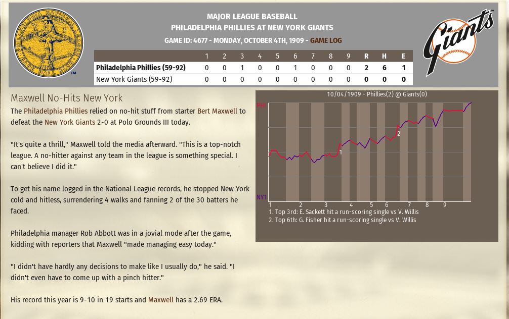 1909 By The Numbers New Records Games: 154: Tony Smith (Boston Red Sox) Hits Allowed/ 9 innings: 5.51 Doc Adkins (St Louis Cardinals) Opponents AVG: 0.177 Doc Adkins (St Louis Cardinals) Opponents OPS: 0 441 Doc Adkins (St Louis Cardinals) Accomplishments John Knight (Brooklyn) hit for the cycle Ed Walsh (Boston Doves) and Bert Maxwell (Philadelphia Phillies) both toss no hitters Walter Johnson (Washington Senators) Pitching Triple Crown George Van Haltren (Washington Senators) 3500th hit Jack Powell (Cleveland Naps) and Christy Mathewson (Washington Senators) 250th win Rube Waddell (Brooklyn Superbas) 2500th strike out The Slam File Code: April 20th 1909 John Knight (Brooklyn Superbas) April 28th 1909 Ed Konetchy (St Louis Browns) May 7th 1909 Fred Beck (New York Highlanders) June 11th 1909 Heinie Zimmerman (Boston Red Sox) Walk off June 27th 1909 A Spanton (Cleveland Naps) July 23rd 1909 Jack Berry (Pittsburgh Pirates) July 30th 1909 Art Fletcher (New York Highlanders) August 17th 1909 Dixie Walker (Boston Doves) Pitcher August 23rd 1909 John Hummel (Cincinnati Reds) August 24th 1909 James Johnson (Cleveland Naps) August 25th 1909 Tim Jordon (Pittsburgh Pirates) October 4th 1909 Joe Birmingham (Boston Red Sox)