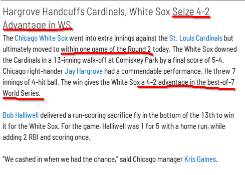 Some team can take a 3-2 advantage in a 5-game series, move within one game of the "Round 2" when there is no Round 2. Similarly, some team can take a 4-2 advantage in the 7-game World Series, move within one game of "Round 2". |