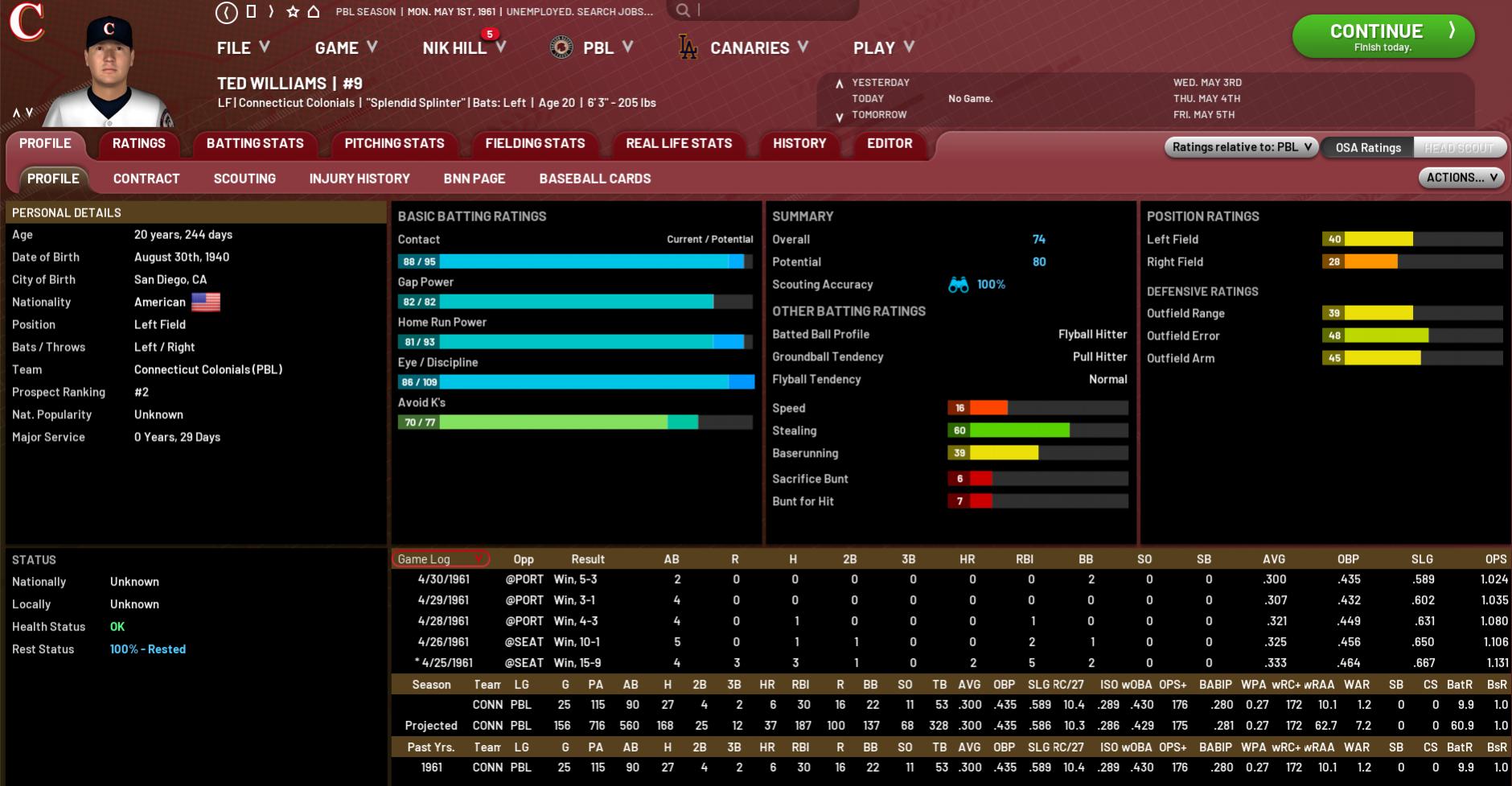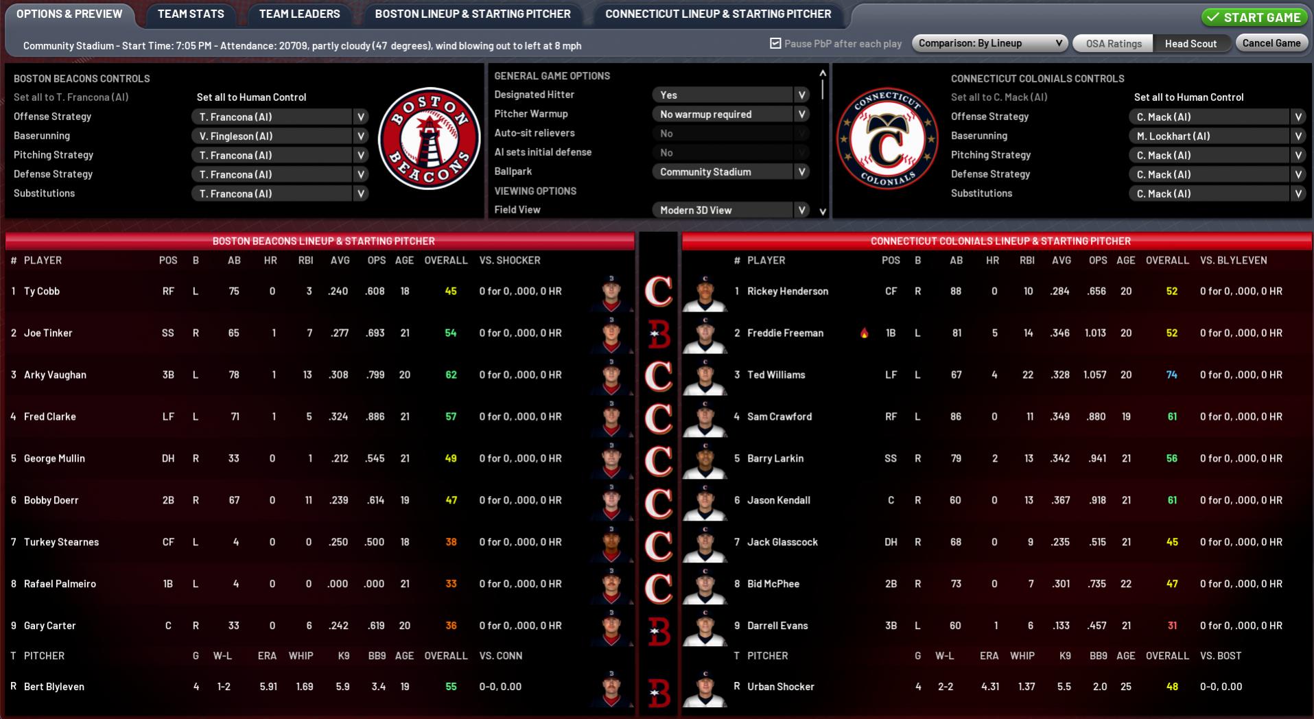 Community Stadium – Hartford, CT; 7.05 pm BOST: Bert Blyleven (1-2, 5.91) SEAT: Urban Shocker (2-2, 4.31) Hello and welcome to Community Stadium for our Game of the Week telecast, tonight featuring two North Division rivals in the Boston Beacons and the Connecticut Colonials. It’s a bit overcast tonight here in Hartford, but I doubt there’ll be any rain, and there’s just a slight breeze favouring the hitters. A fascinating series so far, with the home side squeezing past the visitors in a couple of close ones. I’m sure the boys from Boston won’t want to leave their swing here empty-handed, so I don’t see much chance of this one being anything different. The Colonials sit stop the division at 12-8, three games ahead of the third-placed Beacons and will be keen to stretch that advantage with another win tonight. A couple of real tricksters on the mound this evening, with Bert Blyleven going for the Beacons and Urban Shocker getting the call for the home side. Don’t expect many strikeouts in this one, and both sets of defensive units will have to be at the top of their games as they are sure to be kept busy tonight with lots of balls getting put in play both on the ground and in the air. Tonight’s first pitch isn’t far away but, before that, here’s Juliana Scott down on the field with one of the home fans’ favourites. Juliana, not even a month into the season and apparently this young man has already picked himself up a “splendid” new nickname. What can you tell us about that? Juliana Scott: Thanks Nik. Yes, I’m down here with star Connecticut outfielder Ted Williams, or as his teammates apparently have started calling him, “The Splendid Splinter”. Ted thanks for talking to us, what can you tell us about that? Ted Williams: Hi Juliana, yeah I guess the guys think I could do with a few more pounds. I like the “Splendid” part. Let’s face it, it’s better than “The Stupid Splinter” or some of the nicknames a few other boys have gotten lugged with. JS: Oh, really? Care to share? TW: Oh, no, ma’am – not too many of them are fit for TV (laughs). JS: Fair enough then. You’re a California native, how are you enjoying the East Coast and New England in particular? TW: Love the people here, they’re real friendly – especially when you’re doing OK on the field (laughs). But the weather’s a bit of a shock to the system, I’ll tell you that for nothing. Wouldn’t mind it a few degrees warmer, especially at night! But thankfully the way the league’s set up means I get a few chances every season to head home, see the folks, enjoy the sunshine, which is nice. Makes living away from home just that little bit easier. JS: A couple of close wins in this series so far – how’s this New England rivalry coming along? TW: Yeah, it’s pretty spirited already, and how this series has played out has certainly helped it along. Give it another few games and series along those lines and it’ll only make it more intense. I like it, gets the juices flowing for competitive types like me. JS: Those two wins have got you into first place in the North Division, are you guys happy with how you’ve started the season. TW: Yes and no. I mean we’re happy to be at 12-8 and on top of the division, even at this early stage. But we all know we’ve been way too hot and cold. “Streaky” I believe one of you media types called us and, for once, that’s pretty close to the mark (laughs). So we’re looking to be more consistent, that’s for sure. JS: Yourself and young Freddie Freeman seem to have forged a strong partnership in the top third of the lineup. He’s certainly benefitted so far from having you hitting behind him meaning he’s seeing a lot more pitches than he might otherwise. TW: Oh I don’t know about that – he’s a bit more dangerous with bat in hand than I am at the moment (laughs)! I think you’ll find that it’s me who’s benefitting from him being on base so often to distract the pitchers. He’s a great hitter and we look forward to many years working in tandem, hopefully like we’ve been able to do so far this year. JS: Well it's certainly working well to this point. Finally, Ted, as you start out, what are your goals and ambitions career-wise? TW: Same as every other feller in the league, I reckon. Be the best player I can be, both for myself and for the ballclub. Come up with the big hit, the big play, whatever helps the team win. But also, if Mr Mack tells me to lay down a bunt then I can assure you, even though I’m not very good at it, I’ll be trying to lay down the very best bunt I ever have. Sure don’t want to get in Mr Mack’s bad books (laughs). Any individual stuff is fine as long as it happens in the course of my contributing to the team. JS: Great, thanks Ted, hope you have a good game tonight. TW: Thank you ma’am, much obliged, I’ll do my best. Thank you, Juliana, I do think that young man is one to watch out for – he looks pretty special to me. OK, a quick station break and we’ll be off and running. TOP 1ST A hit but nothing more for Boston. BOTTOM 1ST Henderson leads off with a double and Colonials manager Connie Mack gets aggressive, calling for a steal of third. But it backfires as Henderson is cut down by Carter and, in the end, the home side goes scoreless. TOP 2ND The visitors strike first when Mullin leads off with a single, advances to second on a wild pitch and scores on a two-out single by Carter. Another single by Cobb gets the Beacons a second run and yet another by Tinker adds a third, before Vaughn lines out to end the inning. Just the start I’m sure Boston skipper Terry Francona would have been after. Boston 3, Connecticut 0 BOTTOM 2ND That early setback on the basepaths doesn’t deter Mack one bit, as Larkin steals both second and third after getting aboard on a fielder’s choice. Catcher Jason Kendall then singles him in to get the home side its first run. Boston 3, Connecticut 1 TOP 3R