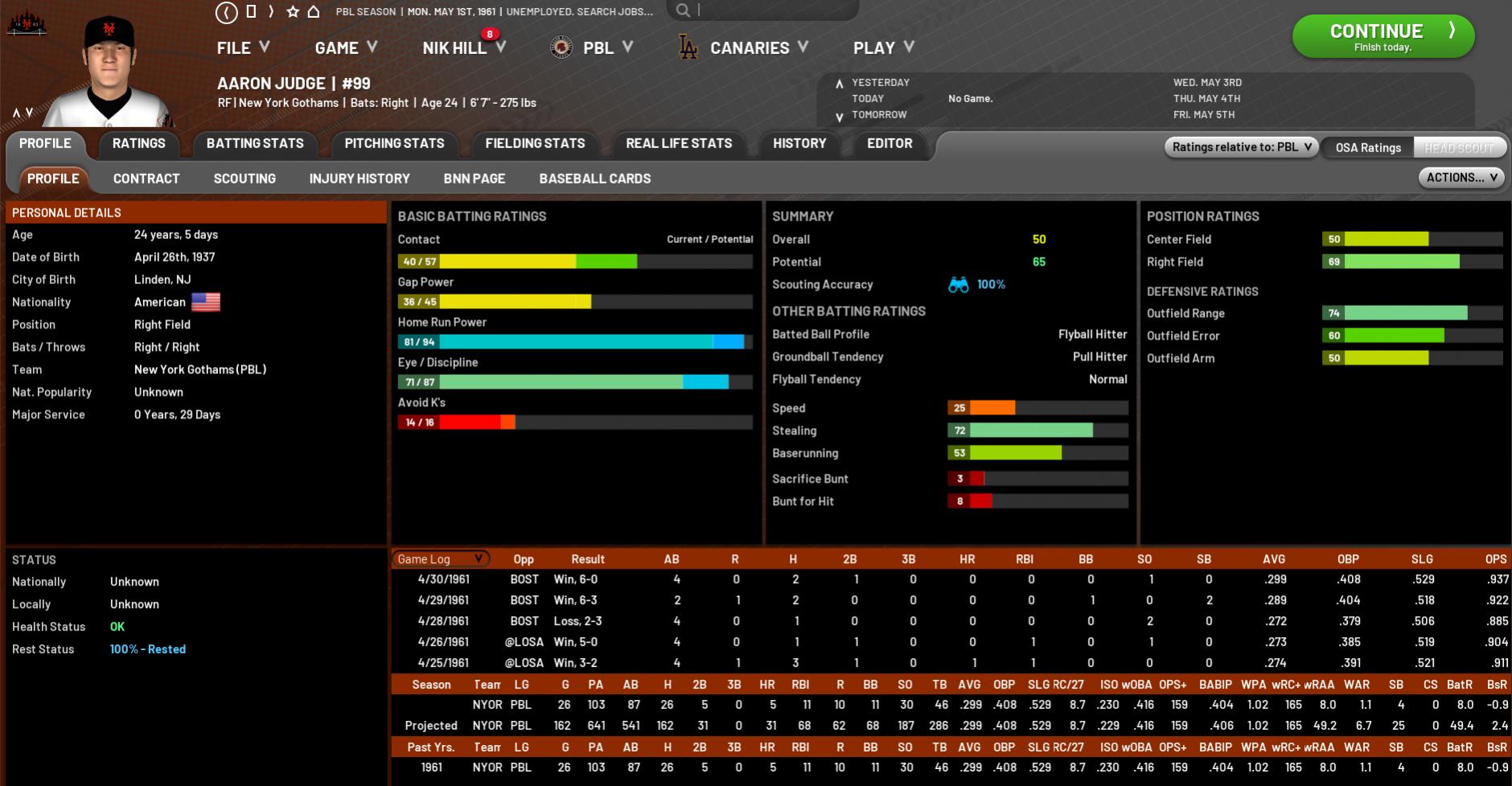 Avalon Park – Los Angeles, CA; 7.05 pm LOSA: Carl Hubbell (2-3, 3.43) LASV: Carl Mays (2-3, 3.63) Hello and welcome to Avalon Park here in Los Angeles for our Game of the Week, and tonight we’re bringing you a top of the West Division tussle between the Canaries and the visiting Las Vegas Lizards. The hosts have won both games in the series so far fairly easily to pull within one of the division-leading Lizards and have the chance tonight both to sweep and join them on top. It’s Carl v Carl tonight, with Carl Hubbell going for the home side against the Lizards’ Carl Mays. The two of them have almost identical records so far and that, along with the fact that both sides have plenty to play for, should ensure this is going to be a great contest. On top of that, it’s not just a battle of the Carls, but a battle of the Bonds as well. Here’s Juliana Scott to tell us more; Juliana? Juliana Scott: Yes Nik, I’ve got with me brothers Bobby and Barry Bonds, who’ll be on opposite sides again tonight. Bobby, let’s start with you – your Canaries have grabbed early bragging rights in what I’m sure is going to be one of the PBL’s fiercest rivalries. How have you seen the games between the two clubs so far? Bobby Bonds: Yeah, it’s been nice to get the results we were after apart from the one close loss earlier in the season. We got ahead early last night and were able to control it from there, and with the strength of their lineup that’s what you need to do if you want to beat them because they can burn you for a bunch real quick. JS: And Barry, a relatively quiet series for you so far – do you feel any added pressure playing against your brother? Barry Bonds: Well I certainly like the idea of him watching one that's come off my bat landing in the bleachers behind him (laughs), but really you don’t think too much about the opposition when you’re in the moment, you just try and pick your pitch and get the job done, which I simply haven’t managed to do in the two games we’ve played. He’s older than me so I’m kinda used to getting beat by him (laughs), but that doesn’t make it any more bearable. Plus, he talks trash with the best of them—so I’ve been getting it plenty good from him all season. JS: Bobby, your side has started the year well. Why do you think that has been the case? Bobby Bonds: We’ve formed a pretty tight-knit unit already which I think is key. And Griff has been fantastic, got us plenty of big hits in the clutch. Same with Yadi, who’s a real underrated hitter in my books. And our pitching has been really solid, keeping us in most games close enough to have a chance to win them. But still, we’re only a couple games above even so we need to keep improving. JS: What about you Barry, how have you seen your team’s performance to this point? Barry Bonds: It’s been pretty frustrating, Juliana – we’ll win a few games on the trot and look like we’ve got a roll on but then just fall into a hole for the next few. I guess that’s our inexperience, mainly. But it’s not good enough. Playing .500 ball won’t cut it in this league, or even in this division. But we’re working hard to get the consistency we need to be a force in this competition, and it won’t be for want of trying if we fail. JS: OK gents, thanks for your time and... well, I guess, may the best Bonds win! Bobby Bonds: Oh we all know who the best Bonds is, don’t we little bro? Barry Bonds: (rolls eyes) Now you see what I've have to put up with all my life, Juliana. It never ends. JS: Hahahaha. A lot of love on the field tonight Nik, back to you. Oh man, the backyard ballgames at the Bonds house when those two were boys must have been scrappy affairs indeed. Let’s see what they have for us on the big stage tonight. Back in a moment with the first pitch. TOP 1ST A nervous start for the home side. Dihigo leads off with a single, then Keeler grounds into what should have been a routine double play only for Randolph to muff it. A groundout by Burkett puts the runners in scoring position and a sac fly by Simmons scores the game’s first run. Barry Bonds walks to keep the inning going and Carew brings in another run with a single. Bonds is thrown out at third on the play to end the inning. Las Vegas 2, Los Angeles 0 BOTTOM 1ST No such issues for Mays, who retires them in order. TOP 2ND A better inning for Hubbell with no runners allowed. BOTTOM 2ND Mays retires the first two hitters then gives up a two-out double to Molina. A flub at 1B by Brouthers puts men at the points and Schmidt takes full advantage, crushing one to CF to put the home side in front. That’s gotta hurt. Los Angeles 3, Las Vegas 2 TOP 3RD Hubbell is hit hard, but fortunately to an outfielder each time so no damage is done. BOTTOM 3RD A couple of infield hits look promising, but Bobby Bonds grounds into an inning-ending double play to neutralise the threat. TOP 4TH The Canaries mount a two-out rally via a Carew single and a double by Sosa, but Brouthers can only fly out to left to end the inning. BOTTOM 4TH Mays puts them down no problems. TOP 5TH Just a hit for the visitors. BOTTOM 5TH Both pitchers seem to be having trouble getting that third out, and the Canaries stretch their lead with a two-out solo shot by shortstop Joe Williams. Another error, this time by Dihigo, extends the inning but Mays gets Griffey to ground out to end it. Los Angeles 4, Las Vegas 2 TOP 6TH The inexperience of the players is really showing tonight as Molina straight up muffs a pop-up by Barry Bonds to put him aboard. Hubbell, however, shuts it down without further incident. BOTTOM 6TH A hit and no more for the home side. TOP 7TH Brouthers leads it off with a hit but is then mown down trying to steal second by a perfect throw from Molina. Hubbell then gives up yet another two-out hit, this time to Dihigo who then swipes second in an aggressive play by Lizards’ skipper Leo Durocher. It pays off, too, as Keeler singles him i
