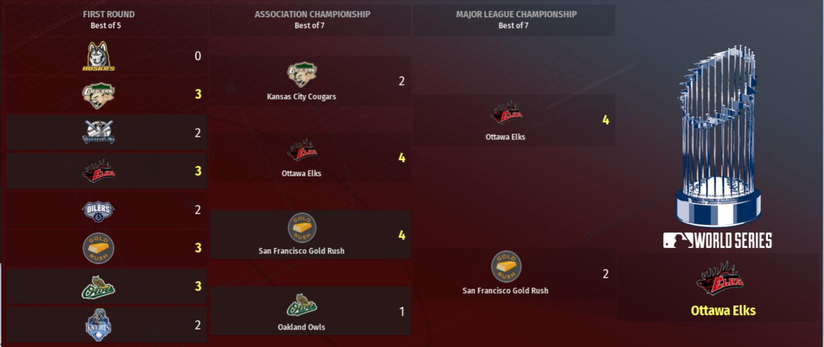 Kansas City made their fourth straight playoff berth by winning the Midwest League at 96-66. 1922 NA champ Cleveland bounced back from a 75-win 1923 by finishing second at 94-68. St. Louis tied for third with Elijah Cashman getting his third straight MVP for the Cardinals. The League champs advanced in the first round as the Cougars swept the Huskies and the Elks survived in five games against the Cobras. In the NACS, Ottawa defeated Kansas City in six games for the Elks’ first ever Association Title and the first by a Canadian team since 1915. In the American Association, San Francisco earned a seventh consecutive playoff berth, leading the AA and winning the Western League at 103-59. The Gold Rush led the AA in runs scored and runs allowed and had an MVP season from outfielder Joseph Finch, who posted a league-best 1.015 OPS. Oakland took second at 95-67, getting their first-ever playoff berth. B.J. “Bane” Herrick won Pitcher of the Year with 11.3 WAR, 296.2 innings, 279 strikeouts and an AA best 3.00 ERA. He was two wins shy of a Triple Crown. In the Southern League, Nashville and San Antonio tied for first at 90-72 with the Knights holding the tiebreaker. It was Nashville’s first playoff berth and only the second for the Oilers. This leaves New Orleans, Oklahoma City, and San Diego as the only American Association teams not to make a playoff appearance after the first 24 years. Houston’s hope for a fifth straight berth was thwarted, taking third at 85-77. Miami saw a 54 home run season from Chris Barnett. Both first round series went five games and went to the Western League with San Fran edging San Antonio and Oakland upsetting Nashville. In a Bay-Area AACS, the Gold Rush topped the Owls in five games for their second-ever Association title. In the World Series, Ottawa defeated San Francisco in six games for their first overall title and the second-ever by a Canadian team. 22-year old first baseman Robert Ross was WS MVP and had 21 hits, 16 RBI, and 6 homers in 17 postseason games. Other notes: Montreal’s D.J. Lapointe tossed the fifth MLB Perfect Game on 8/5, striking out 11 against Detroit. Corey Patrizio and Archie Meredith became the 9th and 10th players to 1500 career RBI and both also got to 2500 career hits. Newton Persaud became the third pitcher to 250 career wins. |