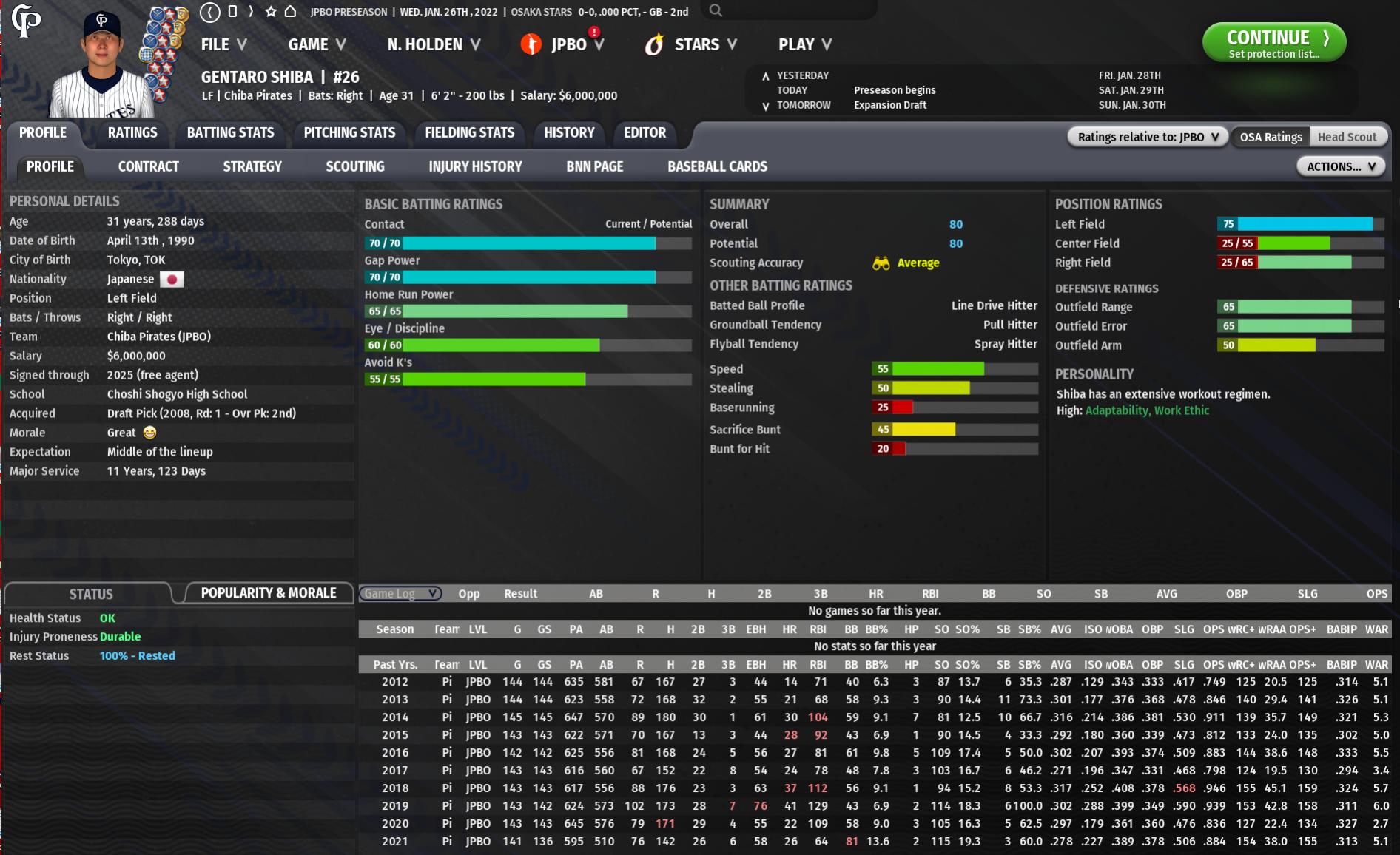 Osaka is definitely in trouble, 4.5M in the red for budget, havent had a 500 season since 2013. Took me a while but I found the current best player in JPBO. Over 10 WAR last season. Hisanori Oba, with insane contact and power ability. Plus Plus defense at 2B. I also added two independent leagues for Japan, I feel it serves as a good development ground for prospects that aren't drafted. Last edited by uknownick; 02-03-2023 at 06:00 PM. |