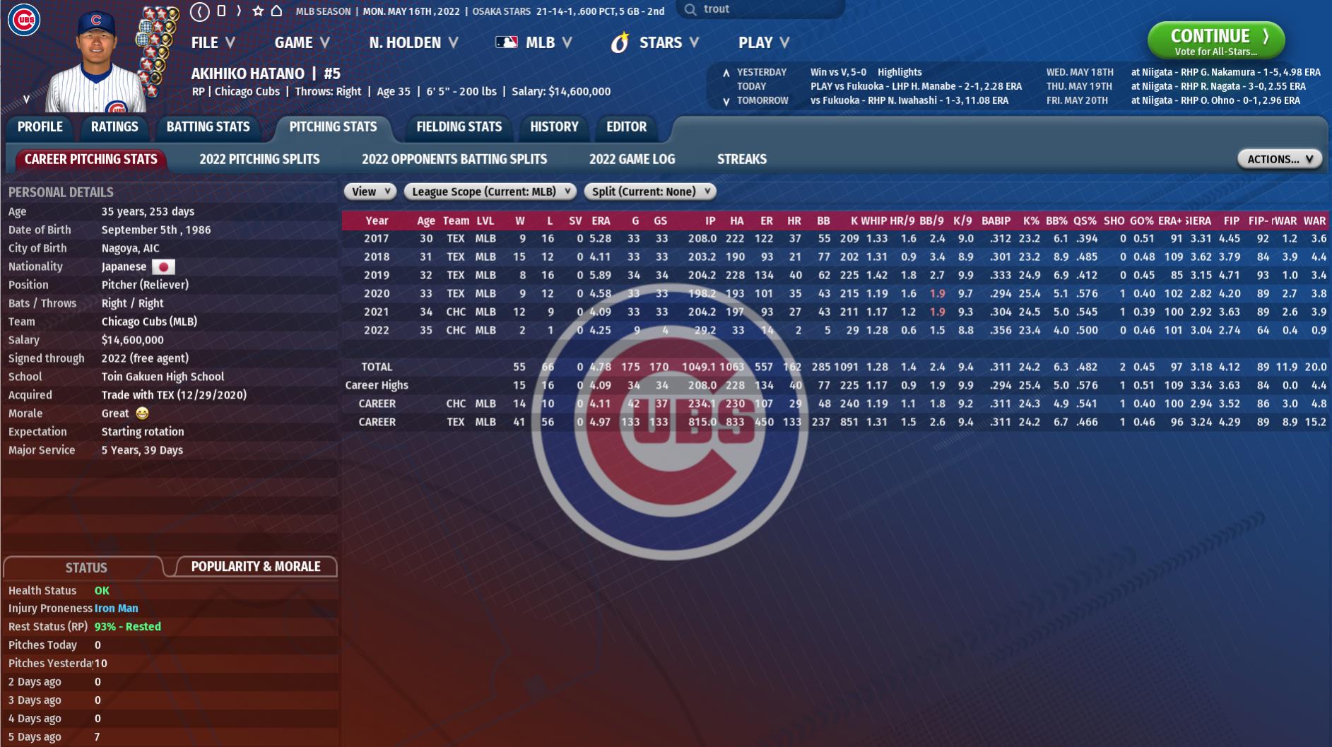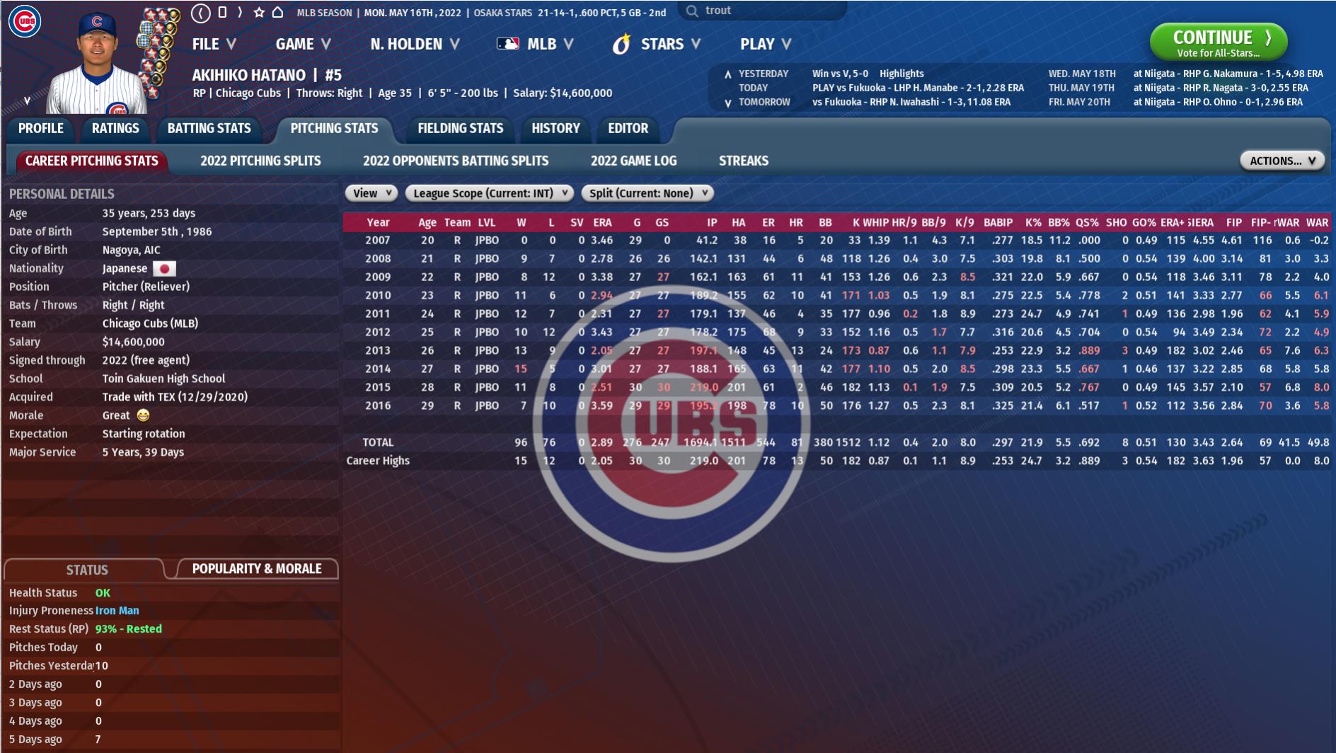 DeGrom of Japan and Trout of Japan both play for Chiba. Surprisingly they havent been able to build a dynasty. Nagoya has two Aces on their staff. and just won the championship in the prior year. Takahide Tanaka is basically Tanaka + Darvish + Sasaki. He would be the best pitcher in MLB if he gets posted. Gentaro Shiba is the Yuki Yanagita of this universe. Last edited by uknownick; 02-03-2023 at 04:58 PM. |