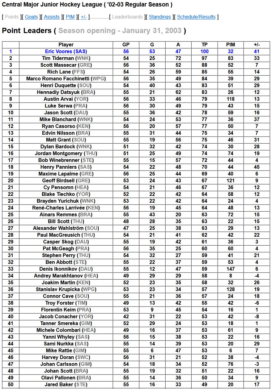 update... tweaked the Leaderboards menu. Clicking on a specific team now shows the complete roster (players+goalies). Added a new stat for goalies, Mins/GP (elite #1 starters would average closer to 60 minutes in this category).