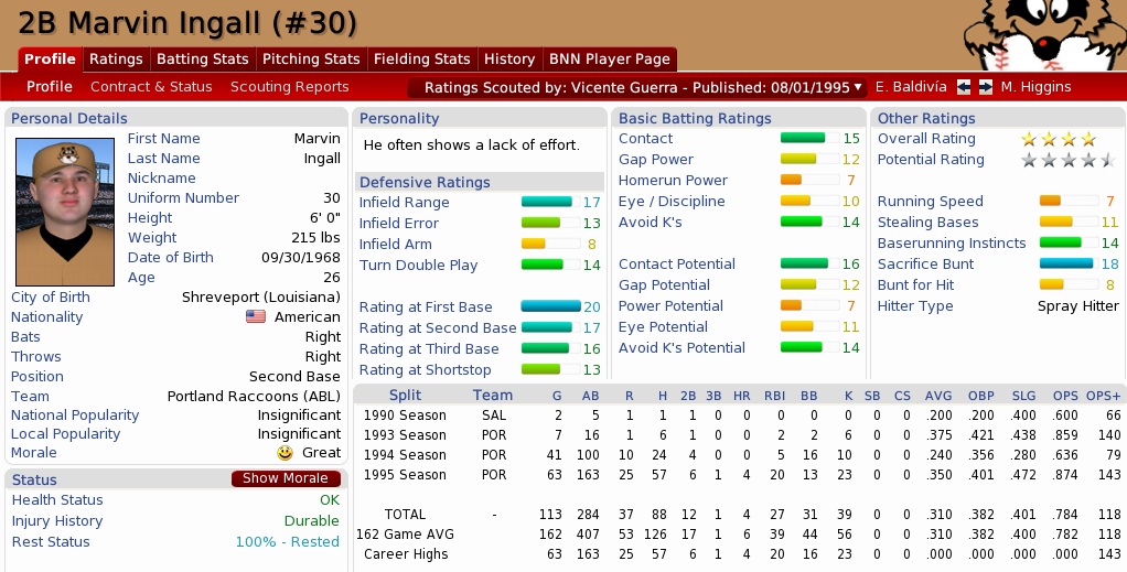 Vern Kinnear came back onto the roster for this series, overcoming the elbow sprain that has kept him out for a few weeks. Raccoons (86-60) @ Bayhawks (79-67) – September 15-17, 1995 The Bayhawks continued to be mostly pitching, middling offense. We faced a few replacements to their rotation, though, in callup Miguel Diaz and career depth chart dweller Dave Beck. Projected matchups: Miguel Lopez (15-5, 3.11 ERA) vs. Miguel Diaz (1-1, 3.06 ERA) Antonio Donis (1-0, 7.20 ERA) vs. Jorge Chapa (9-9, 4.42 ERA) Scott Wade (10-9, 3.26 ERA) vs. Dave Beck (0-1, 3.68 ERA) Once David Brewer drove in the first run of the game in the top 3rd, Miguel Lopez was battered with doubles in the bottom 3rd and we fell 2-1 behind. With one out in the fourth however, Kinnear had a pair on base and drove a double to the deep left corner of the park that scored both runners, and the score swung around instantly again. Lopez pitched – for the most part – a controlled game, but with little cushion. Vinson hit a leadoff double in the seventh, and Lopez then hit a single up the middle. An unravelling Diaz scored Vinson with a wild pitch, and would not retire any of the last three Coons he faced either, issuing two walks, a wild pitch, and an RBI single to Reece, and we got a few more RBI singles from Green and O-Mo en route to scoring five runs in the inning. With an 8-2 lead Lopez should be safe. And he would have been, had he retired anybody in the bottom 7th. He didn’t. Four Bayhawks into the inning, we were up 8-3 and the bases were loaded, and Lopez was yanked. De La Rosa got one out in three batters, scoring two, and then West came in to face Pedro Perez and plunked him with the bags full. Martinez entered and walked Bill Dean, and YES THE BAGS WERE STILL LOADED. Mike Powys then threw the party with line drive double play to Salazar. From 3-2 to 8-7 in one inning. Don’t see that every day. What you get to see every day recently is the Raccoons’ closer blowing the save, and in this case it was Mike Dye giving up a leadoff walk in the bottom 9th, he never worked out of that setback and eventually gave up a 2-out RBI single to pinch-hitter Doug Hill, sending us to extra innings. Baldivía walked to start the top 10th and was replaced by Higgins to run. Vinson doubled to right center, and Higgins was sent home, and thrown out. Jin singled to put Vinson on third, but Vinson only scored on a clumsy play by 1B Pat Chandler, generously scored an infield single for Brewer. Lagarde hit the leadoff batter in the bottom 10th and the Bayhawks brought him around to third base, but Chandler made the final out, a gentle flyer to Reece in center. 9-8 Raccoons. Brewer 3-4, 2 BB, 2 2B, 2 RBI; Reece 2-6, RBI; Green 2-5, RBI; Vinson 3-4, BB, 2 2B; The Loggers romped over the Condors in Mexico, 14-3, while the Titans’ Julio Navarro blew the save against the Thunder, and Boston lost, 3-2. So, MIL 1.5 GB, BOS 2.5 GB. The Dye problem may have solved itself, as he was uncomfortable after the game and was to be checked out thoroughly. He was not available. Game 2 was miserable from the start. While Chapa was no-hitting the Raccoons, Donis was not hitting the strike zone, but the Bayhawks got a few runs off him. Through four innings, they were up 2-0 and he was running out of breath, and he failed to get out of the fifth, leaving two men on with two out. De La Rosa came in, faced four batters, and put them all on. The Raccoons were down 6-0 before they ever got a hit in the game. The first hit was a leadoff triple by Reece in the sixth. He was not scored, as O-Mo grounded out, Green whiffed, and Baldivía grounded out. The next reliever to get raped was Grandridge. Collecting two outs, he was booked for five runs as all hopes and dreams were washed down into the bay. 11-1 Bayhawks. Reece 2-4, 3B, RBI; Mallandain 2.2 IP, 1 H, 0 R, 0 BB, 1 K; Reece’s pair of hits was all we got. Bloody suckers. The Titans won in extra innings in Oklahoma, 5-3, while the Loggers shut out the Condors, 3-0. MIL 0.5 GB, BOS 1.5 GB. Mike Dye was diagnosed with rotator cuff inflammation, so he is gone for the year, and of course he also will not receive another contract here. We have no closer. So what? We also have no offense and no pitching. Rubber game on Sunday, Scott Wade went out. He looked very good out of the gate and held the Bayhawks on small provisions. Meanwhile, the offense grounded into double plays in the first three innings before they got a run in. Dave Beck was erring all about the general vicinity of the strike zone, walking plenty of batters, and was out by the fifth, when the Coons upped the score to 4-0. Reece homered in the seventh, 5-0, but the Bayhawks bullpen coughed up three more runs in the inning. Wade was still milling about silently, having given up only a pair of hits through six innings. He gave up a hit each of the next two innings, but nobody reached third base. We were up by ten entering the bottom 9th, so Wade was sent back out on 101 pitches to face the 2-3-4 guys, but Roberto Guevara came out to pinch-hit to start the inning. He got on with a single. PH Alfredo Marquez grounded out to first, moving up Guevara. Jim Thompson bounced out to Brewer, moving up Guevara again. Mike Powys was the batter to get out for Wade, but he walked him. Doug Hill came up, last guy no matter what. Hill popped up a 1-0 pitch into shallow left center, and Kinnear made the play. 10-0 Raccoons. Brewer 4-6, 3B, 2B, 2 RBI; Higgins 2-5, BB, RBI; Reece 2-5, BB, HR, RBI; O’Morrissey 2-3, 2 BB, 2 2B, 2 RBI; McDonald 2-4, BB, 2 2B, 2 RBI; Wade 9.0 IP, 5 H, 0 R, 2 BB, 4 K, W (11-9) and 1-4, RBI; So that fantastic performance was Wade’s third shutout of the season, setting a personal record, and the eighth of his career. He almost also would have made it to 100 K this season, too, stopping at 99, and that may not sound like a big deal for a starter, but Wade has never been that guy. His personal best is 125 in a season, and he has not ha