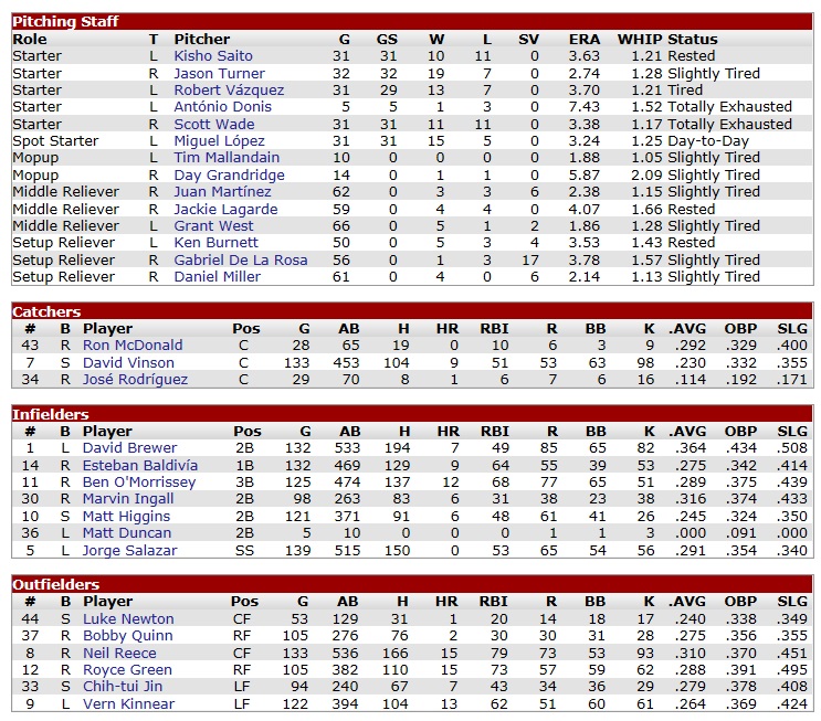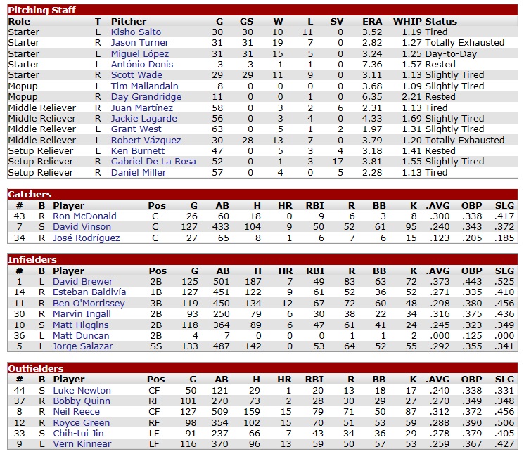 The Crusaders possessed a ravaged rotation, which was their main problem. They ranked last in the league with a starters’ ERA over 5, and conceded the second-most runs. With the Coons and their top ranking offense, I was sensing a chance here. Projected matchups: Miguel Lopez (6-2, 3.80 ERA) vs. Hector Lara (5-9, 5.93 ERA) Robert Vázquez (6-3, 3.65 ERA) vs. Danny Ramirez (4-6, 4.58 ERA) Scott Wade (5-6, 3.78 ERA) vs. Dan Barnes (5-9, 4.67 ERA) Kisho Saito (8-2, 3.11 ERA) vs. Jose Ramos (3-6, 6.14 ERA) Chances are a curious thing. Hector Lara did not surrender a hit in the opener until the fourth inning, by which time the Crusaders were up 2-0 thanks to a first-inning line drive home run by Victor Martinez. Reece was left on third base following his bloop double, because nobody was able to get a bat onto Lara. The Crusaders were less shy with Lopez, putting a total of five runs on him and knocked him out in the sixth. Lara’s RBI single nailed Lopez’ coffin shut. Lagarde and Miller surrendered pairs of runs, which put us down 9-0 against the pushover Lara. A solo homer by Brewer in the eighth was just for the laughs, and when Lara collapsed and conceded three more runs in the ninth, it didn’t please anybody in attendance. 9-4 Crusaders. Brewer 3-5, HR, 2B, RBI; Kinnear 2-4, HR, RBI; Newton 1-1, 2B, 2 RBI; Out-hit 18-9. Six of our hits came after the seventh. The humiliation. Oh my … oh … oh my… oh. To make this more miserable, David Brewer came home lame from his Friday morning jog. He had tweaked his knee and was out for the series. Nothing serious, but another warm bat down. Game 2. David Ramirez pitched five innings of 3-hit shutout ball against the Raccoons before being forced out by an undisclosed pain. The Raccoons were 1-0 behind at that point, courtesy of a wild Vázquez, who had issued two walks in the first inning, followed by a single. The Coons left the bags full in the third, and Vinson at third base in the fifth inning. Still down 1-0 in the bottom 7th, 2-out walks to Vinson and Higgins, sandwiching a pinch-hit infield single by Marvin Ingall, loaded the bags for Salazar, but the Crusaders had left-hander Xavier Herrera on the mound. Luke Newton was sent in to hit for Salazar. Newton lined out to CF Clement Clark. This was mirrored in the top 8th, De La Rosa packing the bags full. A liner to Neil Reece would make the final out without scoring there. Bottom 8th. Reece walked. O-Mo singled. Jin walked. Nobody out. The Crusaders threw in another reliever, Jose Hernandez, to face Bobby Quinn, who took four balls and we were tied. Then came Baldivía, hit into a double play, home and first, and Vinson drifted out to right. Between Martinez, West, and Grandridge, the Raccoons gave up two runs in the top 9th. 3-1 Crusaders. Out-hit 10-5. You may guess the suckers were properly screamed at after this game. They came out and raped Dan Barnes for six runs in .2 innings in the third game, which included the first big league home run for Marvin Ingall, of the 2-out, 3-run variety. And now the bad news: once Barnes was out, the Raccoons only got two more men on base – the entire game. This put focus on Scott Wade, who was pitching to contact all the time, and did especially well so recently. Could he deliver a gem here? Could he at least delay this series going to the Crusaders? You bet! Wade painted the corners for strike calls like his brother was the umpire at home (but that wasn’t the case – the home plate ump was some Wtan Sade. Wait…). The Crusaders were completely unable to get to him. Having pitched a 96-pitch complete game his last time out, Wade got even better: this time he finished in 91 pitches, and did not concede a run! 6-0 Raccoons. Wade 9.0 IP, 5 H, 0 R, 0 BB, 5 K, W (6-6) and 1-3, 2B, RBI; This makes for two complete games in his last three starts for Scott Wade, who has now 11 for his career, and for his sixth shutout. He had not tossed a SHO since 1992, the year he posted career-best numbers in ERA (2.76), WHIP (1.11), and WAR (4.9, tied with 1994). Wade at this point is probably as dialed in as you can ever be. In his last three starts, he is 2-0 with an 0.70 ERA. Brewer’s knee was deemed fine in time for the series finale, so he only missed the two starts against left-handers, of which he probably would have sit one out anyway. Game 4. With Kisho pitching, I was expecting a Crusaders shutout again. Jose Ramos was scatched by the Crusaders and replaced with Cipriano Miranda (2-5, 5.75 ERA). Both pitchers 2-hit the opposition in a game scoreless through three, before the Coons broke out with a 3-run fourth. Saito gave one run right back in the top 5th, but overall he had brought the heat and was dealing. Between the sixth and seventh, Saito punched out four in a row. O-Mo left the bags full in the bottom 7th in a game that was still all pitching although Miranda had been chased with two men on in the sixth, where the Coons hadn’t scored either. Somehow, although Saito was pitching a 5-hitter with 9 K’s through seven frames, it was like waiting for that bloop-and-blast scenario. And the eighth became Saito’s last inning, in fact. After whiffing Ramón Diaz, pinch-hitter Jerry Watson singled to left, a few feet in front of the rushing Kinnear (he had no chance to get it). Steve Cobb struck out, but then Saito issued his first walk of the game to Clement Clark. Whatever would come about, lefty slugger Pat Jenkins was his last man. Saito punched him out, going over 110 pitches in the process, and completing a dozen K’s. To close this one, I turned to De La Rosa. If you blow this one, you will get your ticket to Kingdom Come. Two out, Raúl Rodriguez singled to left. That brought up the obnoxious Benjamin Butler. Oh, bad vibes coming here. The count ran full. Butler ripped at De La Rosa’s next offering, but didn’t get the bat on it properly. He grounded out to Salazar, who made the final out. 3-1 Coons! Salazar 2-4; Kinnear 2-3, BB, 2B, 