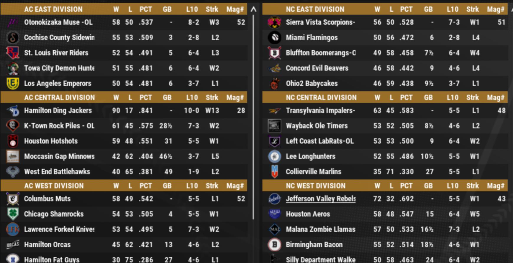 The Rebels were idle yesterday and remain a top the OL standings. They have seven games remaining including a 3 game series vs. the Impalers later this morning. To make a run at the crown Transylvania needs a sweep. Outside of the 3 vs. Jefferson Valley, Transylvania has 8 left-all against Left Coast.
