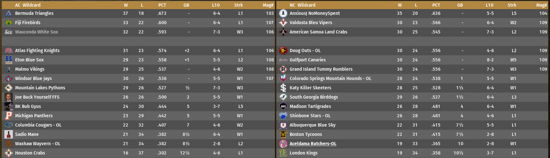 Bushwood remains perfect with no OL games until the final week of the season. Claptown and New York positioning themselves to jump ahead should Waffletown be able to play spoiler. |