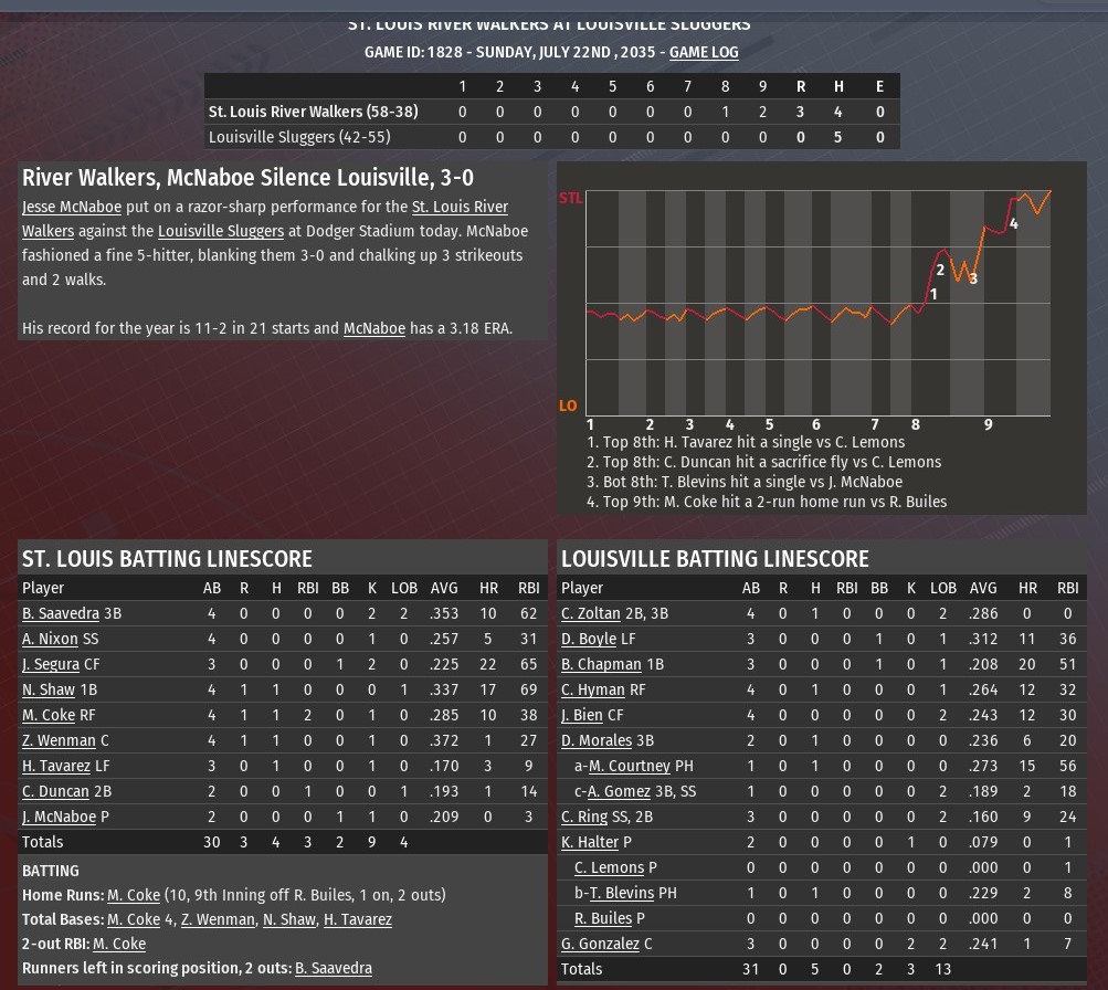 Tied 2-2, St. Louis exploded for seven runs in the top of the ninth inning, and the River Walkers went on to defeat Louisville 9-2 at Dodger Stadium. Sluggers relief pitcher Matt Whitmore struck out Nick Shaw to open the ninth inning, but immediately got into trouble allowing a single to Hector Tavarez and an RBI double to Jackson Miller. Miller had to leave the game with a back injury, being replaced by Nathaniel Dixon. The Walkers followed that by putting their next four batters on base, before Whitmore headed to the shower. The big hits were an RBI single Aaron Nixon and a three-run double by Bob Saavedra. John Fiefield took over over the Sluggers, but the Walkers kept on scoring. Manuel Coke connected on an RBI single. Shaw later drove in the inning's final run with a fly ball. St. Louis starting pitcher Jim Martin went 7.1 innings, allowing two runs on five hits. He struck out five and walked three. Greg Sones got Martin out of an eighth inning jam, retiring the only batters he faced. With a comfortable lead, Angel Tiburcio pitched a scoreless ninth. |