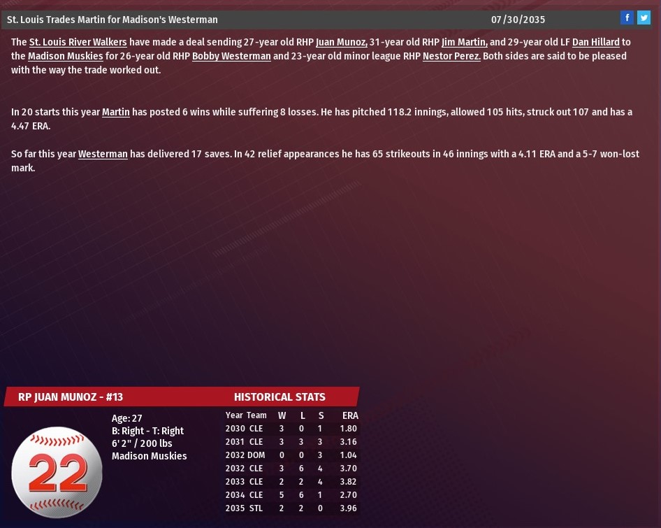 Westerman, 26, has pitched in 42 games for the Muskies this season, going 5-7 with 17 saves and a 4.11 ERA. He has five blown saves. For his career, Westerman has a career mark of 37-46 with a 3.74 ERA and 161 saves in 368 games. Westerman, who makes $15.9 million per season, can be a free agent at the end of the season. Martin, 31, was in his second season in St. Louis and had gone 6-8 with a 4.47 ERA in 20 starts. In a year plus with the Walkers, Martin had gone 18-20 with a 4.03 ERA in 53 games (52 starts). In his first season in St. Louis, Munoz, 27, had gone 2-2 with a 3.96 ERA in 38 games. For his career, the right-hander, he spent six seasons in Cleveland before being acquired by the Walkers, is 20-19 with a 3.12 ERA in 416 games. He has recorded 14 saves. Hillard, 29, has been a valuable utility player in just over two seasons in St. Louis. After a good season in 2034, when he hit .257with 13 homers and 50 RBIs in 119 games, Hillard had seen his playing time decrease this season and has hit just .225 with 3 homers and 19 RBIs in 66 games. Hillard's value is in his ability to play first base, third base and both corner outfield positions. Also coming to St. Louis was 23-year-old right-handed relief pitcher Nestor Perez. The right-hander has pitched at both A and AA this season, going 2-3 with 11 saves. St. Louis made the trade for Westerbrook for a couple of reasons. Acquired in the offseason from Toledo, Nick Strother has been inconsistent in the closing role despite having 18 saves and just two blown saves. Also, right-hander Xavier Wigfall was expected to miss the entire season after Tommy John surgery, but has returned quicker than was planned. After a month's worth of strong outings, Wigfall seems more than ready to re-join the rotation and someone had to go. Jose Gonzalez, who has played well at AAA Memphis, hitting .375 with nine homers and 46 RBIs will take Hillard's place on the roster. He will provide depth at both first and third base. |