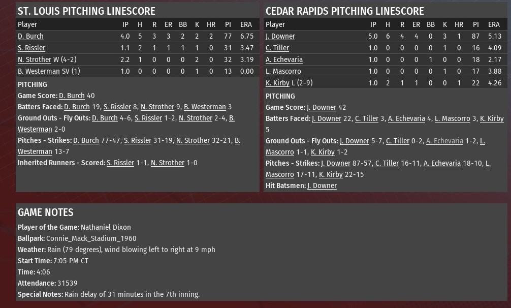 Nathaniel Dixon hit a pinch-hit home run with one out in the top of the ninth inning to snap a 4-4 tie, and give St. Louis a 5-4 win over Cedar Rapids at Connie Mack Stadium (1960). Dixon's fourth home run of the season came off Grapplers reliever Keith Kirby, and carried 423 feet over the high wall in right-center field. The River Walkers had led 4-1 going into the bottom of the fifth, when Cedar Rapids rallied to tie it. Pinch-hitter Dane Finch led off the inning with a home run off Walkers starting pitcher Danny Burch. Burch had been called up from AAA Memphis to make an emergency start, following the trade of scheduled starter Jim Martin. Mark Hill then drew a walk from Burch, who then exited the game. Scott Rissler took over and didn't bring anything with him to the mound. Arnold Hammond greeted him with an RBI double, making it 4-3. Hammond later tied the game when he scored on an Jordan Batista sacrifice fly. St. Louis jumped out to a 2-0 lead in the top of the second when Jose Ramirez homered off Grapplers starter Josh Downer. Burch pitched four innings, allowing three runs on five hits. Rissler handled 1.1 innings, giving up one run on two hits. Nick Strother pitched a strong 2.2 scoreless innings. Just acquired Bobby Westerman set Cedar Rapids down in order in the ninth for his 1st save as a River Walker. |