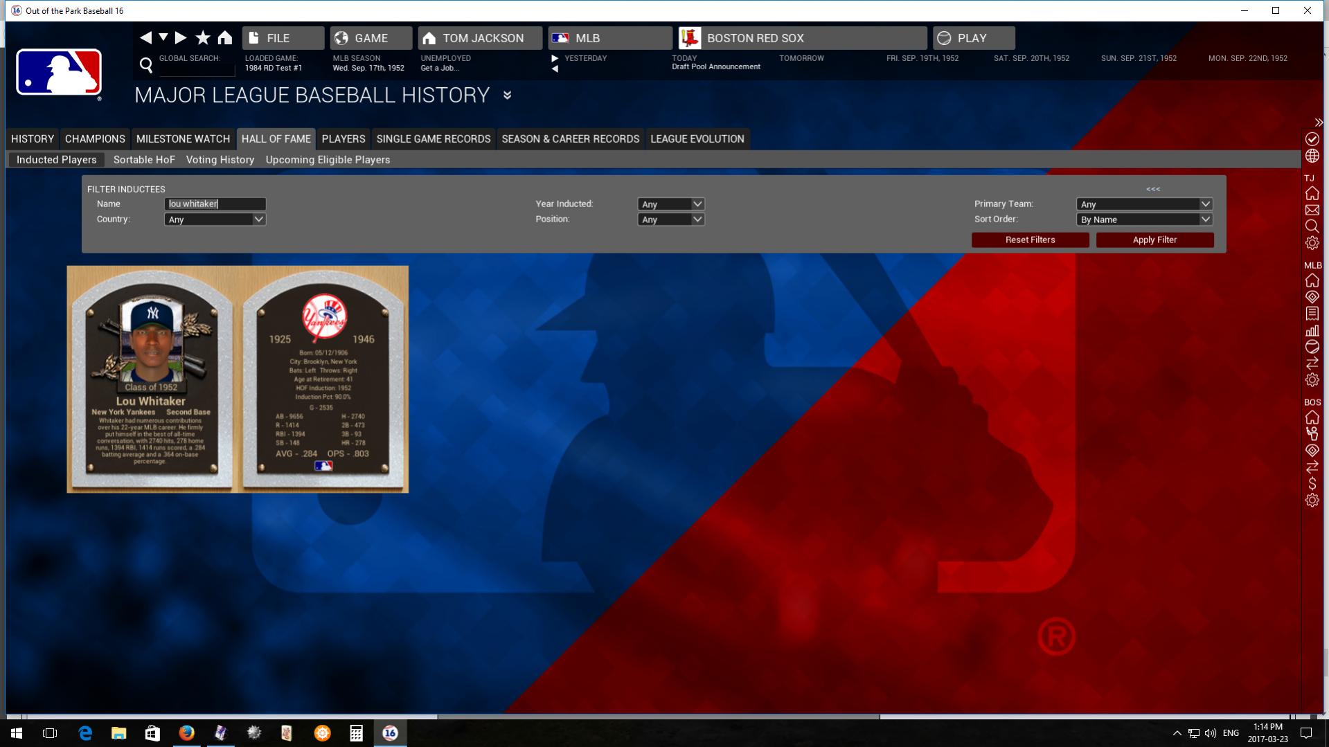 For my now 52 year old random debut league, I have used Neutralized Stats, and tied the LTMs and Strategy Settings to 1984. With financials, I advance year by year as they happened (though I find I have to do it manually on the first day of the offseason for some reason), and I allow MLB to expand (and teams to move) as it did IRL. I have my league always play a 162 game schedule with a custom made schedule that seems to change every year, which is pretty cool. You don't have to re-install Spritze's database every time if you extract the folder into the "stats" folder inside your OOTP Baseball 17 (or *fingers crossed*) eventually your OOTP Baseball 18 folder when the new one comes out. What happens when a new patch comes out is that every file in the stats folder gets overwritten, but if you've got your SpritzeHSforOOTP18 (when it arrives) folder inside the stats folder, nothing inside it gets touched. Then, if you want to use it as your default database, make sure you direct the game to it in your "Database Path" on the Game Settings > League Settings > Historical > Historical Rookies Settings page. Once Spritze gets that amazing database out, you'll be able to set it up as your default database whereas right now, you have to import Negro Leaguers, minor leaguers, NPBers, KBOers etc etc etc from the minor league database, which is a royal PITA for those that want to batch import multiple players. In my OOTP16 game (the 52 year old one), I've imported 2 non-MLB players from the Spritze db that goes with OOTP16 into every draft, so I don't have to deal with batch import issues because I'm not really batch importing. I can appreciate the frustration of those who bought OOTP18 expecting to be able to play with players from the minor league database in their random debut or customized historical games, only to find out that you have to import those players from the minor league database though. I think we'll get it sorted out reasonably soon enough though. My drafts are only five rounds long, so it takes my draft pool from 80 (16 teams * 5 round draft) to 82 players, and I don't need any more players than that every year to keep the league churning along. Last edited by actionjackson; 03-23-2017 at 04:50 PM. |