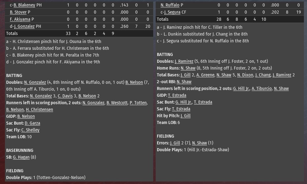 Erik Rivera hit a two-run home run off St. Louis relief pitcher Nick Ruffalo in the top of the ninth inning to help lift Milwaukee to a 6-4 win at Busch Stadium (2006). Michael Brooks drew a walk to open the top of the ninth. Rivera then turned on a 2-2 pitch and powered it 385 feet over the wall in left field to put the Crushers in front for good. A run scoring triple from Rivera followed by RBI singles from Hsin-ping Mei and Ian Blount in the top of the first off River Walkers starting pitcher Zack Hunsicker helped stake Milwaukee to an early 3-0 lead. A solo homer from Noah Naylor in the fourth later gave the Crushers a 4-1 lead, after Nick Shaw had gone deep for the first St. Louis run in the bottom of the second. The Walkers rallied to tie it. They scored twice in the fourth off Crushers starter George McCardel. Kevin Melendez drove in both runs with a single. A pinch-hit homer from Jae-hong Chang off McCardell in the seventh tied it. McCardel pitched seven innings, allowing four runs on seven hits. He struck out seven and walked one. Chad Bigalow and Adam George both pitched a scoreless inning. George earned his 13th save. |