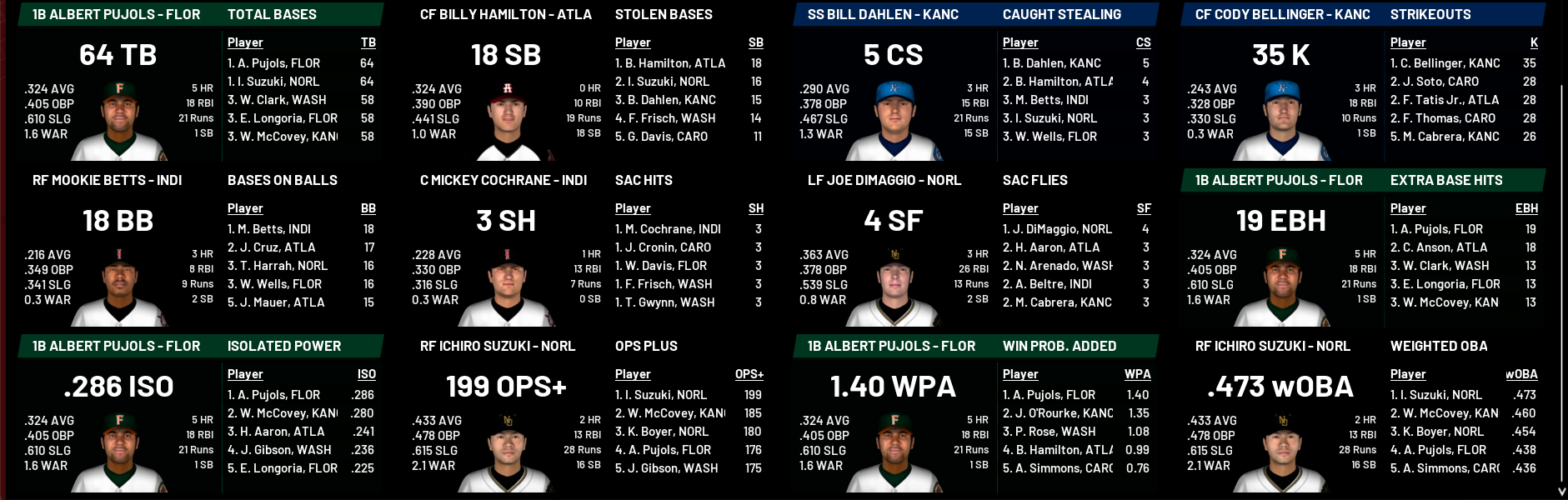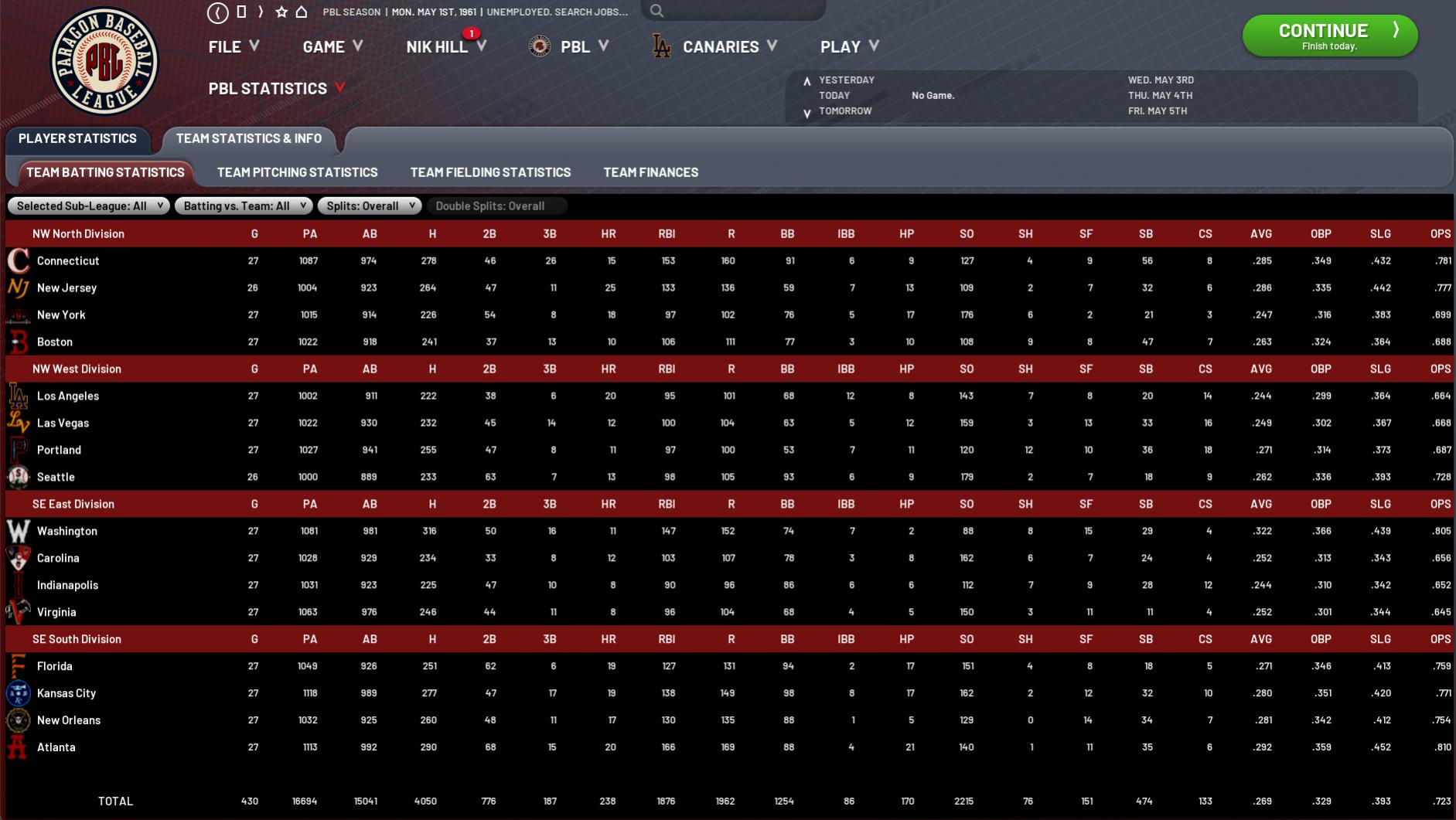 The Colonials have started very strongly and have grabbed a 3 ½ game advantage over the others (who are tightly bunched) mainly by dint of their PBL-leading +59 run differential. They are ranked at or near the top of most statistical categories and most of their big guns have been firing from the starter’s gun. Each of the other sides has been competitive and I doubt they’ll be too worried about the mini-break that has formed at this early stage. That said, they won’t want Connecticut to get much further ahead of them either. West Division Already it is obvious that the Los Angeles-Las Vegas rivalry will be a beauty in this division for years to come. Portland and Seattle have struggled so far, with the Rainiers’ pitching (4.78 ERA / 4.63 FIP) a real concern and the Stags’ bullpen bleeding too many runs and blowing too many games. Should this pattern continue then the West will almost certainly be a two-horse race. South Division The closest and most competitive of the four divisions, only two games separate the South from top to bottom and all four sides have a winning record. Suzuki and Boyer have been revelations at the top of the Pirates’ order, Aaron has decimated the pitching so far for the Firebirds, Pujols and Longoria have 10 dingers between them to this point for the Panthers, and the Blues are perhaps the most even squad in the league. So all four have legitimate claims here and this should be a fascinating race for the duration. East Division If early indications are anything to go by, the East will be a cakewalk for the Grays who absolutely dominated during April, going 21-6. And yet statistically it’s hard to see how, other than their team BA of .322. A +5 Pythagorean differential implies their torrid pace is somewhat unsustainable, and there’s no argument the other sides in the division have been poor so far, especially the 6-21 Fury, a team yours truly thought would be among the contenders this season. But if Washington continues to street their rivals, they just might work up a big enough lead to kill this division off before it ever gets a chance to liven up.