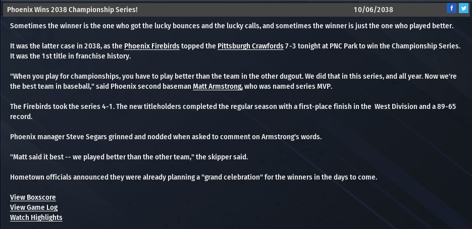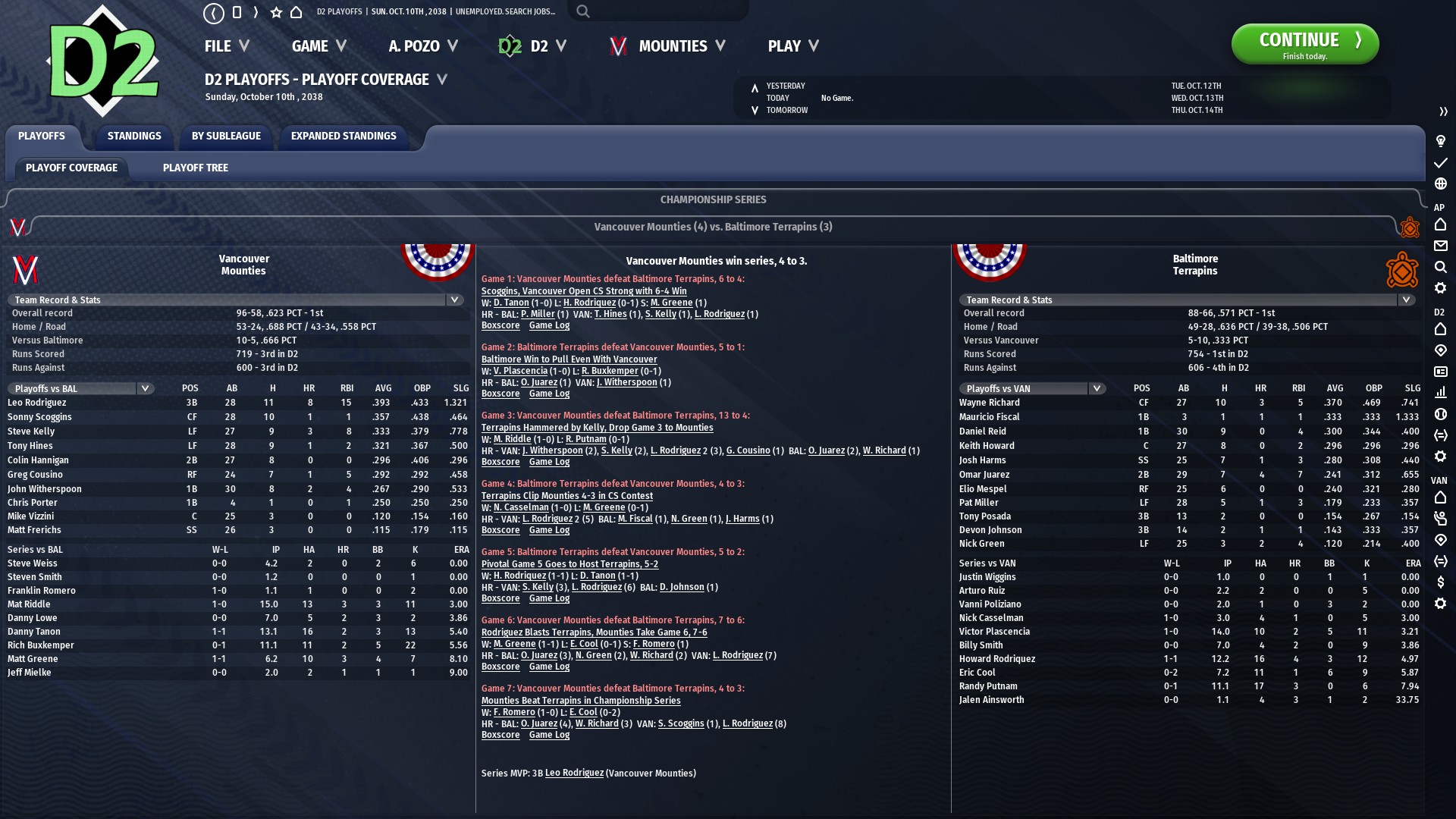 Game 1: Mounties Defeat Terrapins, 6-4 in Vancouver Danny Tanon was solid against a tough Baltimore offense, holding them scoreless through seven before they started to do damage late. By then, though, Vancouver hard already scored six times, including a two run homer in the first from Leo Rodriguez that put the Terrapins on an early defensive. Tony Hines hit a solo shot in the 4th, and Steve Kelley added a third shot in the 6th for two more. Baltimore LF Pat Miller finally broke the seal against Tanon in the eighth with a three run bomb that drove him from the game, and that brought in Matt Greene, who allowed a run but otherwise kept Baltimore down for two full to get the save. Game 2: Terrapins (1) Defeat Mounties (1), 5-1 in Vancouver After a quiet game 1, Omar Juarez made his presence felt early in this one. After a Daniel Reid single and a walk to Wayne Richard, Juarez hammered a 1-2 hanging knuckle curve from Buxkemper way out to left to give the Terrapins a lead they’d never lose. Nick Green plated two more with a bases-loaded double in the sixth that scored Richard and Juarez. John Witherspoon homered for the Mounties in the inning’s bottom half, but that was the only blemish on Victor Plascenscia’s outstanding outing, going 7 with six strikeouts, allowing two walks and five hits. Baltimore comes home with a split series. Game 3: Mounties (2) Defeat Terrapins (1) 13-4 in Baltimore Balls were flying out at Terrapin Park tonight, with a total of seven homers accounting for fifteen of the game’s 17 runs. Once again, Leo Rodriguez homered in the first - a three run shot that opened a big night for Vancouver. He added a solo shot in the third. As Mat Riddle set the Terrapins down in inning after inning, Vancouver heaped it on with a five run fifth featuring RBI singles from Tony Hines and Steve Kelly (the only non-HR RBI of the night) and a three run bomb from Greg Cousino. Four more runs came in during the sixth, when John Witherspoon and Kelly both hit two run shots. At that point it was 13-0, and though Baltimore got into the game a bit with a two run homer from Juarez in the eighth and another from Wayne Richard in the ninth, they weren’t digging out of that hole. Game 4: Terrapins (2) Defeat Mounties (2), 4-3 in Baltimore Baltimore got a dramatic walk-off win in front of a raucous crowd tonight in a game that featured one wild seventh inning in between a lot of good pitching. At first it looked like we might be watching a different kind of history, as Lowe carried a no-hitter through the fifth despite a walk, an error, and a wild pitch, and though he gave up a single and a walk in the sixth he kept the Terrapins off the scoreboard. Baltimore’s Billy Smith allowed yet another homer to Leo Rodriguez in the second - his fourth of the series, and first of two in the game - but was otherwise just as good through six. Rodriguez decided a one run lead wasn’t enough, though, so Vancouver’s new October superman homered again, a two run blast that put his club up 3-0 and gave him five homers in four games. But Danny Lowe’s magic slipped in the bottom of the seventh: Nick Green homered to lead off the inning, and after a single by Elio Mespel Josh Harms added another big fly to even the game at three apiece. That’s where it stayed, now a battle of the closers as Baltimore’s Eric Cool and Vancouver’s Matt Greene shut things down. In the tenth, Eric Cool worked around a single from Mike Vizzini while Greene did the same to a single and a walk. Baltimore pulled Cool before the 11th began, putting in SP Nick Casselman, the club’s fifth starter, relegated to the pen for the series. The Baltimore fans were real quiet as Casselman faced Rodriguez, but there was no third homer of the game: instead the slugger went down on strikes, as did Tony Hines after him to end the inning. Vancouver sent Matt Greene back out, though, and that proved a mistake: Baltimore 1B Mauricio Fiscal hit a 1-0 fastball just over the left field fence to win Game 4 in a walk-off. Game 5: Terrapins (3) Defeat Mounties (2), 5-2 in Baltimore The series heads back to Vancouver without a safety net for the Mounties, who must win two of two at Scotiabank Field to survive. Baltimore knocked Danny Tanon around in this one, as Howard Rodriquez cruised to victory. After both teams scored a run early (Vancouver’s in the first on a Witherspoon sac fly and Baltimore’s in the second on a Steve Kelly homer), the pitchers kept things settled for a couple innings. But Baltimore did damage in the 5th. After a one out HBP to Elio Mespel, Keith Howard put him on second with a single, and Josh Harms brought him home with another. With two men on, Daniel Reid hit a two out triple to make it 4-1, and Wayne Richard singled Reid home bringing the score to 5-1. Rodriquez lasted until the seventh, when he was pulled after two singles opened the inning. Justin Wiggins was able to put out the fire, though Leo Rodriguez hit his sixth homer to open the 8th against Nick Casselman. The Baltimore starter recovered to get the last six outs without incident, though, and the Terrapins won their third game of the series, on the verge of their first title since 2030, and what would be their ninth overall, the most in the NABF. Game 6: Mounties (3) Defeat Terrapins (3), 7-6 in Vancouver Under pressure, Vancouver delivered in a see-saw game that saw the lead change four times, with Vancouver barely avoiding a fifth. In the process, Leo Rodriguez may have entered immortal status. After a top of the fourth Baltimore run courtesy of a Wayne Richard solo shot off Rich Buxkemper, John Witherspoon singled to bring Rodriguez to the plate. The 3B had already hit six homers in the series, but this time missed - he hit a triple instead, to bring home the tying run. He was stranded at third, however, so that tie lasted two more innings. In the bottom of the sixth, Victor Plascecia gave the Mounties their opening, walking Sonny Scoggins and Colin