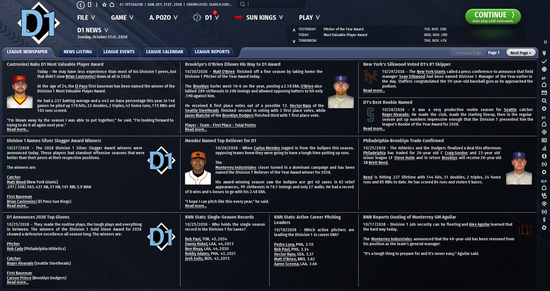 MVP: Brian Castrovinci, 1B, El Paso Sun Kings A clear, unanimous choice - Castrovinci announced himself as the next big star of the NABF this year with a massive campaign, nearly winning the Triple Crown while hitting 43 homers and driving in 115 runs in his first full season at age 24. He was easily the driving force behind El Paso’s championship season, and even won the Championship Series MVP. The sky is the limit for him. Pitcher of the Year: Matt O’Brien, SP, Brooklyn Dodgers Though it was his teammate Blanche who ultimately set the single season strikeout mark, O’Brien was actually ahead of him on that leaderboard at the time of his season-ending injury in late August. O’Brien had a remarkable breakout season in 2038, which would have been even greater had he remained healthy. Despite setting the all-time NABF strikeout mark as well as the D1 single-season WAR mark and leading the Division in FIP, Jason Blanche somehow got just a single first place vote. Rookie of the Year: Roger Alvarado, C, Seattle Steelheads Another clear choice. Alvarado has announced himself as the successor to D1’s great catchers Matt Wood and Mike Kepler, with a season that eclipsed them both. Not only did Alvarado burst onto the scene with 32 homers - a rookie catcher record - but he also took home a Gold Glove in his first season. Reliever of the Year: Carlos Mendez, CL, Monterrey Industriales Mendez saved 40 for a club that hovered around the .500 mark all season, striking out 31.3% of his batters while using his outstanding fastball/circle change combo to keep the ball on the ground. Silver Sluggers: C - Matt Wood, NYG 1B - Brian Castrovinci, ELP 2B - Andrew Fitts, NYG 3B - Josiah Morgan, PHA SS - Matt Galante, SEA LF - Dane Best, BRO CF - Benni Phillips, TOR RF - Mike Hood, SEA DH: Clemens Young, DEN Gold Gloves: P - Rob Cady, PHA C - Roger Alvarado, SEA 1B - Carson Prince, BRO 2B - Seth LaBarr, TIJ 3B - Perry Copenhaver, CHI SS - Mike Burcham, NYG LF - Jason Burditt, MRY CF - Joel Gamble, MRY RF - Mike Hood, SEA Batting Leaders Batting Title - Aaron Soucy, TMP: .337 Home Run Title - Donovan Bryant, DEN; Brian Castrovinci, ELP; Carson Prince, BRO: 43 RBI Title - Brian Castrovinci, ELP: 115 Stolen Base Title - Joe Rison, ELP: 44 On Base Percentage Title - Brian Castrovinci, ELP: .443 WAR Title - Brian Castrovinci, ELP: 8.3 Pitching Leaders Wins Title - Jeff Baltimore, SEA; Doug Kluz, LAA: 20 Strikeouts Title - Jason Blanche, BRO: 337*^ ERA Title - Matt O’Brien, BRO: 2.18 FIP Title - Jason Blanche, BRO: 2.42 Saves Title - Carlos Mendez, MRY: 40 WAR Title - Jason Blanche, BRO: 8.8* *represents Division record ^represents all-time NABF record Last edited by ArquimedezPozo; 02-23-2023 at 11:12 PM. |