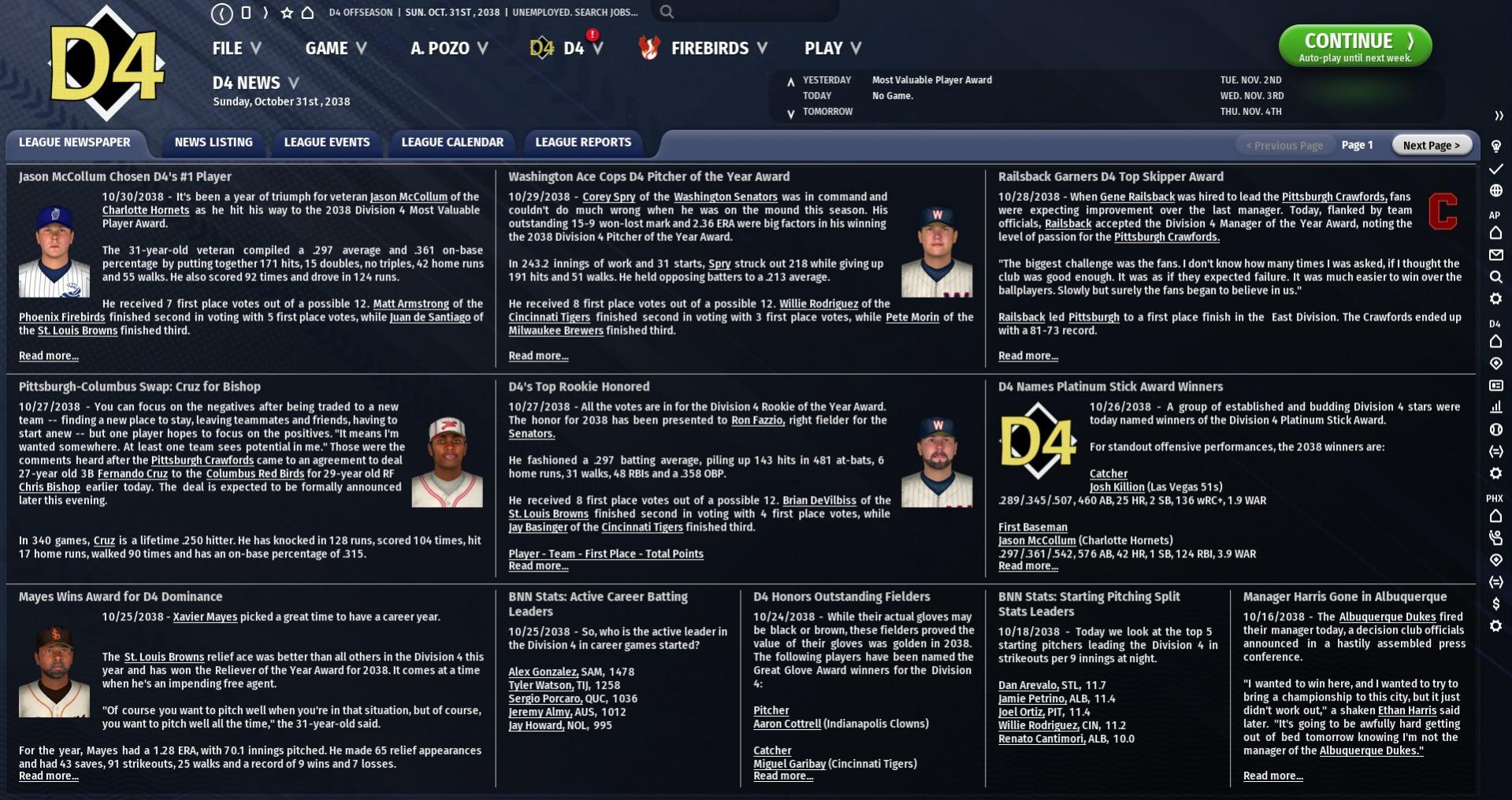 MVP: Jason McCollum, 1B, Charlotte Hornets McCollum was a bit of a surprise pick over Phoenix’s Matt Armstrong, but a good one: the Charlotte slugger hit 42 homers to lead D4 this year (the next highest total was 29), with a .297/.361/.542 line and a 3.9 WAR. McCollum was at his best as Charlotte nearly overtook Pittsburgh for the D4 East lead in late August. Pitcher of the Year: Chris Spry, SP, Washington Senators Spry quietly put together a great season, winning 15 with a D4 best 2.36 ERA and 0.99 WHIP to go along with a 2.73 FIP. The southpaw allowed only 8 homers in over 240 innings of work, a 0.3 HR/9. Rookie of the Year: Ron Fazzio, RF, Washington Senators Fazzio won the award over St. Louis SS Brian DeVilbiss with a .297/.358/.457 line, knocking 41 doubles in his age 24 season, his first in the bigs. Reliever of the Year: Xavier Mayes, CL, St. Louis Browns Bob Paul got a lot of press this season, and had an incredible year, so it may have been something of a surprise to see Mayes win this unanimously. But D4 voters saw how automatic he was for the Browns, with 43 saves, 91 Ks, and a 1.28 ERA in 70 innings. Silver Sluggers: C - Josh Killion, LVG 1B - Jason McCollum, CHR 2B - Matt Armstrong, PHX 3B - Jesse Basile, LVG SS - Brian DeVibliss, STL LF - Ernesto Gonzales, CHR CF - Brandon Murell, PHX RF - Randy Ahern, ALB DH - Phil Holdredge, HAV Gold Gloves: P - Aaron Cottrell, IND C - Miguel Garibay, CIN 1B - Jim Zaro, CIN 2B - Jesus Rivas, SAM 3B - John Davis, MIL SS - Brian DeVibliss, STL LF - Doug Jagger, PIT CF - Josh Parsons, MIL RF - Mauricio Lopez, STL Batting Leaders: Batting Title - Ernesto Gonzales, CHR: .344 Home Run Title - Jason McCollum, CHR: 42 RBI Title - Jason McCollum, CHR: 124 Stolen Base Title - Danny Aviles, LVG: 34 On Base Percentage Title - Juan de Santiago, STL: .388 WAR Title - Matt Armstrong, PHX: 6.0 Pitching Leaders: Wins Title - Mario Caudillo, SAM; Dale Milewski, STL: 18 Strikeouts Title - Nate Mefford, IND: 294* ERA Title - Corey Spry, WAS: 2.36 Saves Title - Xavier Mayes, STL: 43 WAR Title - Willie Rodriguez, CIN: 7.1 *represents Division record |