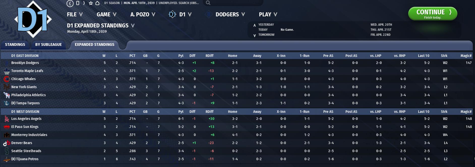 Division 1 Toronto had a 4-2 week that ended with a statement sweep of El Paso as they rose to the top of the D1 East. That run has been driven in large part by starter Raul Roman, who is 3-0 in his three starts with a 1.59 ERA. Brooklyn, New York, and Chicago are all a game back of Toronto’s pace at 7-6, while Philly and Tampa are two back; no team has outscored or been outscored by more than ten runs in a very even Conference so far. That’s less true in the West. LA and Monterrey ar both at 9-4, with LA putting on batting practice nightly: the Angels have scored 82 runs already in their 13 games, a rate of over 6.3 per game. That’s almost certainly unsustainable, but this is clearly a strong offense breaking out. Monterrey, meanwhile, has excelled everywhere: Chase Maze has rediscovered his power stroke with six homers, though he’s getting on base at a dreadful rate. Despite two of the best hitting performances so far in Brian Castrovinci and Player of the Week Eddie Rutter, El Paso and Denver are tied three games back at 6-7. Seattle continues to have a slow start at 5-8, while Tijuana is imploding - 2-11 after a franchise-first last place finish last year. Player of the Week: Eddie Rutter, 2B, DEN: .435/.462/.739, 1 HR, 8 RBI Top Hitters: Zach Breland, C, TOR: .385/.467/.692, 1 HR, 3 RBI Ryan Haymes, 3B, LAA: .471/.500/.765, 1 HR, 3 RBI Adrian St. Germain, 1B, TMP: .474/522/.789, 1 HR, 8 RBI Top Pitchers: J.D. Matherne, SP, PHA: 9 IP, 0.00 ERA, 0.98 FIP, 12 K John Hummel, SP, CHI: 16.1 IP, 2.76 ERA, 3.07 FIP, 13 K Jon Sayre, SP, NYG: 9 IP, 1.00 ERA, 2.98 FIP, 14 K League News