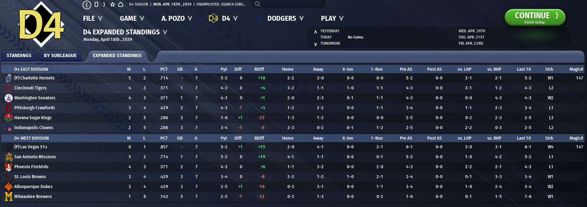 Division 3 A surprising Columbus continues its worst-to-first early season, with a +20 run differential and an 8-5 record powered by HR leader Ricky Ponce. Four teams sit two games back at 6-7: Memphis, Nashville, Cleveland, and Miami, where Paul Herrin is now 0-3 with a 6.08 ERA and a concerning drop in K rate. Atlanta brings up the rear at 5-8, three games back. After their surprising first place finish last year, many expected St. Paul to regress this year, but they’ve done anything but: the Saints are 10-3 with a D3-best +34 run differential driven by outstanding starting pitching from Jon McNayr and Felipe Esparza. Jerry Dudek will be out until early May. At 8-5, Austin has been crushing the ball and Masahiro Nakanishi is building on his stellar Rookie of the Year campaign with a 0.39 ERA through three starts. Calgary, Salt Lake, and San Francisco are at 6-7, while Portland trails at 5-8. Player of the Week: Corey Schofield, 3B, MEM: .455/.520/.1.045, 3 HR, 6 RBI Top Hitters: Ricky Ponce, RF, CMB: .381/.440/.952, 3 HR, 6 RBI Jerry Easter, RF, SLC: .421/.500/.895, 2 HR, 8 RBI Jake Rackley, 2B, AUS: .474/.500/.789, 1 HR, 3 RBI Top Pitchers: Masahiro Nakanishi, SP, AUS: 16.1 IP, 0.00 ERA, 2.30 FIP, 15 K Rob Cady, SP, SLC: 9 IP, 0.00 ERA, 1.08 FIP, 11 K Cody Garrett, SP, MEM: 9 IP, 0.00 ERA, 2.30 FIP, 7 K, 2 HA Division 4 Cincinnati and Washington have each won four straight, and top the division - Cincy at 9-4, Washington at 8-5. Cincinnati 2B Pat Grimes has been outstanding early, driving the Division’s best offense. Indianapolis is in third behind a resurgent Aaron Cottrell (2.89 FIP) and a devastatingly good Greg Smith, whose command of his knuckler has come into its own. Havana and Charlotte are both 6-7, while Pittsburgh is off to a slow beginning in a year where it needs to win, with a shot at its first promotion. The biggest story in D4 so far though has been the Las Vegas 51s, who won 9 in a row before losing Sunday for only the second time this season; they have the NABF’s best record at 11-2, though they’re 6-1 in one run games and playing a couple games above their heads. San Antonio has the best expected record in the Conference - 9-4, which matches their actual record - led by the Division’s best starting rotation and the strong start of 3B Justin Gulden. There’s a gap between San Antonio and third place Phoenix, at 6-7. Albuquerque and St. Louis share 4-9 records, while Milwaukee has struggled at 3-10. Player of the Week: Kevin Kersey, LF, MIL - .565/.593/.1.087, 3 HR, 11 RBI Top Hitters: Phil Holdredge, LF, HAV: .389/.522/.889, 3 HR, 6 RBI Matt Armstrong, 2B, PHX: .400/.455/.750, 2 HR, 7 RBI Jamie Parnell, SS, WAS: .476/.560/.667, 3 RBI, 4 R Top Pitchers: Chris Scott, SP, PIT: 9 IP, 0.00 ERA, 2.96 FIP, 6 K Bill Lorentz, SP, SAM: 8 IP, 1.12 ERA, 2.75 FIP, 8 K Dan Arevalo, SP, STL: 7.1 IP, 2.45 ERA, 2.53 FIP, 12 K |
