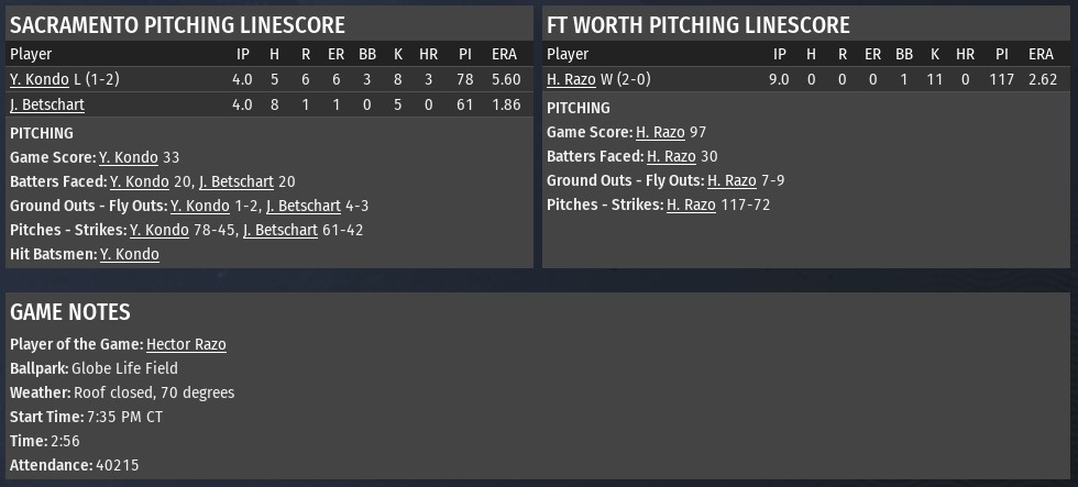 So Long Solons: Razo Sends Sacramento Packing With First Career No-Hitter in 7-0 Cats Win Hector Razo has arrived in Division 2: Ft. Worth’s new ace dropped a sterling no-hit, 11 strikeout performance on Sacramento as the Cats cruised to a 7-0 win. Though Yusuke Konda looked sharper than Razo in the first, striking out three while Razo nearly allowed a hit in the first. In the second, though, Razo got through the second on an economical 8 pitches, and Ft. Worth struck its first blow, with a two run homer by DH Mike McGurkin. Lorenzo Tapia hit another two run bomb in the third to score Moeller, while Razo remained perfect the first time through Sacramento’s order. Gregg Gaddis broke up the perfect game, reaching on an error by Aaron Hylton in the 4th, but Razo set down the side otherwise. He was perfect in the fifth as well, and that’s when people started to really notice. SS Yukinobu Hasegawa hit the Cats’ third two run shot in the bottom of the fifth and his teammates scored another on a series of singles, s with a low-pressure 7-0 score behind him, Razo came out for the sixth. The only real mistake of his night came on a four pitch walk to Randy Foti, and he cruised from there, striking out the side in a 1-2-3 seventh and striking out two more in a 1-2-3 eighth. The ninth started scarily for Ft. Worth, as Aaron Hylton - who had arguably saved the no-hitter before it began with a great play in the first - made his second error, allowing Curtis Shorter to reach to lead off. But Razo was unflappable: He struck out Randy Foti on a devastating changeup that buckled the hitter’s knees, and then got Gregg Gaddis on a sharp grounder to third. Danny Dautel stepped to the plate and offered at a first-pitch cutter; he didn’t get it squared up, and lifted it lightly to right, where it settled into Angelo Torres’ glove for the final out. Razo threw his arms in the air, then caught C Russ Michael, who leapt into his arms ahead of the pile - a great early moment for a young, hungry team, and a feather in the cap of one of the game’s most accomplished pitchers. |