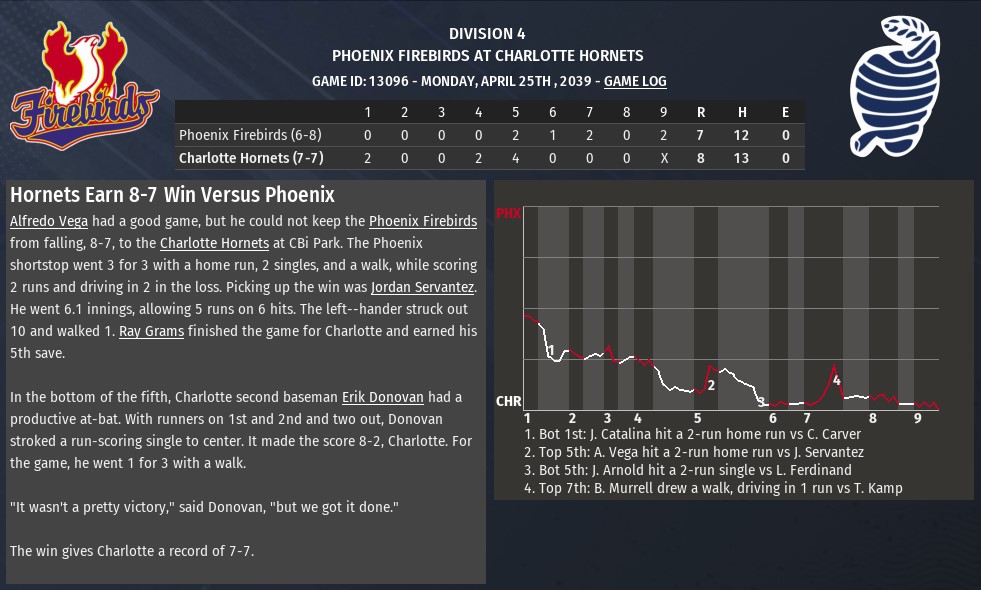 Division 4 Charlotte and Cincinnati, for the moment at least, are the class of the D4 East. They’re both 12-8 with a +17 and +18 run differential, respectively. Charlotte’s Jason McCollum hasn’t quite gotten back to last year’s MVP level yet, and he had his season interrupted by a four game suspension following a brawl against Phoenix in late April. Ernesto Gonzles, too, has struggled: the 4x defending batting champion is hitting just .295. Cincinnati, meanwhile, has responded to losing Willie Rodriguez in the offseason by scoring more runs than any other team in D1. Washington is a game back at 11-9, though they’ve been outscored on the season. Pittsburgh was 4-3 over the week and may be coming around, as Joel Ortiz has had a couple good starts in a row while three additions - Chris Bishop, Donovan Bryant, and Gi-cheng Miao - all have four homers. Also at 9-11 are Havana and Indianapolis, where young knuckleballer Greg Smith is off to an exceptional start. In the West, Las Vegas continues its reign of terror: the 51s were “just” 4-3 this week, bringing them to 15-5, two up on San Antonio. Young SP Chad Mealey continues to pitch well in the early going after a move to the rotation: he has struck out 34 in 31 innings and has a 2.30 ERA. Tim Sicinski has already clubbed 7 homers, while closer Ryan Monday has 11 saves in 11 games and has yet to give up an earned run. San Antonio’s strong rotation has kept them in the race at 13-7, led by starters Bill Lorentz and Justin Hensen, while Ron Golden and Justin Gulden lead on offense. 3B Kevin Fitzpatrick, who came over from St. Paul in the offseason, has been fantastic over the first three weeks for Albuquerque, who are four back at 11-9. It’s a long drop from there to the 7-13 Firebirds, while the Brewers and Browns are both 9 back already, at 6-14. Player of the Week: Kevin Fitzpatrick, 3B, ALB: .500/.533/.857, 1 HR, 12 RBI, Cycle Top Hitters: Sukehiro Sakamoto, LF, SAM: .480/.536/.960, 2 HR, 8 RBI Kevin Kersey, LF, MIL: .364/.440/.773, 3 HR, 5 R, 5 RBI Alex Rodriguez, SS, CIN: .400/.419/.600, 1 HR, 6 R Top Pitchers: Joel Ortiz, SP, PIT: 8 IP, 0.00 ERA, 1.15 FIP, 11 K, 2 HA Chad Mealey, SP, LVG: 8.1 IP, 1.08 ERA, 1.73 FIP, 9 K Nate Mefford, SP, IND: 8 IP, 0.00 ERA, 1.78 FIP, 10 K League News