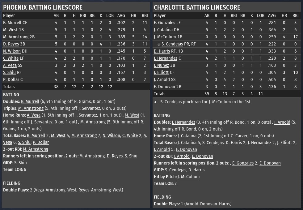 Punches, Baseballs Fly As Charlotte Holds Off Firebirds 8-7 This was a game that had everything, from late-inning drama to early dramatics, as Charlotte survived a critical ejection and held off a late Phoenix surge to win 8-7 and even their season record at 7-7. After a quiet top of the first, the bottom of the inning got exciting quick. A four-pitch leadoff walk to Ernesto Gonzales brought 2B Josh Catalina to the plate, and Catalina drilled the second pitch he saw 426 feet to left center field. Catalina admired it, and under Carver’s gaze he jogged slowly around the bases before making what appeared to be a gesture at Carver after crossing the plate. Carver stared him all the way back into the dugout, but nothing else developed in that moment. That changed fast with the next pitch, which ran up into Jason McCollum’s ribs. McCollum, interpreting it as payback for Catalina, began yelling and walking out toward Carver. The Phoenix pitcher ran at him and the two exchanged blows before teammates and coaches arrived to pull them apart. It took several minutes to clear the field, during which McCollum and Carver were both ejected. With a pinch runner at first for McCollum and a new pitcher, Robbie Bond, in for Carver, the inning ended quickly: Dylan Harris grounded into a double play and Javier Hernandez grounded to second. But the excitement still buzzed in the stands, even with Charlotte up 2-0. Despite a couple of hits including a Matt Armstrong triple off Charlotte starter Jordan Servantez in the 4th, the 2-0 score held until the bottom of the 4th inning. With Bond still pitching, Dylan Harris singled, and went to third when Javier Hernandez doubled. A wild pitch scored Harris and put Hernandez on third, from where he scored a batter later on a Josh Elliott grounder to make it 4-0 Charlotte. In the top of the fifth, though, Phoenix struck: Craig White singled in front of Antonio Vega, who worked a full count before launching a ball into left field that cleared the wall with plenty to spare. With the umpires on full alert, Vega tossed his bat and yelled toward his own dugout, but otherwise kept things civil as his team cut Charlotte’s lead in half. But Charlotte came back with a vengeance in the bottom of the inning: Santos Cendejas, who had come into the game to pinch run for McCollum, singled and went to second on a wild pitch to Dylan Harris. Harris then singled putting the runner on third. Bond was lifted for Lamar Ferdinand, who did induce a ground ball from Javier Hernandez, but the run scored on the play to make it 5-2 Charlotte. A walk to Jose Nunez and a single by Elliott loaded them up. With the bases jammed, SS James Arnold hit a laser beam through the 5-6 hole and into left field, scoring two, and an Erik Donovan base hit added a fourth in the inning to make it 8-2 Charlotte. Matt West homered for Phoenix in the 6th, though, and Phoenix added two more int the 7th when Phil Dollar singled with the bases loaded, and Brandon Murrell walked to score another. 8-5. That’s where it stayed until the 9th inning. Dollar grounded out, but Murrell slashed a double over the head of Charlotte CF Elliott. Matt West popped it up, though, for the second out. That brought up Matt Armstrong, and the Phoenix 2B hit the game’s fourth - and final - homer to right center, scoring two and bringing the Firebirds within a run. Bryan Garcia bore down, though, and was able to get Dave Reyes swinging on a 2-2 slider to end it. |