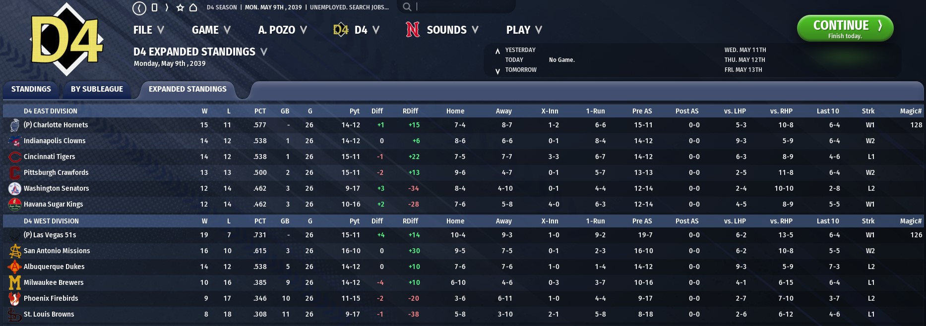 Division 1 The New York Giants greeted May with a 5-1 week, winning five straight against Denver and Seattle before getting run over by Carson Prince on Sunday. New York is now in the top spot in the East, and has reclaimed their spot atop the runs scored list. Their rotation has stabilized somewhat as Willie Rodriguez and Jon Sayre have started well, but Rich Buxkemper has been getting hammered, and is now 1-2 with a 7.48 ERA. Just behind New York is Toronto, at 14-12 with the best starter ERA in the Division: youngster Danny Mortimore has been fantastic behind Raul Roman’s hot start. Brooklyn and Chicago are tied at 13-13 as Carson Prince heats up for the Dodgers; Jason Blanche has also been outstanding, but the club is starting to feel Matt O’Brien’s absence, and are concerned about the arm of young CF Adam Slagle, who is having tests done after coming up in pain following a throw to nail a runner at home in the first inning of Sunday’s game. Slagle has been off to an amazing start and his loss would be another big one for Brooklyn. Tampa is in fifth at 12-14, while Philadelphia is in last after a 2-5 week. The Monterrey Industriales continue to hold, albeit tentatively, to their lead in the West. They’re 17-9 and enjoying a strong run by their pitching staff, including a combined 26 scoreless innings from relievers Eduardo Lopez and Alexis Salinas, and closer Carlos Mendez. Los Angeles, though, is not far behind with a great rotation featuring Doug Kluz, Kenny Trent, and Nick Book, and a top three offense. Seattle and El Paso are tied for third, but El Paso should be getting ace David Matthews back soon after a brief shelving due to a blister on the index finger of his pitching hand. Denver and Tijuana share last place at 10-16, but went in very different directions this week: Denver lost six straight, while Tijuana was 4-2 including a couple of wins over Monterrey. Player of the Week: Carson Prince, 1B, BRO: .421/.577/.1.105, 4 HR, 6 R Top Hitters: Ken Conroy, LF, TOR: .333/.360/.958, 4 HR, 10 RBI Jason Burditt, LF, MRY: .474/.524/.947, 2 HR, 4 RBI Alex Parga, RF, NYG: .320/.414/.800, 3 HR, 8 RBI Top Pitchers: Toshio Nimiya, SP, SEA: 16 IP, 0.56 ERA, 2.15 FIP, 17 K, 2 W Rodrigo Cardoso, RP, ELP: 9 IP, 0.00 ERA, 0.97 FIP, 13 K, 3 HA, 1 W in spot start Doug Kluz, SP, LAA: 9 IP, 2.00 ERA, 1.53 FIP, 12 K, 1 W League News
