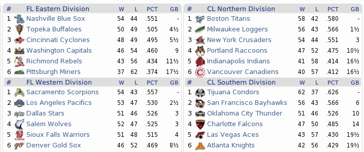 While the Bayhawks were not quite as atrocious at the plate as the Raccoons, their 10th-ranked offense certainly held them back in their quest for the CL South title. Their pitching was front page caliber, and their rotation was 2nd only to the Coons’. Projected matchups: Manuel Movonda (8-7, 2.55 ERA) vs. Kenny Frye (5-6, 4.14 ERA) Randy Farley (8-4, 2.75 ERA) vs. Rafael Lopez (4-6, 5.65 ERA) Miguel Lopez (6-10, 4.43 ERA) vs. Tony Hamlyn (8-8, 2.80 ERA) Hamlyn will be the first left-hander we’ll face in over a week. This week will be the centerpiece of a 13-day stretch of games, so Neil Reece could have the middle game off, unless Buell gets rested first. Those two are basically the only players out there every day now. Game 1 POR: 3B Crowe – SS Guerin – CF Reece – LF Buell – 1B Wedemeyer – C Turner – 2B Caddock – RF Villegas – P Movonda SFB: LF D. Woods – C G. Ortíz – RF P. Perez – 2B Chandler – CF Marquez – 1B Cavazos – 3B J. Gomez – SS Powys – P Frye Neither starter was any good. Both allowed six hits through three innings, and while Movonda at least got a few strikeouts to hold the damage to one run, Frye was also wild and the Coons were up 3-1, although that lead went down to 3-2 in the fourth with a Jorge Gomez home run. Frye continued to suck, but the Raccoons sucked more and failed to topple him. In turn, Movonda was battered in the fifth. It started innocently (rather) with a pitch into Pedro Perez’ triceps, but the Bayhawks rapped off doubles to plate three runs in the inning. The Atrocicoons left the bases loaded (with one out) in the sixth, and that sealed Movonda’s fate, who pitched to one more batter in the sixth, resulting in Bayhawks hit #11, then was removed. Donis was kind enough to wave the runner home. The Raccoons once more left two runners in scoring position en route to a bitter loss. 6-3 Bayhawks. Guerin 2-5; Reece 2-3, 2 BB; Caddock 2-4, 2B, 2 RBI; Fairchild 2.0 IP, 0 H, 0 R, 0 BB, 3 K; Clyde Brady was revealed to have suffered a foot contusion and would require two weeks of rest. This is best done on the DL. And so Jason Kent returns once more. Game 2 POR: SS Guerin – 2B Caddock – CF Reece – 3B Crowe – 1B Wedemeyer – C Turner – LF Newton – RF Villegas – P Farley SFB: LF D. Woods – C G. Ortíz – 1B Carroll – RF P. Perez – 2B Chandler – CF Marquez – 3B P. Hernandez – SS Powys – P R. Lopez Randyboy made the cardinal error of allowing a 2-out, 2-run double to the opposing pitcher, even while knowing that his team sucked hard. That happened in the second, and the Raccoons didn’t even reach base until the fourth, when Guerin hit an infield single. Caddock instantly hit into a double play, before Reece and Crowe singled. That brought up Wedemeyer with two out, an instant burial for any inning. Well, except this one. Wedemeyer reconquered the elitist .200 mark for his batting average with a towering 3-run homer to right center. Yet, this didn’t ease Rafael Lopez’ suffering. Turner singled. Newton walked. And Villegas unleashed the next 3-run bomb. When Farley made it seven straight batters reaching base with a liner up the middle for a single, Lopez was yanked, and Guerin lined out to Pat Chandler. The Bayhawks had a choking grip on Farley in the fifth, but a heroic play by Villegas bailed him out with only one run across for a 6-3 score. He then pitched a perfect sixth before being hit for in the top 7th. From here, the Raccoons got scoreless relief from Miller, De La Rosa, and Costa, while they also hung a 3-spot on Johnny Smith in the eighth. 9-3 Raccoons. Turner 2-4, 2B, 2 RBI; Villegas 2-3, HR, 3 RBI; Game 3 POR: 3B Crowe – SS Guerin – CF Reece – LF Buell – C Castillo – RF Newton – 2B McLaughlin – 1B Utting – P M. Lopez SFB: CF Marquez – C G. Ortíz – 1B Carroll – 2B Chandler – 3B P. Hernandez – SS Powys – RF D. Woods – LF M. Rodriguez – P Hamlyn The first three Furballs all hit singles, plating two runs in the first inning against Hamlyn. However, Lopez was borderline awful from the start, too, and the Bayhawks got one run right back off him. And the Raccoons were the Raccoons, having runners in scoring position in the third inning with nobody out – and didn’t score with pop outs by Reece and Buell, and Castillo struck out. The highlight of the game came in the bottom 3rd, as Guerin made a tremendous leaping grab on Alfredo Marquez’ line drive to rob him of a hit. Even the home fans had to acknowledge him jumping up about four feet from a stand. It barely held a win bid together for Lopez, who was on the verge of losing it in the sixth. Still in a 2-1 game, he loaded the bags with one out and was hooked. Tamburrino came in with the volcano bubbling chunks of magma already, struck out Mike Powys, and Dan Woods unleashed a soft pop to Reece to end the inning. Miller and De La Rosa pitched scoreless innings, and while the Raccoons continued to step in at the plate in the top halves of innings, they merely did so to satisfy the rule book, but didn’t long to achieve anything. Scott Wade entered the 2-1 game in the ninth, allowed a 2-out double to Marcos Rodriguez, and then served a huge fly to Ramiro Cavazos into deep center. Neil Reece tore out an arm and a leg to get there – and luckily did. 2-1 Raccoons. Crowe 2-4; Reece 2-4, RBI; Tamburrino 0.2 IP, 0 H, 0 R, 0 BB, 1 K, IR 3-0; For bad news, Stephen Buell suffered a hamstring strain in the course of the game while turning first base and will unfortunately miss most of the remaining season. Six weeks is the number flung around by the medical staff. Yay, WAY TO GO. While Buell was heading for the DL for the third time this season, we called up 24-year old Mark Kowalchuk from AAA. Our second round pick from 1992 was not having a good year in AAA, but then again, that AAA team was getting mauled pretty badly by the competition… He was merely OPS’ing .623, but the season had long passed the point 