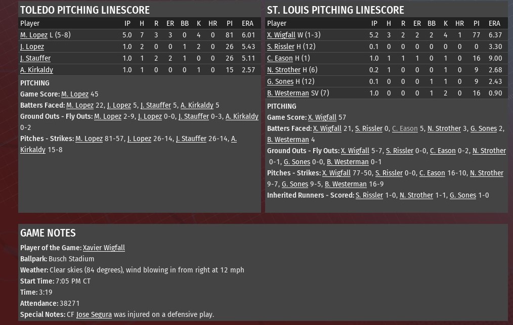 St. Louis finally got a decent start from Xavier Wigfall, who worked five shutout innings before giving up a two-run home run to Toledo's Chris Gibbs, and the River Walkers went on to win 5-3 at Busch Stadium (2006). Coming off Tommy John surgery, Wigfall had a rough first three starts before this one. The Gibbs home run made it 3-2 River Walkers. Wigfall (1-3) ended up going 5.2 innings, allowing the two runs on three hits. He struck out four and walked two. St. Louis jumped out to a 1-0 lead against Mud Hens starting pitcher Martin Lopez in the bottom of the third. The Walkers banged out three straight singles, from Wigfall, Bob Saavedra and Jackson Miller, his driving in the run. The St. Louis lead expanded to 3-0 in the fifth. Izaac Pacheco led off with a single, and moved to second on a Wigfall bunt. Saavedra singled again, putting runners at the corners. Miller drove in Pacheco with a fly ball. Jose Segura followed with a double to score the inning's third run. It's lead down to 3-2, the Walkers went back up by three in the bottom of the seventh. Segura tripled with Miller on first. Nick Shaw drove in Segura with a fly ball to right off Josh Stauffer. After Wigfall left with one out in the sixth, St. Louis used five relievers to close out the game. Scott Rissler faced just one batter, to end the sixth. Rookie Chris Eason made his debut with a silent seventh. He did come out for the eighth and allowed a lead-off single. Nick Strother (0.2 IP) and Greg Sones (0.1) combined to make sure that run did not score. Bobby Westerman rebounded from his first bad outing as a Walkers, with a scoreless ninth for his seventh save. |