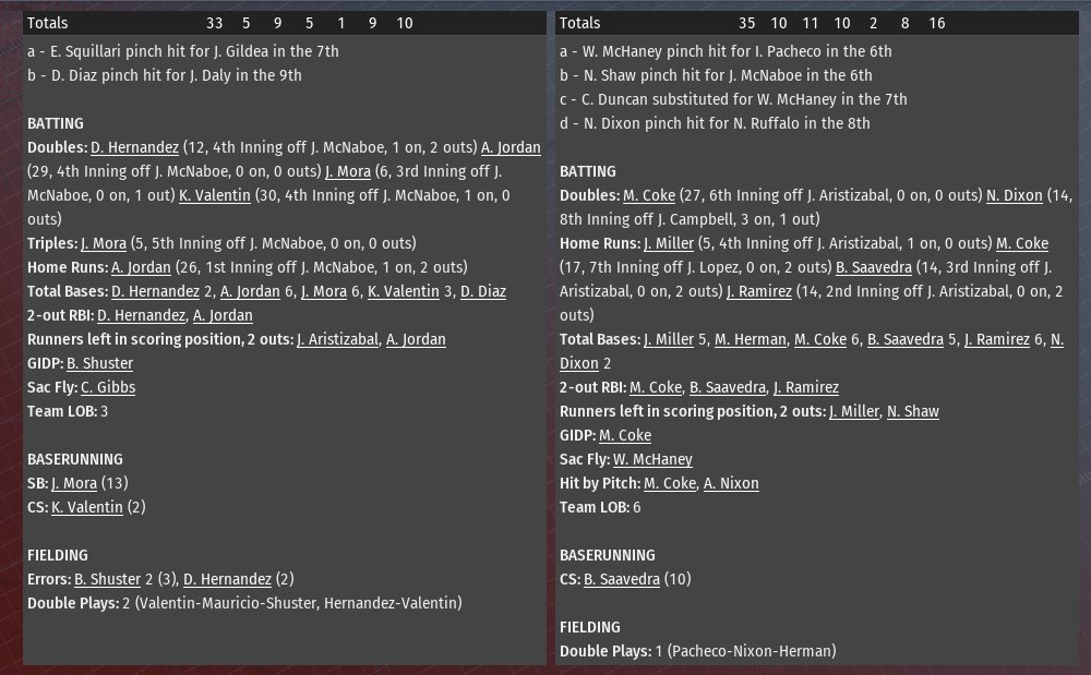 Connor Walsh hit a three-run home run off Scott Rissler with one out in the bottom of the ninth inning to give Chicago a 7-4 win over St. Louis at Wrigley Field (1938) Rissler got Danny Gutierrez to ground out to open the bottom of the ninth. But he followed that with a walk to Tony Nolasco and a double by George Phelps. That brought Walsh to the plate, and he crushed a 3-2 pitch 372 feet over the left-field wall for his 15th homer of the season. The River Walkers had tied it 4-4 in the top of the ninth. Hector Tavarez singled with one out off Juan Gomez and scored on a Jose Ramirez double. At one point, St. Louis had been down 4-0 but had rallied to tie it. G-Men starting pitcher Greg Sadler went 5.2 innings, and didn't allow a run on three hits. He struck out four and walked one. Jeremy Bouchard finished the sixth and got the first two outs of the seventh. Gomez finished the seventh and gave up a run in the eighth. Chicago closer Bill Webb (4-7) could not convert the save, but it did allow him to earn the win. Last edited by rink23; 09-23-2021 at 05:56 AM. |