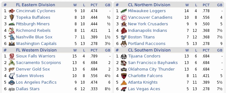 Also, in a twist of events, world news and the complaints and stuff section will front this update. You will understand come Sunday. Complaints and stuff Today in your favorite soap opera “Bad News from the Coons Farm”: SP Nick Brown has suffered a ruptured ulnar collateral ligament. No 11th round to the majors, at least not this year, and with the time frame for recovery of “one year and up”, it may not be next year either. Why are we even trying …? Our old friend Jason Turner was on waivers early in the week, as he was pitching to a 1-3, 5.77 ERA tune this season. The Pacifics were using him in a swing man role, something I don’t think he’s made for, and he was swamped completely by a .405 BABIP. Although I would love to make an upgrade over Rivera in the rotation and to get our old friend Jason back home, I’m afraid we can’t swallow the $1.06M he’s due or rather the share of that for the remaining 4 1/2 months of the year. Our budget room was projected to be $548k at this point, and we haven’t drafted yet. Anyway, he was not claimed by anybody and assigned to the Pacific’s AAA team, the Loganville Bombardiers. Neil Reece wants to talk contract, which makes me squeal like a happy piglet. However, I fear he might want many millions… He’s gonna be 34 next year, but I think we might be safe on a 4-year deal. I wouldn’t want to go higher, though. Moneywise, I fear we might have to part with up to $6M to get this deal done. Given the escalating salaries all over the league, $5M would be cheap. No idea where I would fit $1.5M into the budget next year. It is *actually* only $400k more than he makes now, but you know Uncle Scrooge in Mexico, right? Also, one correction: I mentioned before that Neil Reece, Daniel Miller, and Scott Wade were our last World Series heroes from the Good Days in Coon City™. This is not quite true, or rather only true for the *1992* championship. Miguel Lopez is the fourth player to hold a share in the *1993* championship. He made his debut in ’91, actually, but only pitched two games in ’92 and was not on the playoff roster. (Then again, Neil Reece played in a grand total of one playoff game(s) in the two successful title runs, missing the 1992 playoffs entirely and going down in the first game of the 1993 playoffs – both times due to injury – but he was physically present at least.) In other news May 15 – BOS MR John Bennett (1-0, 1.80 ERA, 4 SV) strained an oblique while legging out a single in an extra-inning effort against the Raccoons, and will miss about six weeks. May 17 – WAS SP Steve Rogers (2-4, 5.30 ERA) keeps getting hurt every season. The 27-year old southpaw has ruptured a finger tendon and could miss as much as four months. May 19 – Condors SS/2B Juan Barrón (.337, 1 HR, 20 RBI) is setting examples in consistency, having contributed hits in 20 straight games. May 21 – The Miners expect SP Manuel Pineda (3-3, 4.32 ERA) to be out for the year with a torn labrum. May 21 – Juan Barrón is held dry in a 5-1 win over the Canadiens, ending his streak at 21 games. Raccoons (14-22) @ Crusaders (19-18) – May 16-18, 2000 A first rate rotation (something nobody had seen coming before the season) the Crusaders prevailed despite anemic offense. In a way, they were playing the low-score ball of the Indians teams of the 1980s. First in runs allowed, last in runs scored, with a +12 differential. Projected matchups: Miguel Lopez (2-4, 5.00 ERA) vs. Ramiro Gonzalez (4-3, 1.82 ERA) Bob Joly (0-0) vs. Cipriano Miranda (3-1, 3.31) Ralph Ford (2-2, 3.71 ERA) vs. Anibal Sandoval (5-2, 3.08 ERA) Yeah, good luck beating that array. Also, the Indians lost on Monday, so we came into the series in fifth place in the standings. Game 1 POR: SS Guerin – 2B Ingall – CF Reece – 3B C. Gonzalez – RF Brady – C Mata – LF Richardson – 1B Michel – P Lopez NYC: RF J. Gonzales – 2B Brantley – C Manuel – LF A. Johnson – 3B Rush – 1B T. Mullins – SS Rigg – CF A. Diéguez – P R. Gonzalez Miguel Lopez again demonstrated that he would be best written off entirely, as the Crusaders romped over him with ease, scoring one (unearned) run in the first, and five more in the second, which were all earned. With the Raccoons hitless at that point, I went to get ice cream. When I had had my fill, we were in the sixth, the Coons had managed four weak singles, and one run on a groundout by Reece. After three innings of shutout relief, the Crusaders hit four singles off Fairchild in the bottom 6th, two of which didn’t leave the infield, and upped the score to 8-1. It was a nightmare, but like most nightmares (except the big, general nightmare that it was to manage this squad of pickles) it eventually ended, even if in total disgrace. 8-2 Crusaders. Game 2 POR: SS Guerin – RF Brady – CF Reece – 3B C. Gonzalez – LF Richardson – 2B Ingall – C Mata – 1B Michel – P Joly NYC: RF J. Gonzales – 2B Brantley – LF A. Johnson – 1B M. Berry – CF Latham – 3B Rush – C Olsen – SS Rigg – P Miranda Guerin doubled home the first run of the game in the third. While I had expected Joly to get tied to a rocket and fired into the sun by the Crusaders, quite the opposite happened. The Crusaders failed to get a hit off Joly, and not only for three innings, but for four, five, six … the Raccoons upped to 3-0 in the top 6th with a big part in that being a Richardson RBI triple. The Coons added two in the top 7th, 5-0, while Joly issued a leadoff walk to the first of the three left-handers in the heart of the New York lineup, Johnson. Berry struck out, and then Latham hit one right to Guerin, 6-4-3 zip, seven innings, no hits. Bottom 8th: Bob Rush flew out to center. Mike Olsen grounded to Guerin for the second out. Ed Rigg ripped into a 2-2 pitch and lined to right, but almost exactly into Samy Michel’s glove. What was going on here!!?? With the bottom falling out of the Crusaders’ invincible bullpen and the scor
