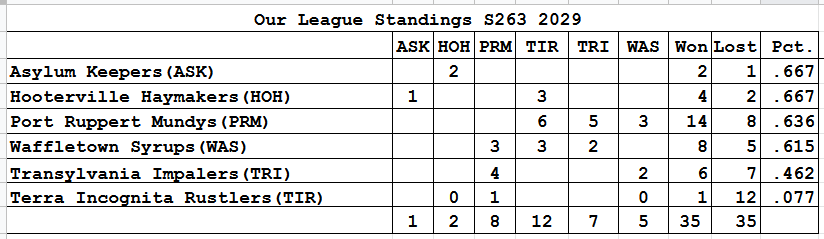 With the bulk of their OL schedule remaining, the Haymakers continue to set the pace with Port Ruppert and Waffletown awaiting any stumble. In PT play, Hooterville and Asylum still hold division leads in the AC, while Waffletown and Transylvania have slipped just out of the wild card spots in the NC. Port Rupert and Terra Incognita have fallen off the radar, although the Rustlers have escaped the relegation zone by a couple of games.