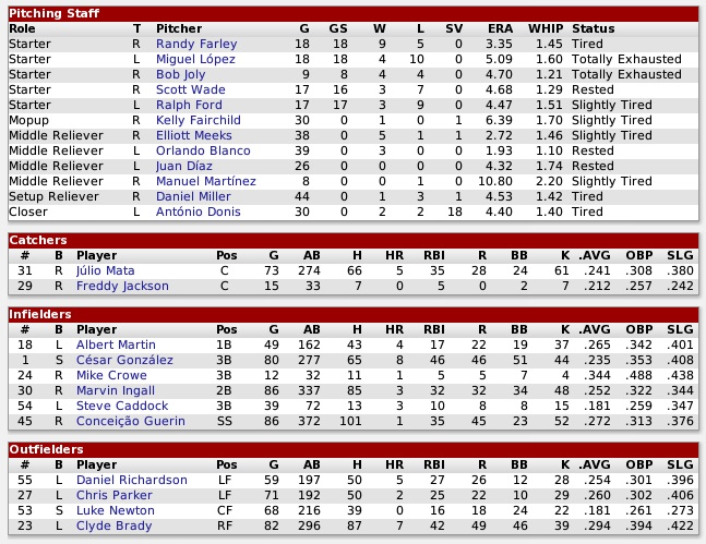 Raccoons (27-46) @ Knights (28-47) – June 26-28, 2000 Last place shootouts taking place in Georgia in late June, with the Knights besting only the Raccoons in runs allowed, but at least had an average offense, which scored the fifth-most runs in the Continental League. Projected matchups: Ralph Ford (2-8, 4.69 ERA) vs. John Collins (5-7, 5.16 ERA) Randy Farley (6-5, 3.50 ERA) vs. Larry Cutts (4-5, 4.46 ERA) Miguel Lopez (4-9, 5.78 ERA) vs. Tynan Howard (3-9, 5.24 ERA) Game 1 POR: SS Guerin – 2B Ingall – 1B Martin – RF Brady – C Mata – 3B Michel – LF Parker – CF Newton – P Ford ATL: CF Alonso – 2B Palacios – LF Ware – 1B Tinker – RF W. Taylor – 3B J. Morales – C McDonald – SS Pena – P J. Collins The Raccoons scored a run in the first, and Martin upped that with a monstrous 3-run home run in the third inning for a 4-0 lead. It looked pretty good, but then came the bottom 4th. Stephen Ware reached on an error by Newton, before Ford walked Bill Tinker and issued a wild pitch. Three straight hits later, the game was tied, and still no outs in the inning. Somehow, the Coons then wiggled out of that, and Mata brought in Brady in the fifth for a renewed lead. In the seventh, Clyde Brady had to leave the game after tweaking his knee, while Ford got stuck and was removed after a walk to Ware. Meeks got out of the inning, the Raccoons up 6-4, a lead they nursed into the bottom 9th, when we had little choice but to give the ball to Antonio Donis, but he got Pena, struck out Gerardo Rios, and Ingall made a nice play on Alonso. 6-4 Raccoons. Guerin 4-4, BB, 3B, RBI; Parker 2-4, BB, 2B; Crowe (PH) 1-1; Brady had a knee sprain, rendering him unavailable for the rest of the week, which was a problem for us with only four outfielders on the roster. He was not DL’ed. We were hoping for both Richardson and Reece becoming available by the weekend. Well, hope is peculiar thing. Game 2 POR: SS Guerin – 1B Martin – 2B Ingall – LF Gonzalez – RF Parker – C Mata – 3B Crowe – CF Newton – P Farley ATL: 2B Palacios – C J. Johnson – LF Ware – CF G. Rios – 3B J. Morales – RF Alonso – 1B Chapman – SS Pena – P Cutts The Raccoons got early power again in the middle game. After Farley fell 1-0 behind in the bottom 1st, struggling with his control, Newton doubled in a pair in the top 2nd to flip the score. In the third, the unlikely spark came in form of a 3-run homer by Cesar Gonzalez, his first in … possibly years. The Knights at 5-1 were not out of this however, and a Crowe error in the bottom 4th led to two unearned runs, doubled in by Bill Tinker. The Knights had their bullpen now in the game with Cutts removed, and Donald Sims loaded the bases with no outs in the top 5th. Parker and Mata singled home runs, and we got another one on a groundout this time, 8-3, and in the sixth, Gonzalez hit another home run, collecting Ingall, to make it 10-3! Offense?? What the heck was going on!? Farley covered 6.1 innings in 120 pitches, which was not exactly great length, but we were up by seven as Blanco came in to face left-handers, collecting five outs quickly. The Knights did not mount a counterattack. 11-3 Raccoons! Martin 2-6, 2B; Ingall 2-3, 2 BB; Gonzalez 2-3, 2 BB, 2 HR, 5 RBI; Parker 3-5, 2B, RBI; Newton 2-4, BB, 2B, 2 RBI; Caddock (PH) 1-1; Farley 6.1 IP, 5 H, 3 R, 1 ER, 2 BB, 6 K, W (7-5); Blanco 1.2 IP, 0 H, 0 R, 0 BB, 1 K; One day after getting on base five times, Conceicao Guerin struck out five times. (speechless) He ties an ABL record held by about two dozen other players. Will Taylor and Cristo Ramirez had also run up a disgraceful five strikeouts in a game this season. Samy Michel spent all night up after this game, vomiting intensely. He was out with a stomach virus, shortening our bench to three players. Game 3 POR: SS Guerin – 2B Ingall – 1B Martin – LF Gonzalez – C Mata – RF Parker – 3B Crowe – CF Newton – P Lopez ATL: CF Alonso – 2B Palacios – LF Ware – 1B Tinker – RF W. Taylor – 3B J. Morales – C J. Johnson – SS Pena – P Howard The Raccoons didn’t really carry their momentum into the game. Lopez misfielded a bunt in the third inning, not getting any out, and the Knights loaded the bags after that, plating two runs eventually. The Raccoons didn’t get anywhere until the fifth, when Mata hit a leadoff jack. The Coons got two more on, but a timely double play hit into by Crowe had them out of the inning quickly. Mata would be in the thick of it again in the seventh, when he hit a quite surprising triple and was driven in by Parker, tying the game. The Coons loaded them up including Lopez, who loaded the bases with a walk drawn off Howard as we did not hit for him – he was going quite well, with three hits allowed so far in this game. Ingall’s leadoff triple in the eighth gave us a prime chance to take the lead, and while Gonzalez was walked intentionally after Martin made the first out, Mata managed to score Ingall on an infield single. Lopez looked like he could at least pitch another inning, but in his efforts was derailed by a Guerin error in the bottom 8th that put the leadoff man Tony Pena on board, and the Knights brought him in to score and re-tie the score at three. Miller got us into extra innings and also pitched the tenth which was led off by Albert Matthews with an infield single(!!), but we got out of it. The top 11th was to be led off by Julio Mata, who was a double removed from the cycle and still facing Matthews, who had already 2.2 innings on the odometer. Matthews walked him. Mata would however score on a 2-out single by Newton, starting from second base against Chris Chapman’s poor arm in right field. Donis was thrown in for another save attempt, and it was a wild ride, with Alonso and Chapman on base, one out, and two drives to deep left, which Gonzalez somehow managed to intercept. 4-3 Furballs! Mata 3-4, BB, HR, 3B, 2 RBI; Parker 2-5, 2B, RBI; Lopez 8.0 IP, 3 H, 3 R, 2 ER, 0 BB, 