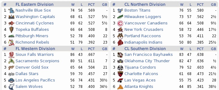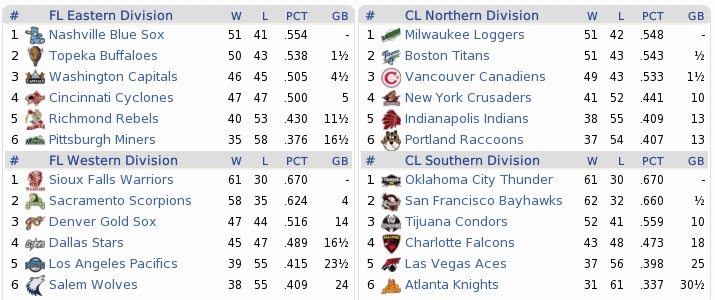 Despite their mediocre record, the Capitals were still in the running for a playoff spot, trailing the Blue Sox by only four games coming in. They had lost four games in a row, though. Their strengths were with offense, in which they ranked third in the Federal League, while their pitching at times would fall apart, giving them a -10 run differential, with the fifth-most runs allowed. Their bullpen was especially porous, ranking 10th in the FL. However, the Raccoons were considerable worse in every aspect… Projected matchups: Randy Farley (11-8, 3.45 ERA) vs. Vernon Robertson (10-6, 5.00 ERA) Ralph Ford (6-12, 4.34 ERA) vs. Chad Wright (7-6, 3.88 ERA) Miguel Lopez (5-12, 5.13 ERA) vs. Takeru Sato (9-9, 3.22 ERA) We know Robertson, but I am not sure whether we have played against the 26-year old right-hander Wright and the 27-year old southpaw Sato before. Game 1 WAS: SS J. Lopez – 3B R. Gonzalez – CF V. Sanchez – LF J. Rivera – RF Calzado – 1B C. Solís – C W. Turner – 2B McFarland – P Robertson POR: SS Guerin – 1B Martin – 3B Sharp – RF Brady – 2B Ingall – CF Parker – LF Richardson – C Jackson – P Farley The attendance got treated to a pitcher’s duel in the series opener. Robertson and Farley traded goose eggs through five innings, with Farley not even giving up a hit through six. The big question was whether Farley could get any support in his bid, and the answer would turn out to be affirmative, even if he didn’t get much to work with. However, Daniel Sharp put up a 1 for the Raccoons with a home run in the bottom 6th. Farley was back out for the seventh, got Ramiro Gonzalez, before Victorino Sanchez grounded to the right side, far to Ingall’s left. Ingall launched after it, barely got a glove at it, scrambled up and – didn’t make a throw. Sanchez was safe already. Solís singled to start the eighth, but Turner – always the killer when it came to offense – hit into a double play. Robertson went eight, whiffing nine, and Farley went back out for the ninth (remember how good our closer is) on 99 pitches and facing PH Tony Diaz to start the frame. Farley got to 1-2, then had one get away and hit Diaz. Tying run on base, we began to sweat. Jose Lopez came up and hit a hard shot to short, bouncing once as it hit the warning track. Guerin refused to be eaten up by hit, smothered it, lobbed to Ingall, and they turned the double play. That left Ramiro Gonzalez to bother about, and he grounded out to Guerin as well. 1-0 Coons! Sharp 1-4, HR, RBI; Ingall 2-3; Farley 9.0 IP, 2 H, 0 R, 1 BB, 8 K, W (12-8) and 1-3; RANDY!!!! I LOVE THIS KID!! After his fifth career shutout and tenth complete game in 88 starts, Randy also reaches 12 on the year, and is one win away from his career best (13-13 in 1999). Also: DANIEL SHARP!! We gave Paco Martinez the callup. He had started the same day, pitching seven innings of 2-run ball in a 5-2 win for St. Pete. Game 2 WAS: 2B T. Diaz – 3B R. Gonzalez – CF V. Sanchez – SS J. Lopez – LF J. Rivera – 1B C. Solís – RF McFarland – C W. Turner – P Wright POR: SS Guerin – 3B Sharp – 1B Martin – RF Brady – LF Parker – 2B Ingall – C Mata – CF Kent – P Ford The Raccoons scored three runs in the first inning when Wright looked like he wouldn’t go very deep, but then settled into a groove quickly. Ford went the other way, not allowing a hit through to the third, but then quickly coming apart with control issues. The Capitals drew four walks off him in five innings, and tied the game in the fifth. Ford struck out six in six innings, but could not get back in line for a W, and needed 117 pitches for six frames. The Coons were locked out of the game by Wright entirely after the first inning. While Blanco and Reyes pitched scoreless innings, Donis fell to a leadoff double by Tony Diaz in the ninth. Diaz came around to score, while Jesus Longoria replaced Wright. He walked Martin to start the bottom 9th, who was run for by Newton. Brady and Parker both made outs, moving Newton to third. Now we needed an Ingall single, but we got a pop to shallow right that Vonne Calzado caught leisurely. 4-3 Capitals. Martin 2-3, BB; Sigh. Would have been nice to pick up an actual hit at some point in the ninth. The last of our five singles came in the third inning. Game 3 WAS: 2B T. Diaz – 3B R. Gonzalez – CF V. Sanchez – SS J. Lopez – LF J. Rivera – 1B C. Solís – RF McFarland – C J. Rivera – P Sato POR: SS Guerin – 1B Martin – 3B Sharp – RF Brady – 2B Ingall – CF Parker – C Mata – LF Richardson – P M. Lopez Another game in which the music started to play mostly on the silent keys – neither team got a hit until Guerin’s 2-out single in the bottom 3rd that led to nothing at all. The Capitals had two hits in the fourth, didn’t score, and the Coons lined up three singles in the bottom 4th to go up 1-0 before Lopez flew out to leave the bases loaded. But Sato began to lose it. The Coons loaded the bags once more in the fifth, and then Parker drew a 2-out walk in a full count to push home Guerin with a run, and Mata singled home a pair on a grounder that Lopez missed by fractions of an inch. The Capitals didn’t know how to break up Lopez, not even when Guerin made a critical error in the sixth that put a runner on third. Bottom 7th, Pancho Padilla appeared in relief for the Capitals, and loaded the bases quickly with walks to Brady and Parker and sandwiched between those a toss into Ingall’s thigh. Padilla would not retire anybody as the game got out of hand for the Capitals: Mata singled home another pair, 6-0, and then Richardson hit an RBI single, which prompted an appearance from Alonso Villegas. When the Capitals actually did get to Lopez he was smashed into pieces instantly: four hard hits in the top 8th knocked him from the game. Nordahl allowed a runner left on by Lopez to score, and the Capitals got back within slam range. Having just blown a huge lead a few days earl