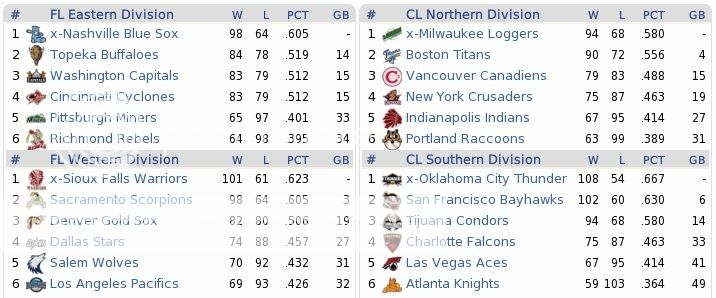 • For the second time, three ABL teams finished the season with 100 wins or more. The only other time this happened was in 1988, when the Stars, Blue Sox, and Indians all won 100 or more. Also, for the first time a team with 100 wins or more misses the postseason. • Previous teams to win 100 games or more (* indicates champions, # indicates missed postseason): 113-49 (1991 WAS*) 108-54 (1996 POR, 2000 SFW) 107-55 (1986 DAL) 106-56 (1979 CIN, 1990 WAS*, 2000 OCT) 105-57 (1988 DAL*) 104-58 (1988 NAS) 102-60 (1986 VAN, 1989 NAS, 2000 SFB#) 101-61 (1978 SFW*, 1982 CHA, 1985 DEN*, 1996 SAC) 100-62 (1978 NYC, 1985 VAN, 1988 IND, 1993 TIJ, 1993 WAS) So far, 100-win teams have won the championship at a 25% clip. Given that no 100-win team has ever missed the playoffs before, winning 100 wins in the regular season means squid in October, apparently. The 2000 playoffs feature three former world championship teams, including the twice successful Blue Sox, who could tie their division rivals, the Capitals for the most titles among all ABL franchises. They will have to beat the Warriors first, though. The 98-64 Blue Sox played mostly OBP ball, hitting only 88 home runs and instead slowly squished their enemies by constriction. Their lineup is dense, although they also have sluggers available in veteran Preston O’Day (.316, 23 HR, 109 RBI), who is 36 and has never won a title, and Pedro Edralín (.299, 14 HR, 82 RBI) and Cesar Gonzalez (.237, 16 HR, 75 RBI), who was acquired from the Raccoons mid-season. They will miss one of the best two or three centerfielders in the game, John Hensley (.267, 15 HR, 88 RBI), who sprained his ankle and will not be able to play in October. Their rotation is solid, but lacks a #1 shutdown guy. They might well be described as having four #2 pitchers. Their bullpen was sturdy, and was especially untouchable in September, with closer Jorge Escobar running a 0.59 ERA, Francisco Rodriguez an 0.53 ERA, and Steven Anderson a 0.55 ERA in the last few weeks. Of note is their ability to draw the most walks in the Federal League, but at the same time walking the least opposing batters. Throughout the bank, the 101-61 Warriors posted the more impressive numbers in 2000, beating the Blue Sox at their own OBP game, ranking first in that category, and fielding the best pitching staff in the Federal League, ranking outside the top 3 only in strikeouts. The offense also helped mask some slight issues with their rotation, or rather made them look better than they really were. 19-6 Lucio Munoz, 16-11 Pat Cherry, 15-7 Johnny Collins, and 16-8 Blair Taylor all won 15 or more games, but only the first two posted ERA’s better than four. One interesting quirk about their lineup is that one of their best power hitters, Luis Arroyo (.274, 15 HR, 75 RBI), is out with a torn labrum, and now the top 2 home run hitters on the club are their two catchers: David Vinson (.226, 15 HR, 65 RBI) and Ruben Melendez (.283, 12 HR, 46 RBI), with Vinson getting the nod in most games, strangely. Infielders Jaime Mateo and Ramón Garza both got on base at roughly a .400 clip, but nobody came close to Hjalmar Flygt. The veteran will turn 38 during the FLCS, and has put down a .354/.455/.457 slash line with 4 HR and 61 RBI this year, posting the top OBP mark for the seventh time in his career, and the fourth year in a row. The back end of their bullpen is almost as impressive as the Blue Sox’ with William Henderson saving 40 games during the season. All in all, the Warriors have an edge in most categories, but it is not a big edge, and this series could easily go either way. In the Continental League, the 94-68 Loggers won a weakish Northern Division with repeat triple crown winner Martin Garcia (23-9, 2.28 ERA) rowing the boat out there. While they have an impressive bullpen, which ranked first in the CL, the rest of their rotation besides Garcia is actually porous, with none of the guys besting even a 4.50 ERA! They survived merely on offense, but were quite impressive in that regard, with Leon Ramirez, Bartolo Hernandez, Cristo Ramirez, Jerry Fletcher, and Bakile Hiwalani (who hit 23 HR and drove in 137 runs) all batting over .300 during the year. They ranked first or second in most categories offensively, and not worse than sixth in any. However, they are a much, much better team against left-handed pitching, with the preferred lineup holding only one left-handed bat (Cristo Ramirez). While they have no significant injuries besides SP Davis Sims, who missed most of the season, they were basically a one-trick pony. The 108-54 Thunder, with home field advantage throughout the playoffs, sport two right-handers in Aaron Anderson (22-9, 2.80 ERA) and Vaughn Higgins (15-9, 3.16 ERA), who might be tough nuts to crack for the Loggers offense, while they might have trouble with keeping southpaws Lou Corbett (17-8, 3.69 ERA) and Fabien Armand (14-11, 4.31 ERA) in the game. Their bullpen lacked reliable options besides Javier Navarro (0.79 WHIP) and closer Jimmy Morey (6-2, 1.73 ERA, 43 SV). Overall however, this combo still produced the lowest team ERA in the Continental League. The offensive department of the Thunder was built all around slugging, with six guys hitting 15 home runs or more, and Sonny Reece and Takahashi Higashi leading the team with 21 each. Reece also drove in 117, and comes in with his share of playoff fame already under his belt, as he drilled the Thunder to the world championship with not one, but TWO game 7 walkoff home runs in 1994. They ranked first in most batting categories except runs scored (2nd), walks (3rd), and extra-base hits (4th), but they really can’t steal bases, mustering only 43 bags all season long. Despite that, they can build a well balanced lineup, platoon against either variation of pitcher, and are generally assumed to finish the Loggers in six games or less (probably less). 2000 CHAMPIONSHIP SERIES Blue Sox @ Warriors … 3-1 … (Blue Sox lead 1-0) … NAS SP De