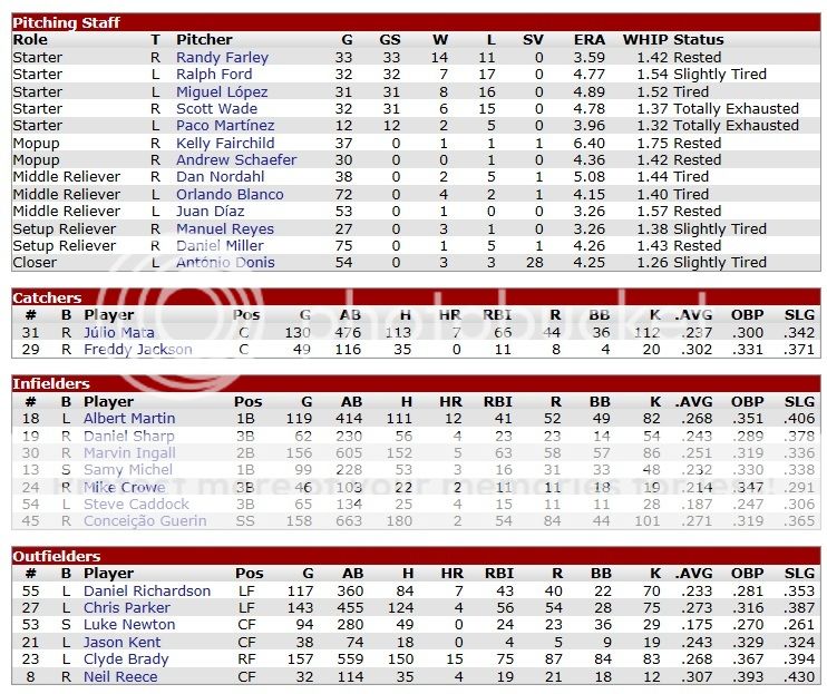 SP Randy Farley, 27, B:R, T:R (14-11, 3.59 ERA | 39-30, 3.16 ERA) – sometimes struggled in his third season in the Bigs, but he has nevertheless been very consistent and managed to raise his strikeouts slightly compared to earlier. Mixes pitches well and also keeps the ball on the ground. SP Carl Bean *, 27, B:R, T:R (20-12, 3.21 ERA | 45-45, 3.93 ERA) – acquired from the Gold Sox for Antonio Donis, Samy Michel, and Paco Martinez, Bean has very good stuff and whiffed 386 batters over the last two seasons, and a high-K hurler is something that the Raccoons haven’t had in a very long time. SP Ralph Ford, 23, B:L, T:L (7-17, 4.77 ERA | 9-19, 4.65 ERA) – his first full season in the majors was more than just rough, with 102 walks the most glaring issue in the 183 innings he delivered. If he cuts down on those, his stuff would certainly be sufficient to become a frontline starter. SP Cipriano Miranda *, 30, B:R, T:R (13-13, 4.29 ERA | 50-72, 4.40 ERA) – traded for the with the Crusaders (for Mike Collins and a prospect), Miranda won’t get the park onto its feet in excitement, but should to a sufficiently good job in the middle of the rotation for a team that tries to get out of last place. SP Miguel Lopez, 32, B:S, T:L (8-16, 4.89 ERA | 77-65, 3.60 ERA) – ravaged by injuries, Lopez was ineffective for the most part of the 2000 season, managing only 169 innings in 31 starts. Several serious injuries have very much ruined a very promising career. SS/MU Scott Wade, 38, B:R, T:R (6-15, 4.78 ERA | 166-137, 3.58 ERA, 52 SV) – in a season where the entire pitching staff was in trouble, good old Scott was no exception. As he enters his 17th major league season, all with the Coons, Wade will be used in a swingman role, which might be the best role for an aged finesse pitcher: throw him at holes and make him stick. MR Elliott Meeks, 30, B:L, T:R (5-2, 2.93 ERA, 1 SV | 24-16, 3.51 ERA, 16 SV) – resigned after becoming a free agent, which in turn he became after missing the last one and a half months of his first season in Portland due to injury. He was mostly reliable when he pitched, although he also blew up a few times, like everybody on the staff. MR Marcos Bruno, 25, B:R, T:R (rookie) – first round pick in 1999, he started out at AA and climbed a level per year to make his debut on the Opening Day roster. Stuff is elite, but will he make efficient enough use of the zone and not just try to outblast batters? He throws in the high 90s routinely. MR Juan Diaz, 26, B:L, T:L (1-0, 3.26 ERA | 1-0, 3.26 ERA) – was called up mid-season and never went away despite never being very good, and despite walking more (29) than he struck out (21) in 47 innings of work. SU Orlando Blanco, 34, B:R, T:L (4-2, 4.15 ERA, 1 SV | 32-63, 4.78 ERA, 3 SV) – came apart late in the season, doubling his ERA in the last six weeks of the campaign, Blanco nevertheless was mostly a reliable part of the bullpen in 2000, and one of the few pieces we’d dare to say that about. SU Dan Nordahl, 22, B:R, T:R (2-5, 5.08 ERA, 1 SV | 4-6, 4.88 ERA, 1 SV) – top draft pick from 1997, and for years ranking second to only Jesus Christ in the “He is our Messiah” charts in Portland, this is the first time Nordahl starts the season on the big league team. His acquired pedigree does not warrant a setup role, but just look at the staff. He has the meanest stuff, with a filthy slider – he just can’t make it hit the zone, and the same is true for the 100mph fastball he harasses hitters with. CL Daniel Miller, 32, B:S, T:R (1-5, 4.26 ERA, 1 SV | 35-30, 3.25 ERA, 40 SV) – here we are again with our faithful Daniel Miller in the closer role. It has never worked out before, and we don’t expect it to work this time, either, but the options are limited, and why the heck do you think Nordahl is a setup man in the first place? Miller's cutter/slider combo is not made for the ninth inning, and he always more pitched to poor contact (Wade-esque, if you want). C/1B Julio Mata, 25, B:R, T:R (.237, 7 HR, 66 RBI | .260, 11 HR, 103 RBI) – the strong rookie impression of this first-rounder from ’97 evaporated in a puff of smoke last season. The first half was still quite good, but after the All Star Break he tailed off frighteningly. His biggest achievement was a refreshing 39% CS rate. C Mark Thomas *, 24, B:R, T:R (.261, 0 HR, 2 RBI | .297, 0 HR, 3 RBI) – acquired from the Wolves for Kelly Fairchild, Thomas has only 37 AB to his credit and will be a backup to Julio Mata. His good defensive abilities might even make him a late inning sub for Mata on a frequent basis. 1B Albert Martin, 24, B:L, T:L (.268, 12 HR, 41 RBI | .274, 17 HR, 53 RBI) – still projects to be an elite first baseman, although his first attempt on going a full season was quickly ended last year when he batted .125 in April. He returned all the stronger and we really think he can top 20 to 25 dingers in a full season. 2B Jesus Palacios *, 26, B:L, T:R (.288, 12 HR, 61 RBI | .286, 32 HR, 207 RBI) – came over from the Knights in the Marvin Ingall trade, along with Gabriel. He is a very good OBP guy, and will steal bases frequently if left unchecked. His weak arm limits him to the right side of the infield, but as such he doesn’t get into Concie’s way at least. SS Conceicao Guerin, 27, B:R, T:R (.271, 2 HR, 54 RBI | .282, 8 HR, 199 RBI) – regressed from his best season in 1999, when he hit .304 and made only four errors, but is still one of the best allrounder shortstops in the game, combining both a good OBP bat with excellent defense, which has been merited with the Gold Glove in 1999. 1B/3B Daniel Sharp, 23, B:R, T:R (.243, 4 HR, 23 RBI | .243, 4 HR, 23 RBI) – signed fourth overall in the 2000 amateur draft, Sharp made the majors within a month of signing, and while he debuted in a splash, he slumped badly during the tail end of the season and got to share time with Mike Crowe at times. This year, he is penciled in at third base firmly and be