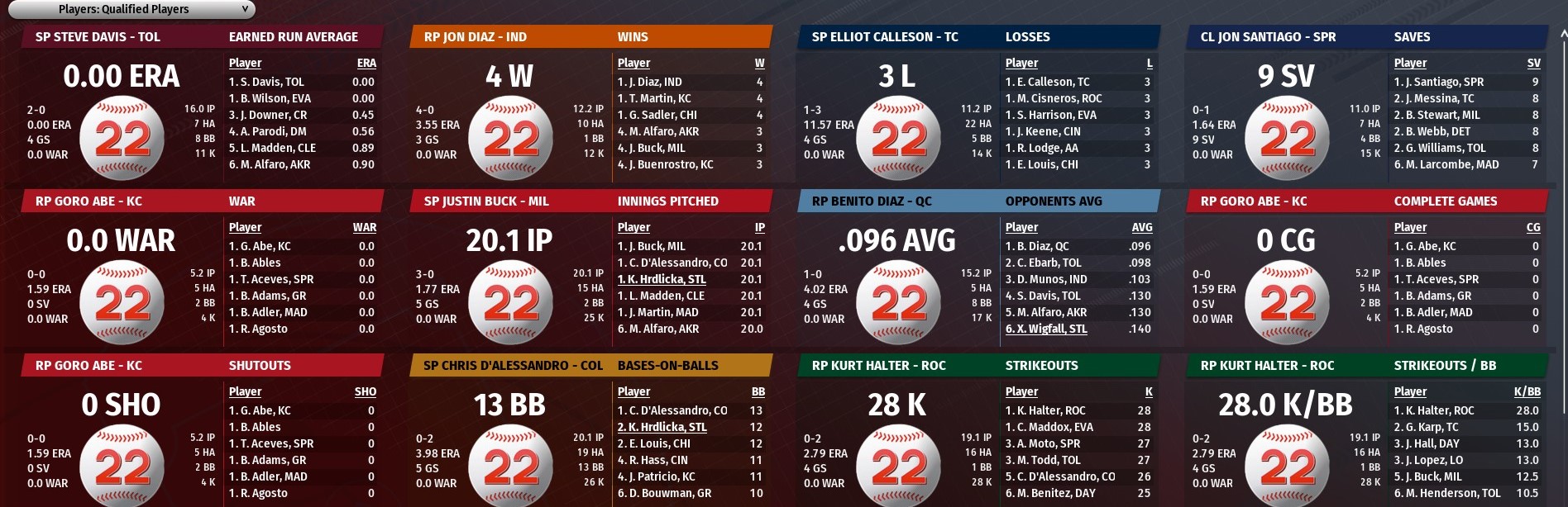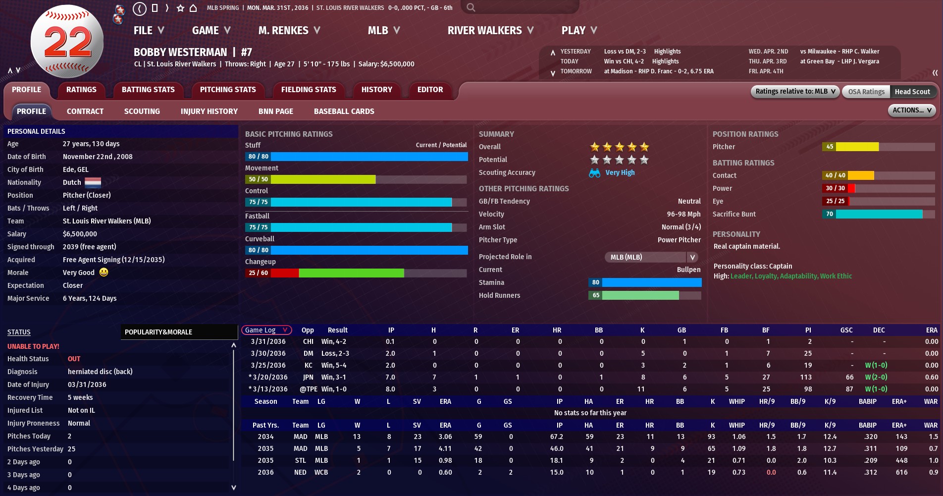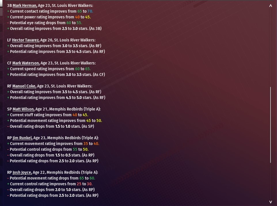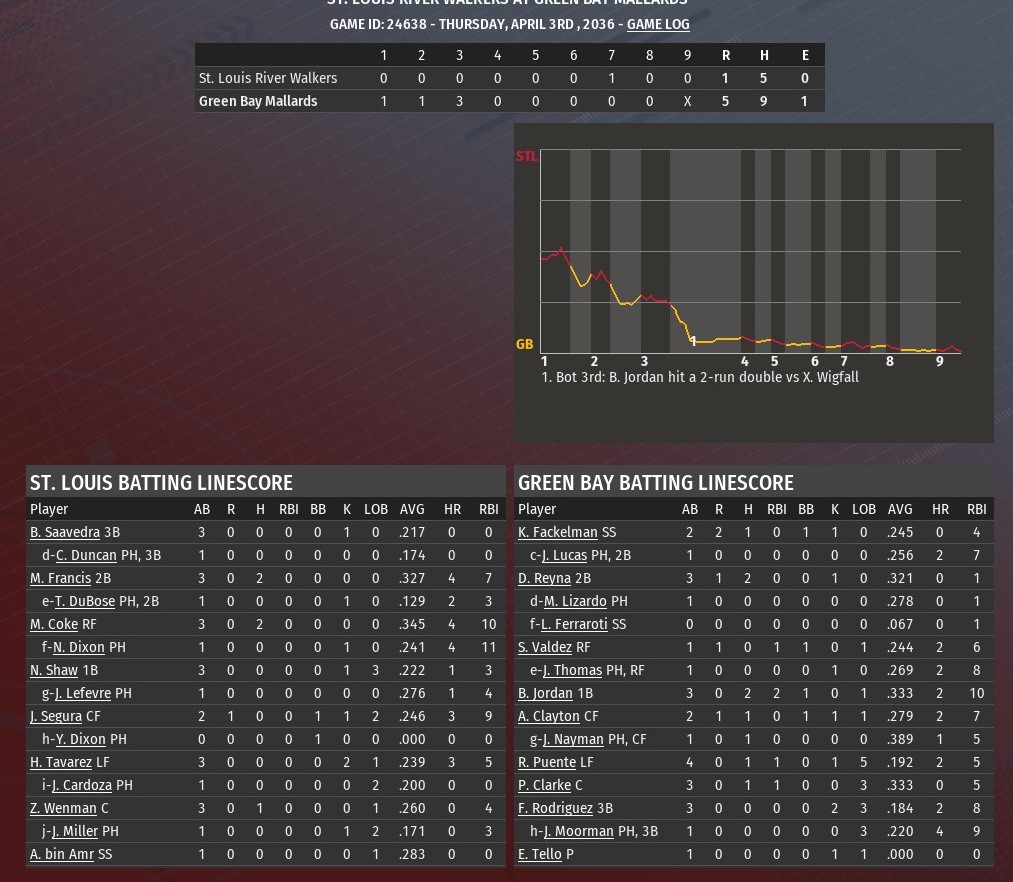 2036 prediction: 85-77, 3rd, 5 GB Cedar Rapids Manager/General Manager: Mike Renkes, 19th season, 1,613-1,304, .552 Pct., 7 playoff qualifiers; 5 World series qualifiers, World Series titles in 2018 and 2025. 2035 Award winners: NL Rookie of the Year: Bob Saavadera; NL Silver Slugger 1B: NL Nick Shaw; Gold Glove 1B: Nick Shaw. 2035 season summary: The River Walkers either held the lead or were right on the heels of the Cedar Rapids Grapplers through the first four months of the season. In fact, an incredible 20-3 run through the month of July had the Walkers sitting 7.5 games in front of the Grapplers with 57 games remaining. But as good as St. Louis was in July, it almost was as bad in August going 11-18 to fall 3.5-games behind Cedar Rapids. A 5-2 win at Chicago had the Walkers within a half-game of game of the Grapplers early in the month, but they would never catch them as Cedar Rapids’ advantage primarily fluctuated from three to six games the remainder of the season. While not making the postseason was a disappointment, the 89-73 finish was a big improvement on the sub-500 performances of the previous two years. Departures OF – Jose Ramirez, 32 – 141 G, .224 BA, 15 HRs, 61 RBIs; Unsigned free agent; Remains unsigned. 2B – Daniel Becerra, 35 – 102 G, .263 BA, 5 HRs, 26 RBIs; Unsigned free agent; Remains unsigned SS – Aaron Nixon, 34 -- 141 G, .248 BA, 5 HRs, 41 RBIs; Unsigned free agent; Remains unsigned LHP – Zachary Stella, 35-- 59 G, 4-1, 2 Svs., 4.07 ERA, 55.1 IP, 64 Ks; Unsigned free agent; Signed with Madison LHP – Oscar Martinez, 31 -- 45, 2-1, 0 Svs., 5.40 ERA, 46.2 IP, 47 Ks; Unsigned free agent; Signed with Madison Newcomers 2B – Marcos Francis, 31 – 156 G, .253 BA, 18 HRs, 76 RBIs, .743 OPS.; Signed from Rockford as free agent INF – Alfredo Gomez, 26 – 96 G, .184 BA, 5 HRs, 24 RBIs, .517 OPS; Trade with Louisville OF – Yan C. Dixon, 33 – 88 G, .276 BA, 8 HRs, 37 RBIs, .770 OPS; Minor league signing LHP – Armando Cintron, 33 – 6 G, 0-0, 2 SVs., 6.23 ERA, 4.1 IP, 8 Ks; Signed from Green Bay as free agent Starting rotation RHP -- Jesse McNaboe, 27 - 34 G, 17-5, 3.73 ERA, 207.1 IP, 149 Ks, 1.32 WHIP McNaboe occasionally has some ugly innings, but he has more outings where he is one of the best pitchers in the game. He almost always throws a ton of innings – his 207.1 in 2035 topped the league – and he owns a career mark of 70-40 since making the jump to the majors in 2029. RHP -- Jake McDonald, 29 - 33 G/32 GS, 15-12, 3.39 ERA, 202.0 IP, 179 Ks, 1.27 WHIP Acquired from Ann Arbor prior to the 2035 season, McDonald put together one of the best campaigns of any pitcher in the NL. He topped 200 innings, with 202.0, for the third straight year. He also led all starters with a 6.0 WAR. LHP -- Shane Drogo, 30 - - 32 G, 9-13, 4.22 ERA, 185.1 IP, 150 Ks, 1.32 WHIP Although he had a better campaign than his initial season in St. Louis, when he went 3-10 with a 6.47 ERA, Drogo again had his share of struggles in 2035. He did more than double his innings total – going from 89 to 185.1 –and saw his WHIP drop from 1.74 to 1.32. RHP – Xavier Wigfall, 27 – 9 G, 1-4, 6.80 ERA, 45.0 IP, 42 Ks, 1.49 WHIP Wigfall did not take the mound until July because of off-season Tommy John surgery. And when he joined the Walkers rotation in July, he was not good at all. He did pitch better in spring training. Hoping his struggles were due to the injury layoff, St. Louis still hopes Wigfall can become a top of the rotation starter. RHP – Edward Kunselman, 32 – 32 G/31 GS, 12-8, 4.09 ERA, 178.1 IP, 138 Ks, 1.21 WHIP Acquired in a trade with Toledo before the 2035 season, Kunselman proved better than expected for pitcher who was just in his second season as a full-time major league starter. He ate up innings (178.1) and was good enough to turn in 15 quality starts. Relief pitchers RHP – Nick Strother, 31 – 55 G, 4-2, 18 Svs., 3.19 ERA, 53.2 IP, 70 Ks, 1.23 WHIP Acquired before the 2034 season from Toledo to be the team’s closer, Strother held down that role until the Walkers traded for Bobby Westerman in late July. Strother converted 18 of 22 save opportunities. He will open the 2036 season as the closer, with Westerman opening the season in the injured list because of a back injury. RHP – Scott Rissler, 30 – 78 G, 7-4, 1 Sv., 3.13 ERA, 77.2 IP, 86 Ks, 1.29 WHIP In his third season with the Walkers, Rissler pitched in a career-high 78 games in 2035. While his number across the board saw a slight uptick, the 30-year-old remains a reliable arm out of the bullpen. RHP – Chris Eason, 28 -- 12 G, 0-1, 0 Svs., 7.11 ERA, 12.2 IP, 12 Ks, 1.58 WHIP Due to injuries Eason will get the chance to start the season in the majors. He received a couple of callups in 2035, and did not fare well. If Eason struggles this time, he could be out of chances. RHP – Ryan Marzella, 30 – 39 G/12 Gs, 9-6, 17 Svs., 2.57 ERA, 108.2 IP, 118 Ks, 0.92 WHIP – All games at AAA Memphis Like Eason, Marzella will get the chance to pitch in the majors. If he struggles, this could be his last opportunity. Marzella did have a good season at AAA Memphis in 2035, serving both as a starter and the closer for the PCL champion Redbirds. LHP – Armando Cintron, 33 – 6 G, 0-0, 2 Svs., 6.23 ERA, 4.1 IP, 8 Ks, 2.31 WHIP Signed as a free agent after spending last season in Green Bay, Cintron missed almost all of the 2035 campaign with a torn labrum. Cintron, who has been in the majors since 2027, owns a career record of 28-33 with 206 saves and a 2.61 ERA in 403 games. LHP – Nick Ruffalo, 28 – 60 G, 3-1, 4 Svs., 3.00 ERA, 60.0 IP, 75 Ks, 1.18 WHIP Ruffalo continued to provide a solid left-handed arm out of the bullpen for St. Louis in 2035. His WHIP (1.18) was the highest of his career, still it was among the lowest for left-handers. LHP – Greg Sones, 27 – 56 G, 7-1 4 Svs., 3.69 ERA, 46.1 IP, 59 Ks, 1.25 WHIP Sones first full-season in the majors was an impressive one going 7-1 with f