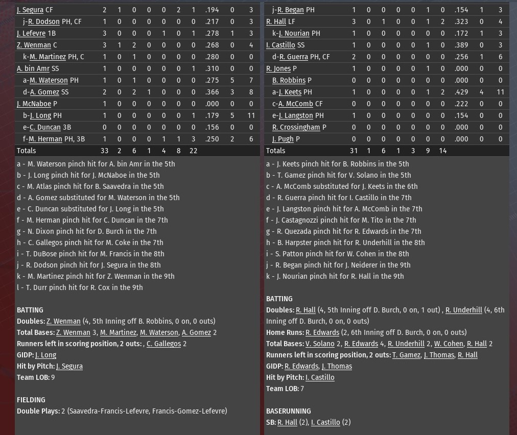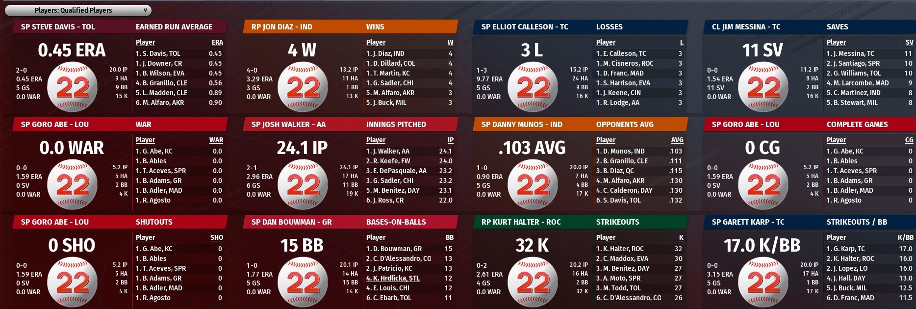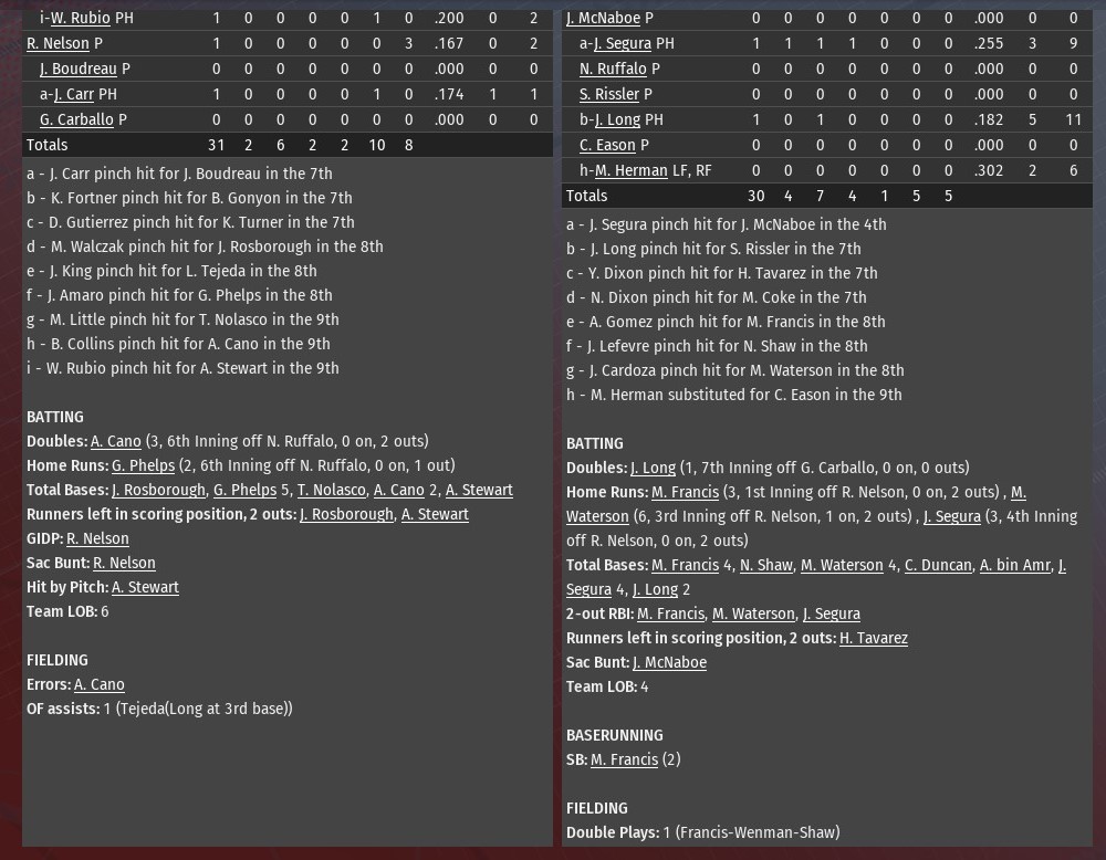 2036 prediction: 85-77, 3rd, 5 GB Cedar Rapids Manager/General Manager: Mike Renkes, 19th season, 1,613-1,304, .552 Pct., 7 playoff qualifiers; 5 World series qualifiers, World Series titles in 2018 and 2025. 2035 Award winners: NL Rookie of the Year: Bob Saavadera; NL Silver Slugger 1B: NL Nick Shaw; Gold Glove 1B: Nick Shaw. 2035 season summary: The River Walkers either held the lead or were right on the heels of the Cedar Rapids Grapplers through the first four months of the season. In fact, an incredible 20-3 run through the month of July had the Walkers sitting 7.5 games in front of the Grapplers with 57 games remaining. But as good as St. Louis was in July, it almost was as bad in August going 11-18 to fall 3.5-games behind Cedar Rapids. A 5-2 win at Chicago had the Walkers within a half-game of game of the Grapplers early in the month, but they would never catch them as Cedar Rapids’ advantage primarily fluctuated from three to six games the remainder of the season. While not making the postseason was a disappointment, the 89-73 finish was a big improvement on the sub-500 performances of the previous two years. Departures OF – Jose Ramirez, 32 – 141 G, .224 BA, 15 HRs, 61 RBIs; Unsigned free agent; Remains unsigned. 2B – Daniel Becerra, 35 – 102 G, .263 BA, 5 HRs, 26 RBIs; Unsigned free agent; Remains unsigned SS – Aaron Nixon, 34 -- 141 G, .248 BA, 5 HRs, 41 RBIs; Unsigned free agent; Remains unsigned LHP – Zachary Stella, 35-- 59 G, 4-1, 2 Svs., 4.07 ERA, 55.1 IP, 64 Ks; Unsigned free agent; Signed with Madison LHP – Oscar Martinez, 31 -- 45, 2-1, 0 Svs., 5.40 ERA, 46.2 IP, 47 Ks; Unsigned free agent; Signed with Madison Newcomers 2B – Marcos Francis, 31 – 156 G, .253 BA, 18 HRs, 76 RBIs, .743 OPS.; Signed from Rockford as free agent INF – Alfredo Gomez, 26 – 96 G, .184 BA, 5 HRs, 24 RBIs, .517 OPS; Trade with Louisville OF – Yan C. Dixon, 33 – 88 G, .276 BA, 8 HRs, 37 RBIs, .770 OPS; Minor league signing LHP – Armando Cintron, 33 – 6 G, 0-0, 2 SVs., 6.23 ERA, 4.1 IP, 8 Ks; Signed from Green Bay as free agent Starting rotation RHP -- Jesse McNaboe, 27 - 34 G, 17-5, 3.73 ERA, 207.1 IP, 149 Ks, 1.32 WHIP McNaboe occasionally has some ugly innings, but he has more outings where he is one of the best pitchers in the game. He almost always throws a ton of innings – his 207.1 in 2035 topped the league – and he owns a career mark of 70-40 since making the jump to the majors in 2029. RHP -- Jake McDonald, 29 - 33 G/32 GS, 15-12, 3.39 ERA, 202.0 IP, 179 Ks, 1.27 WHIP Acquired from Ann Arbor prior to the 2035 season, McDonald put together one of the best campaigns of any pitcher in the NL. He topped 200 innings, with 202.0, for the third straight year. He also led all starters with a 6.0 WAR. LHP -- Shane Drogo, 30 - - 32 G, 9-13, 4.22 ERA, 185.1 IP, 150 Ks, 1.32 WHIP Although he had a better campaign than his initial season in St. Louis, when he went 3-10 with a 6.47 ERA, Drogo again had his share of struggles in 2035. He did more than double his innings total – going from 89 to 185.1 –and saw his WHIP drop from 1.74 to 1.32. RHP – Xavier Wigfall, 27 – 9 G, 1-4, 6.80 ERA, 45.0 IP, 42 Ks, 1.49 WHIP Wigfall did not take the mound until July because of off-season Tommy John surgery. And when he joined the Walkers rotation in July, he was not good at all. He did pitch better in spring training. Hoping his struggles were due to the injury layoff, St. Louis still hopes Wigfall can become a top of the rotation starter. RHP – Edward Kunselman, 32 – 32 G/31 GS, 12-8, 4.09 ERA, 178.1 IP, 138 Ks, 1.21 WHIP Acquired in a trade with Toledo before the 2035 season, Kunselman proved better than expected for pitcher who was just in his second season as a full-time major league starter. He ate up innings (178.1) and was good enough to turn in 15 quality starts. Relief pitchers RHP – Nick Strother, 31 – 55 G, 4-2, 18 Svs., 3.19 ERA, 53.2 IP, 70 Ks, 1.23 WHIP Acquired before the 2034 season from Toledo to be the team’s closer, Strother held down that role until the Walkers traded for Bobby Westerman in late July. Strother converted 18 of 22 save opportunities. He will open the 2036 season as the closer, with Westerman opening the season in the injured list because of a back injury. RHP – Scott Rissler, 30 – 78 G, 7-4, 1 Sv., 3.13 ERA, 77.2 IP, 86 Ks, 1.29 WHIP In his third season with the Walkers, Rissler pitched in a career-high 78 games in 2035. While his number across the board saw a slight uptick, the 30-year-old remains a reliable arm out of the bullpen. RHP – Chris Eason, 28 -- 12 G, 0-1, 0 Svs., 7.11 ERA, 12.2 IP, 12 Ks, 1.58 WHIP Due to injuries Eason will get the chance to start the season in the majors. He received a couple of callups in 2035, and did not fare well. If Eason struggles this time, he could be out of chances. RHP – Ryan Marzella, 30 – 39 G/12 Gs, 9-6, 17 Svs., 2.57 ERA, 108.2 IP, 118 Ks, 0.92 WHIP – All games at AAA Memphis Like Eason, Marzella will get the chance to pitch in the majors. If he struggles, this could be his last opportunity. Marzella did have a good season at AAA Memphis in 2035, serving both as a starter and the closer for the PCL champion Redbirds. LHP – Armando Cintron, 33 – 6 G, 0-0, 2 Svs., 6.23 ERA, 4.1 IP, 8 Ks, 2.31 WHIP Signed as a free agent after spending last season in Green Bay, Cintron missed almost all of the 2035 campaign with a torn labrum. Cintron, who has been in the majors since 2027, owns a career record of 28-33 with 206 saves and a 2.61 ERA in 403 games. LHP – Nick Ruffalo, 28 – 60 G, 3-1, 4 Svs., 3.00 ERA, 60.0 IP, 75 Ks, 1.18 WHIP Ruffalo continued to provide a solid left-handed arm out of the bullpen for St. Louis in 2035. His WHIP (1.18) was the highest of his career, still it was among the lowest for left-handers. LHP – Greg Sones, 27 – 56 G, 7-1 4 Svs., 3.69 ERA, 46.1 IP, 59 Ks, 1.25 WHIP Sones first full-season in the majors was an impressive one going 7-1 with f