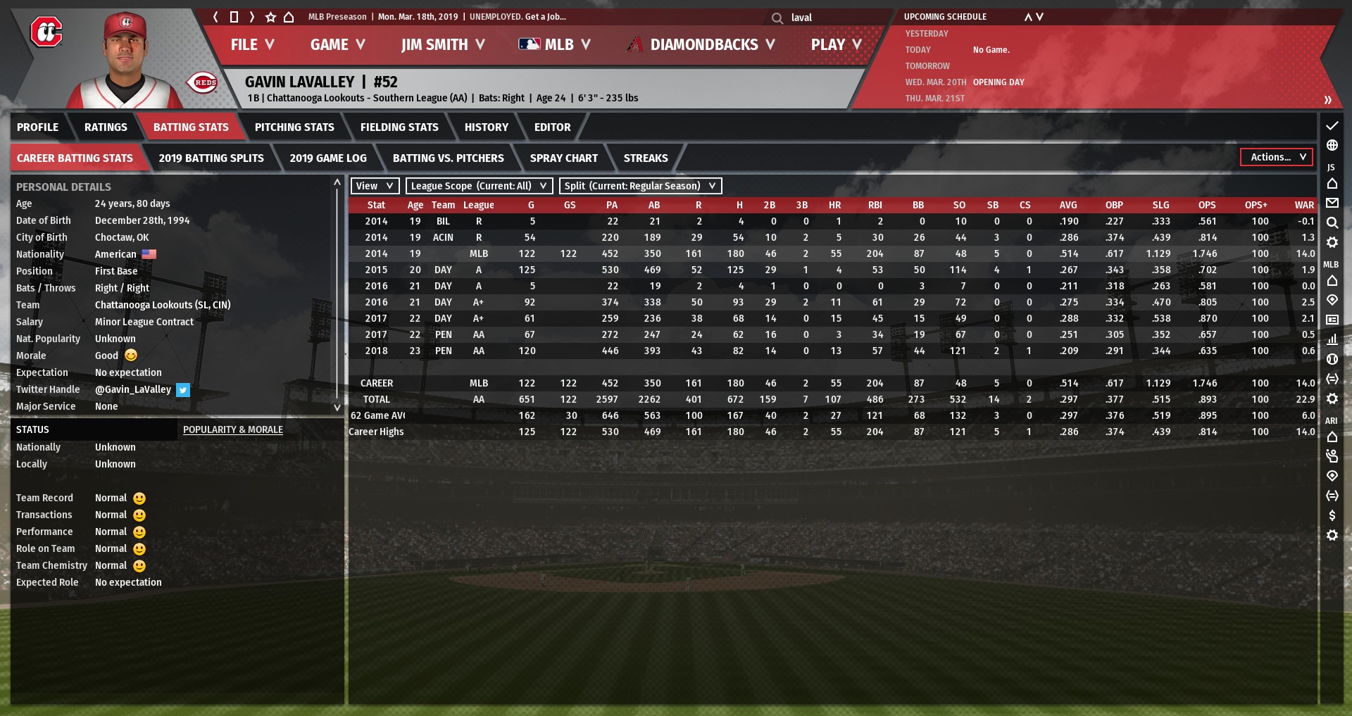 Not sure if this is the place to post, or roster set issues as this is from a default MLB game, but Gavin Lavalley has some ludicrous stats for 2014 considering he's never seen the majors. I think these are his high school stats, but they are treated as if they were MLB when they are exported.
