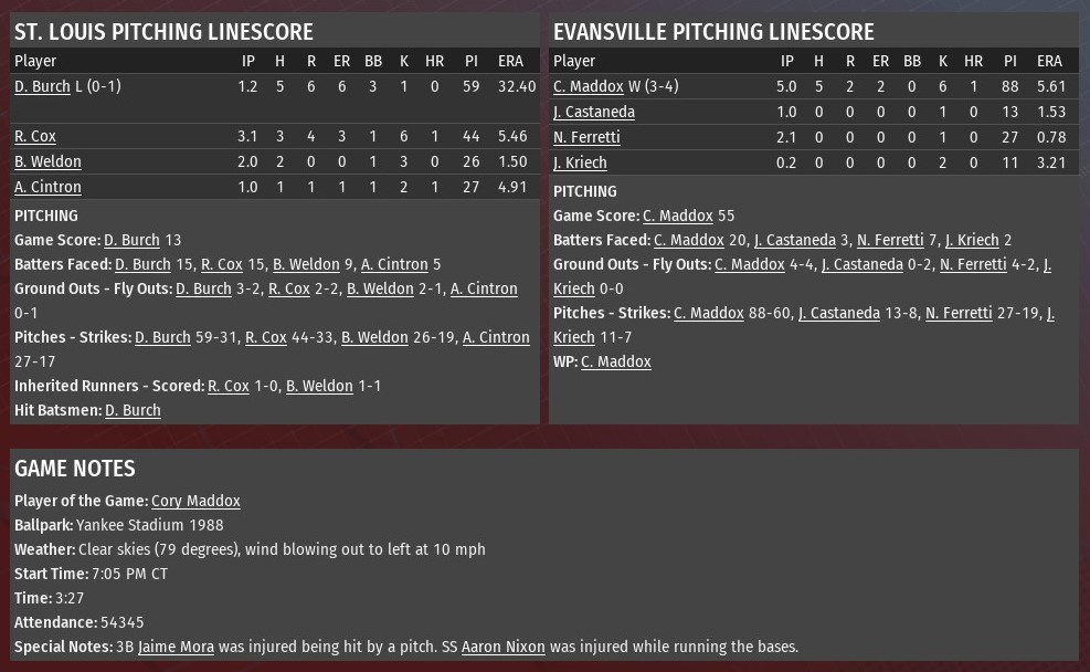 Evansville hammered St. Louis rookie starter Danny Burch for six runs in the bottom of the second inning, and the Bosses went on to rout the River Walkers 11-2 at Yankee Stadium (1988). Making a spot start for a tired Shane Drogo, Burch got in trouble in the first inning as Evansville loaded the base but failed to score. However, he didn't survive the second as the Bosses pounded out six runs on just three hits, but were helped by two walks, a hit by pitch and a passed ball by Jackson Miller. Chris McFadden and Ramon Montes both drew walks to open the inning. Jaime Mora later was hit by a pitch with one out to load the bases. Chris Shelley drove in the inning's first run with a single. Luke Leto later plated a pair with another single. Shelley scored on Miller's passed ball. Aaron Nixon handled the rest with a two-run double. The Walkers did climb back to within 6-2 with single runs in the fourth and fifth. But the Bosses broke it back open in the bottom of the sixth, when Justin Slayton hit a three-run homer off Ron Cox. A Jeff Waldron homer in the eighth off Alex Cintron accounted for the game's final run. Bosses starter Cory Maddox lasted five innings, allowing two runs on five hits. He struck out six and didn't walk a batter. Joe Castaneda (1.0 IP), Nick Feretti (2.1) and Jeremy Kriech (0.2) combined to shut out St. Louis the rest of the way. |